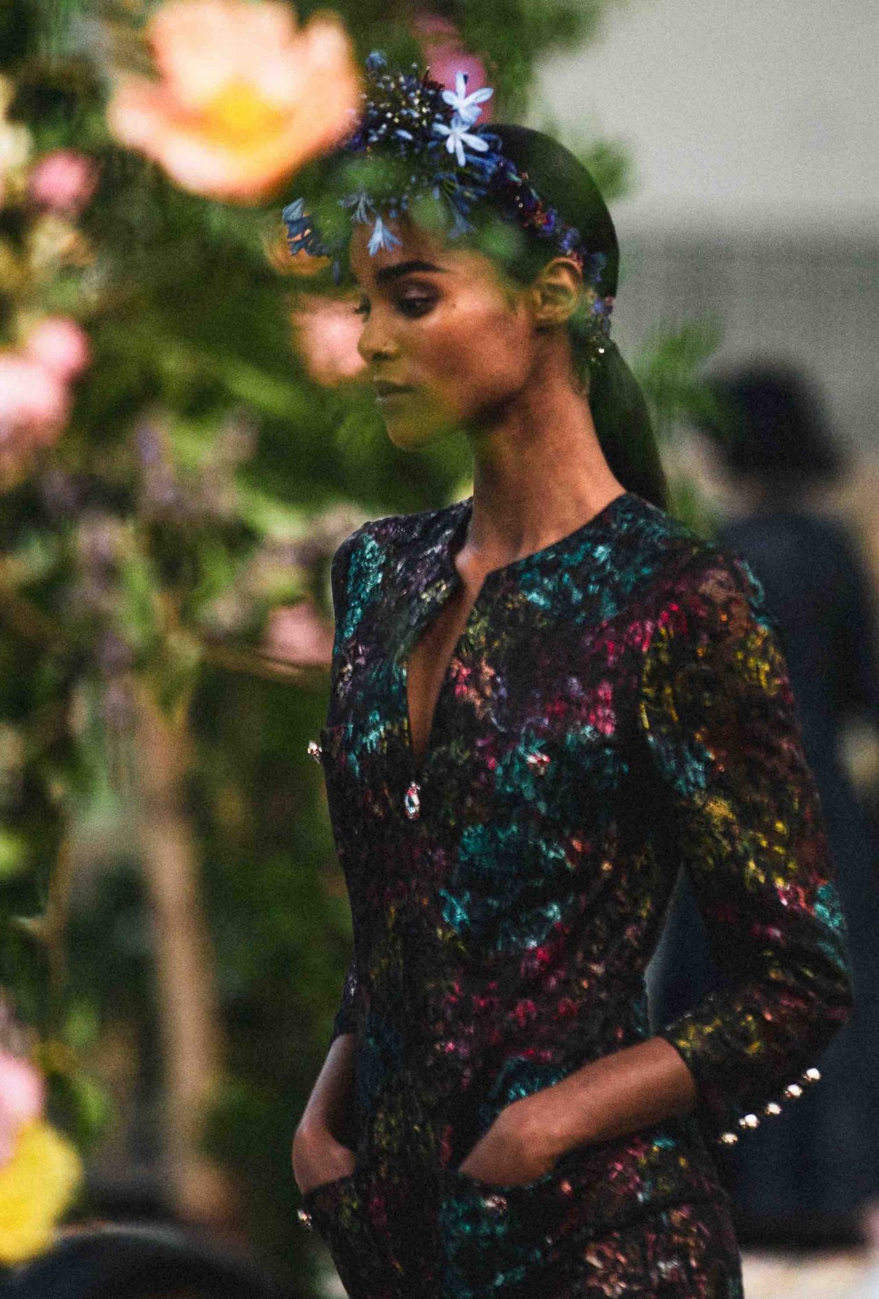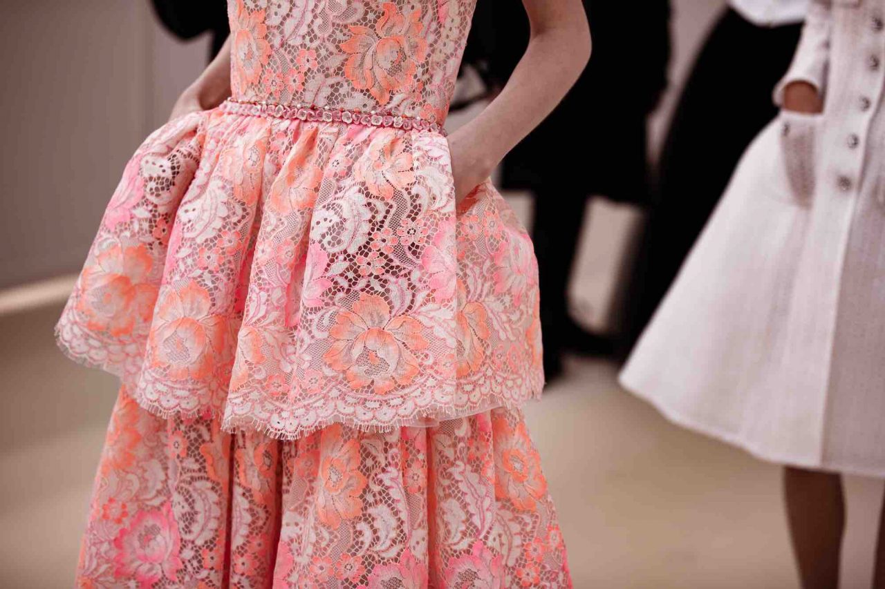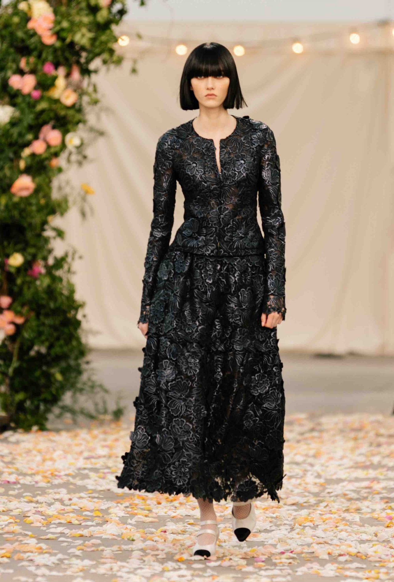 クチュールコレクションだけあって、CHANEL のパートナーであるメゾンダールの卓越した職人技が集結。アトリエ モンテックスは、パール グレーのチュールで作られたロングドレスにマクラメ刺繍を施し、オーガンザのフリルがあしらわれたツイードのリトル ブラック ドレスには、ルマリエが手掛けた繊細な羽根飾りが。
