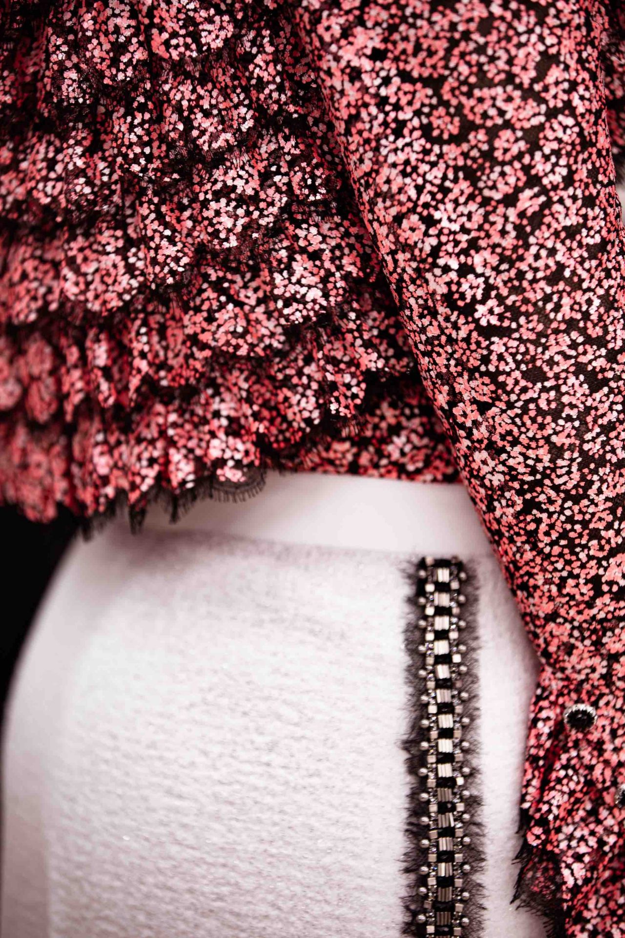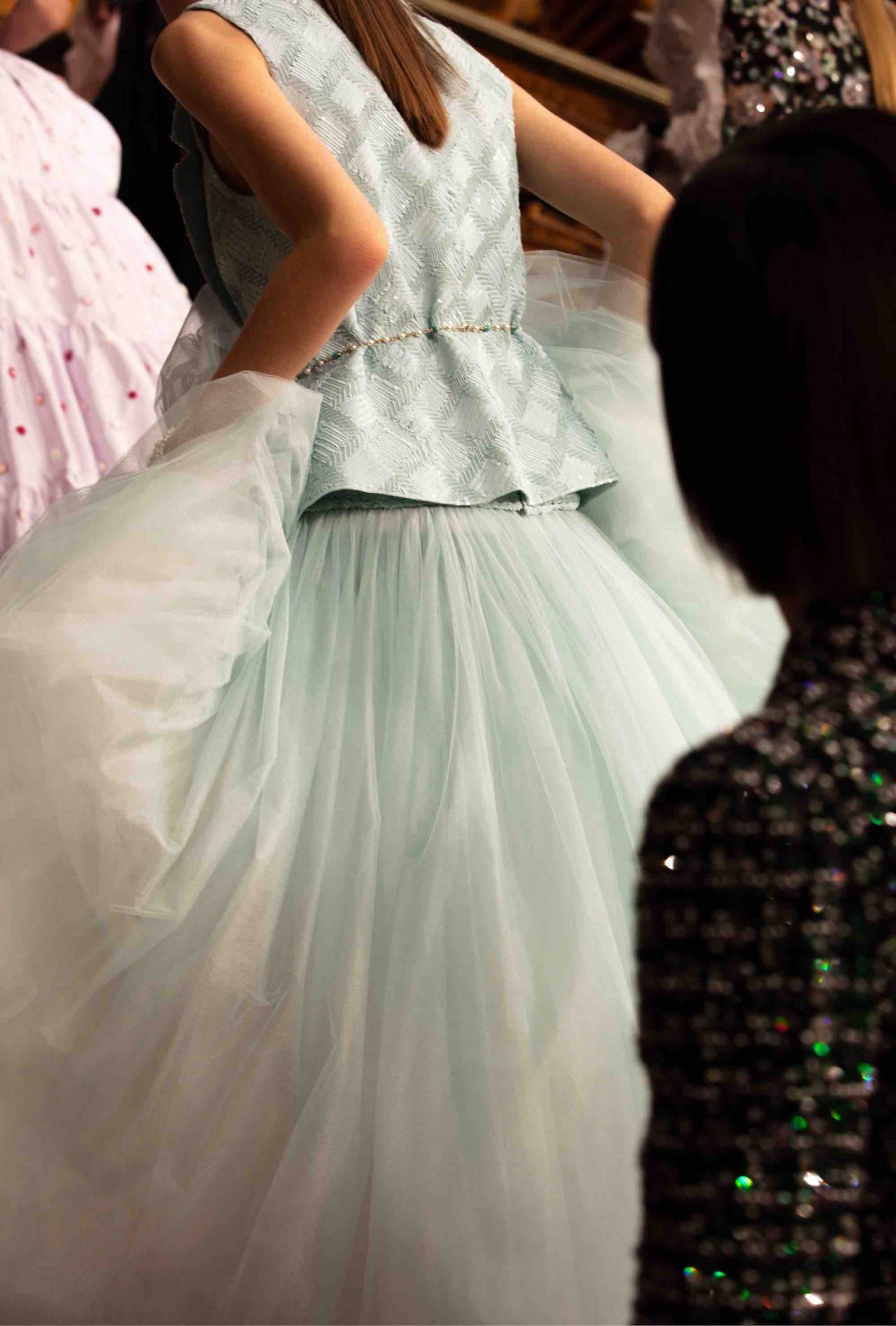 夏のイヴニングパーティーでの解放感あるダンスというアイデアから出発し、全体にラッフルをあしらったボレロにクレープジョーゼットのフリルが何重にもペールピンクのドレスに重ねられ、ペティコートで動きを表現。取り外しが出来る白いデイジーのレースのロングスカートは、同素材のケープ付きドレスの上に重ねることで、 脚の動きを開放する。また、メンズのウェストコートからインスパイアされたパンツ スーツのジャケットからも、他のルック同様に動きが表現されている。