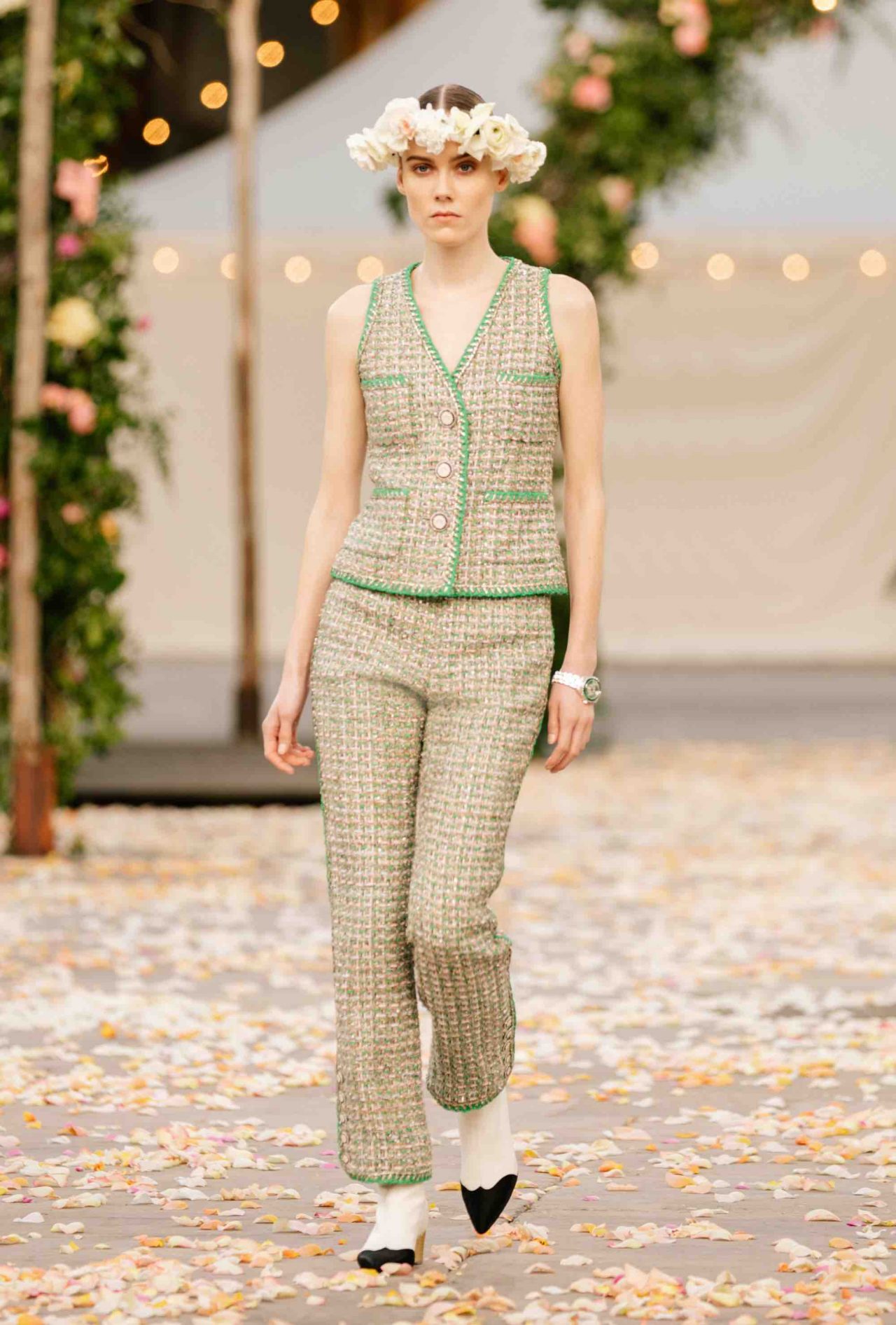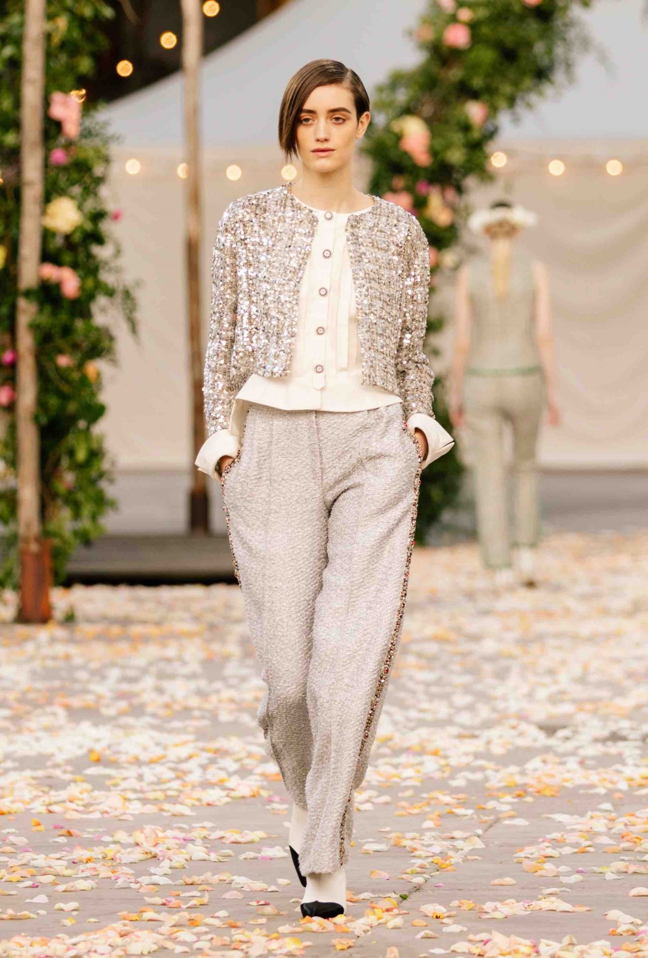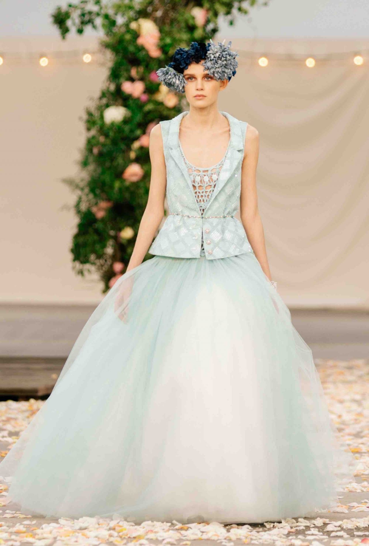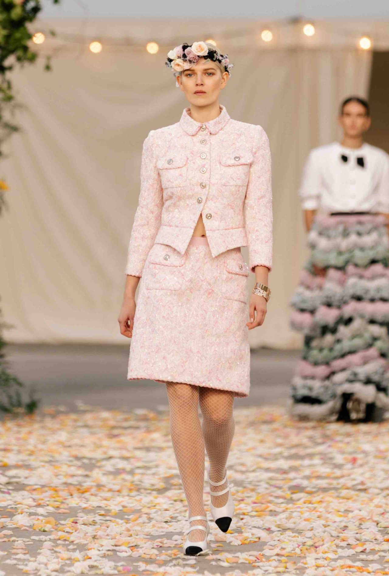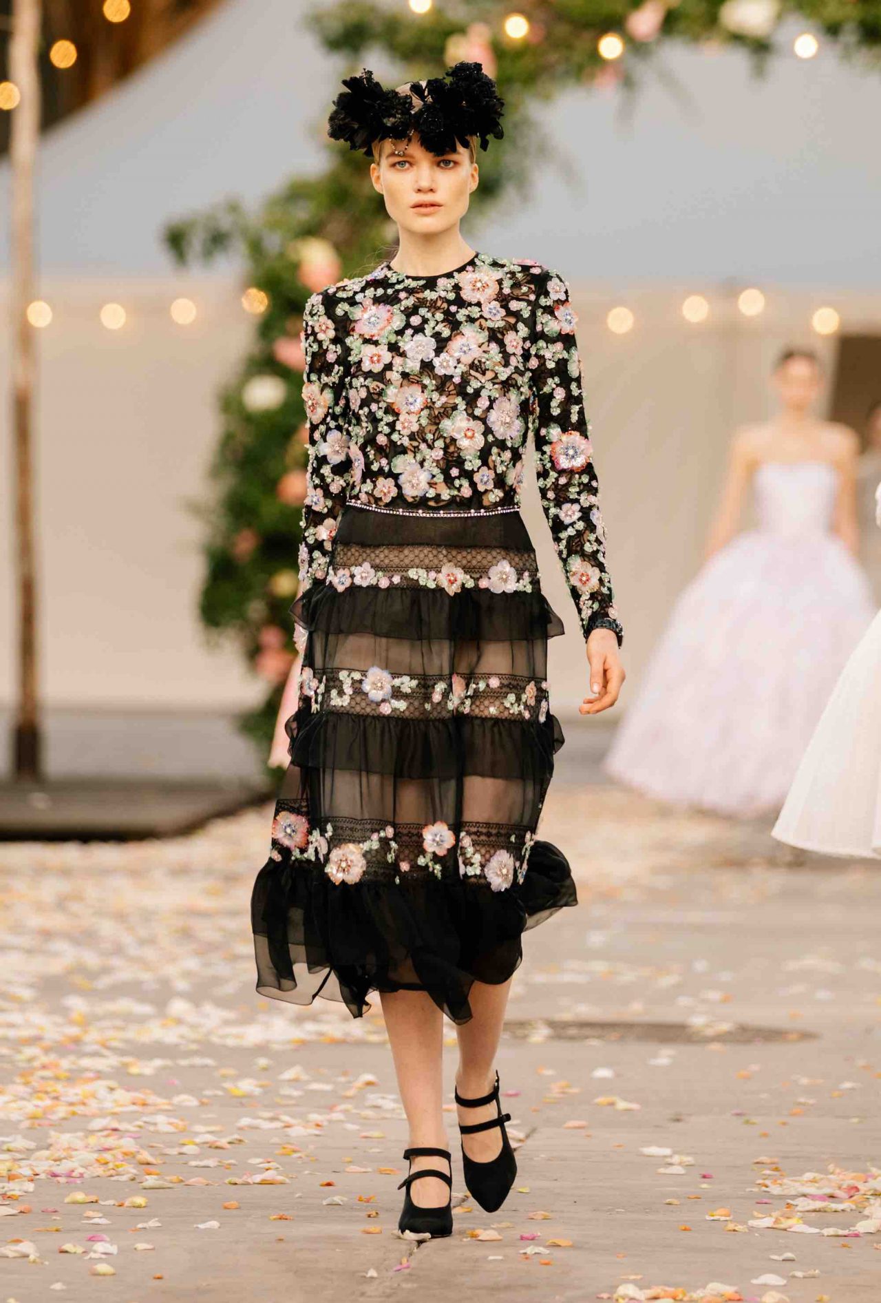 これまで以上にポジティブなムードに包まれた CHANEL 2021年春夏 オートクチュール コレクション。ロマンチックな「Be My Baby」に乗せて、満開のバラが咲き乱れるアーチから繰り出したのは、花冠にベール、大きく波打つチュールやフリル、輝きを放つスパンコール、そして白馬。夢にまで出てきそうなハッピーウェディングの情景だ。