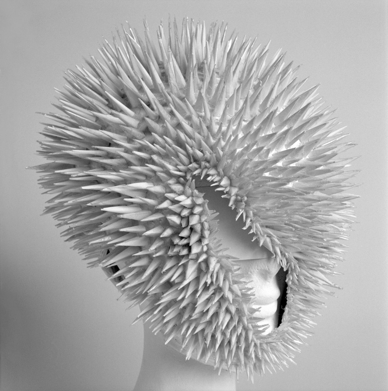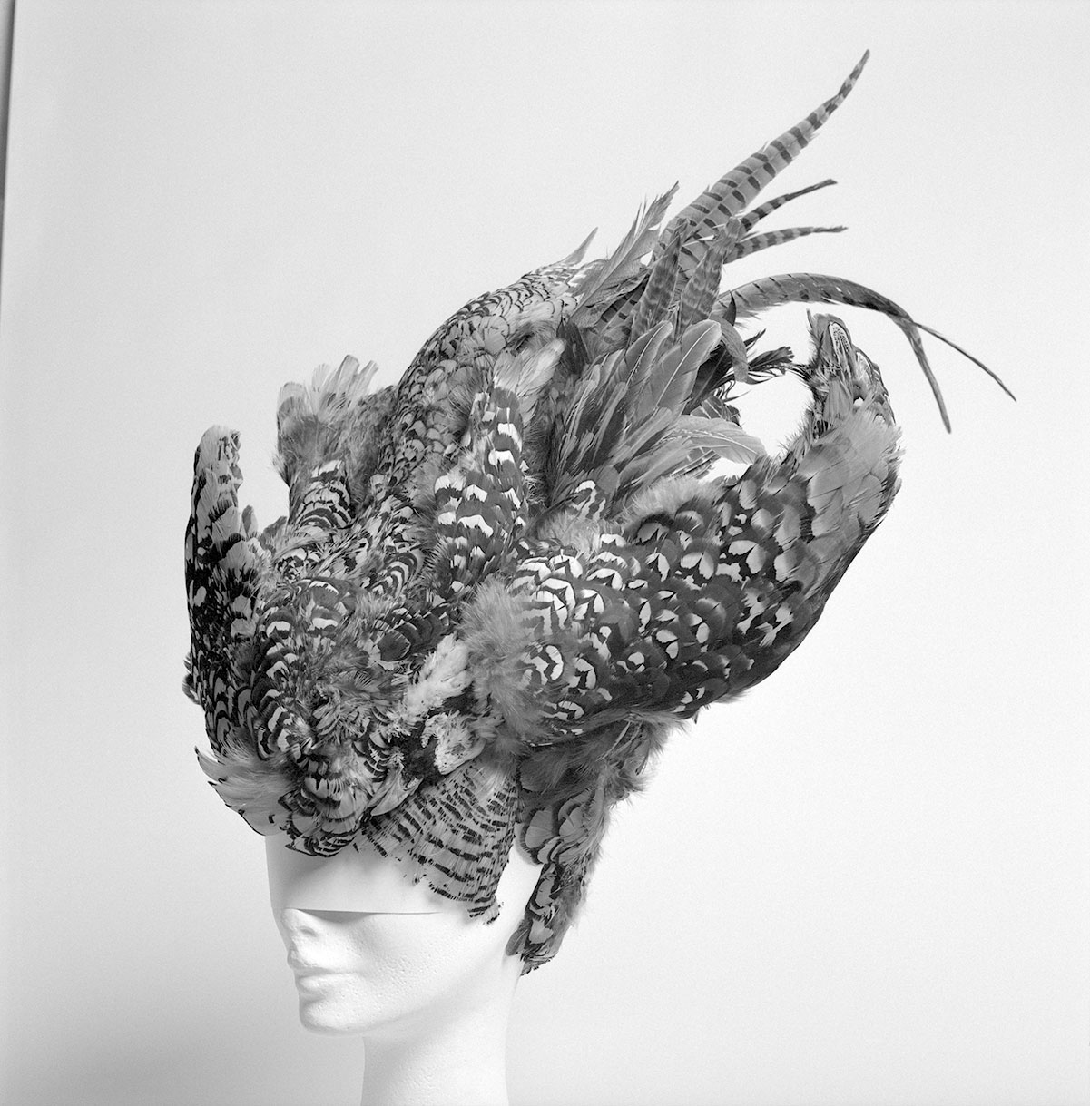 『KAMO HEAD』に収められているのは、約220点のヘッドピース。加茂が制作で愛用していた発泡スチロール製のマネキンにのせて撮影した。「加茂さんにいわれたのは、モノクロで撮りたい、ということ。白バックで、凝ったライティングや仕上げはせず、なるべく普通に撮りたいというのが彼の希望でした。私はショーでこのヘッドピースを見ることがなかったので、これらの加茂さんがつくったヘッドピースを、かなりニュートラルに見たように思います」。