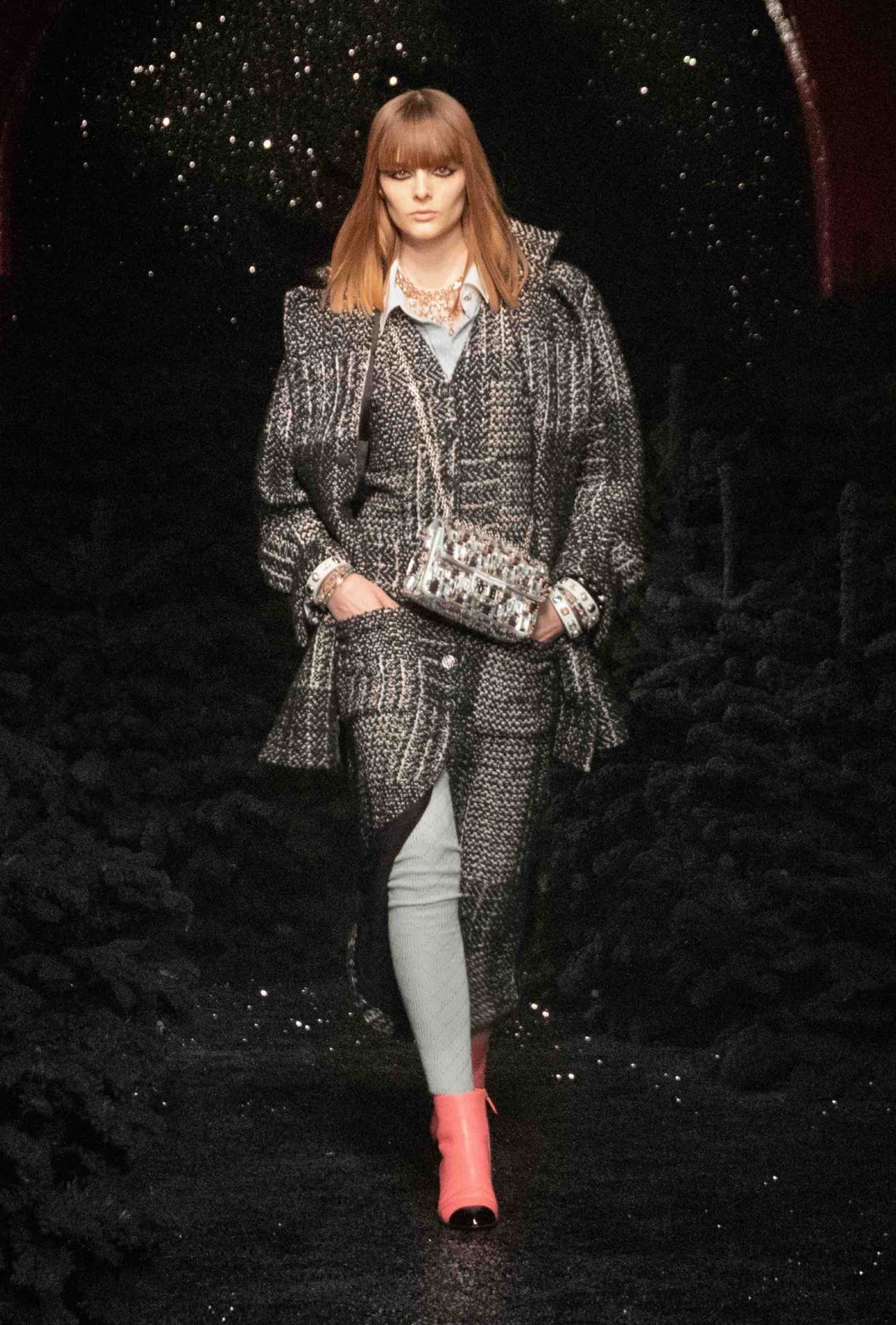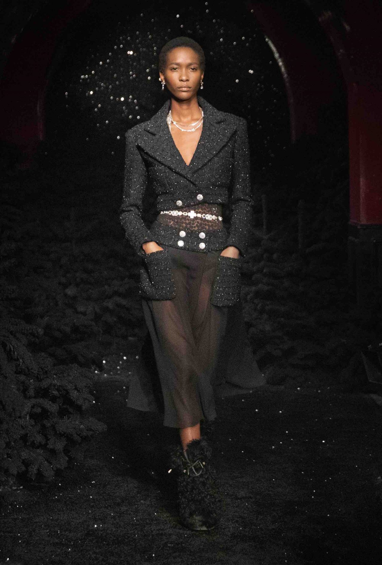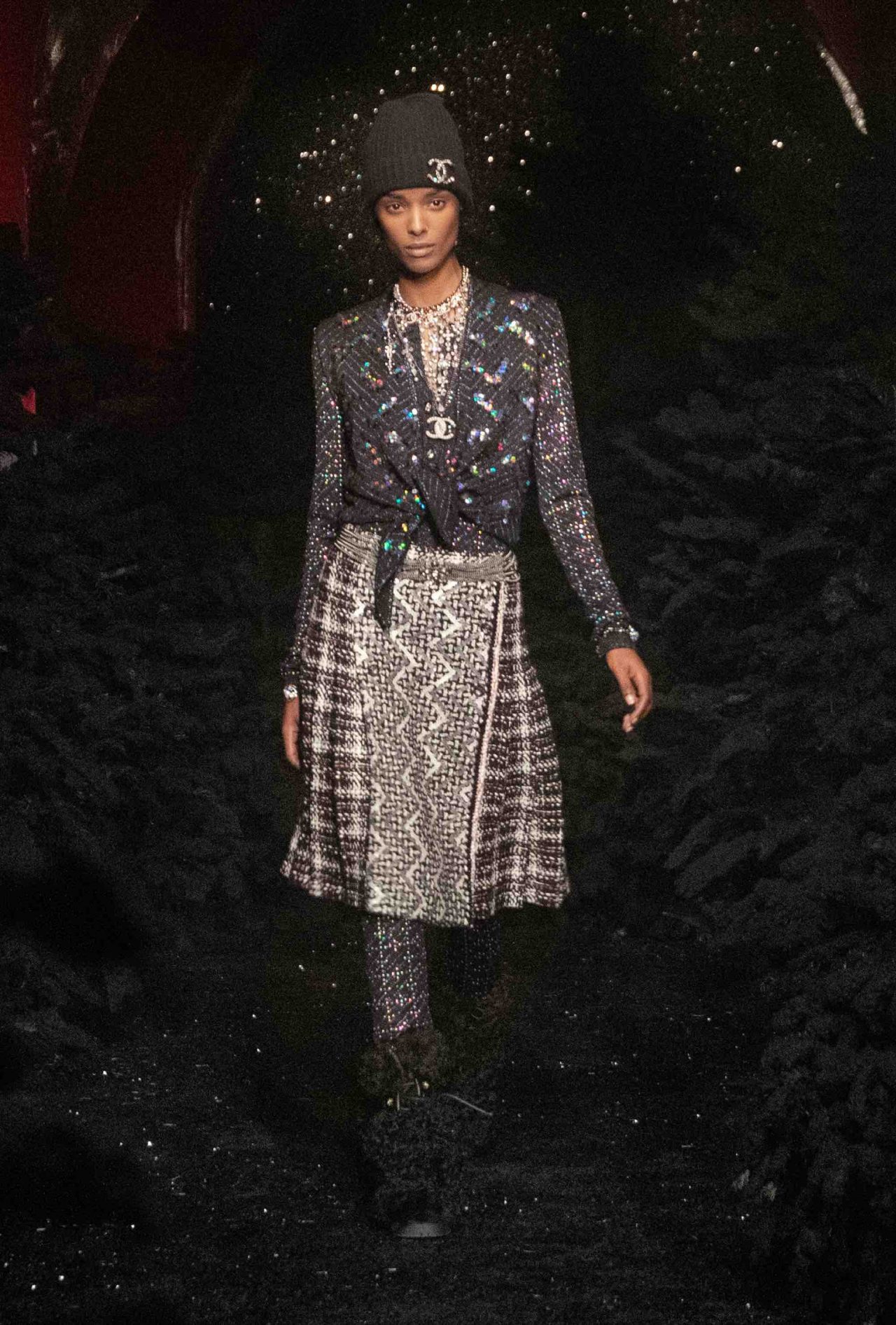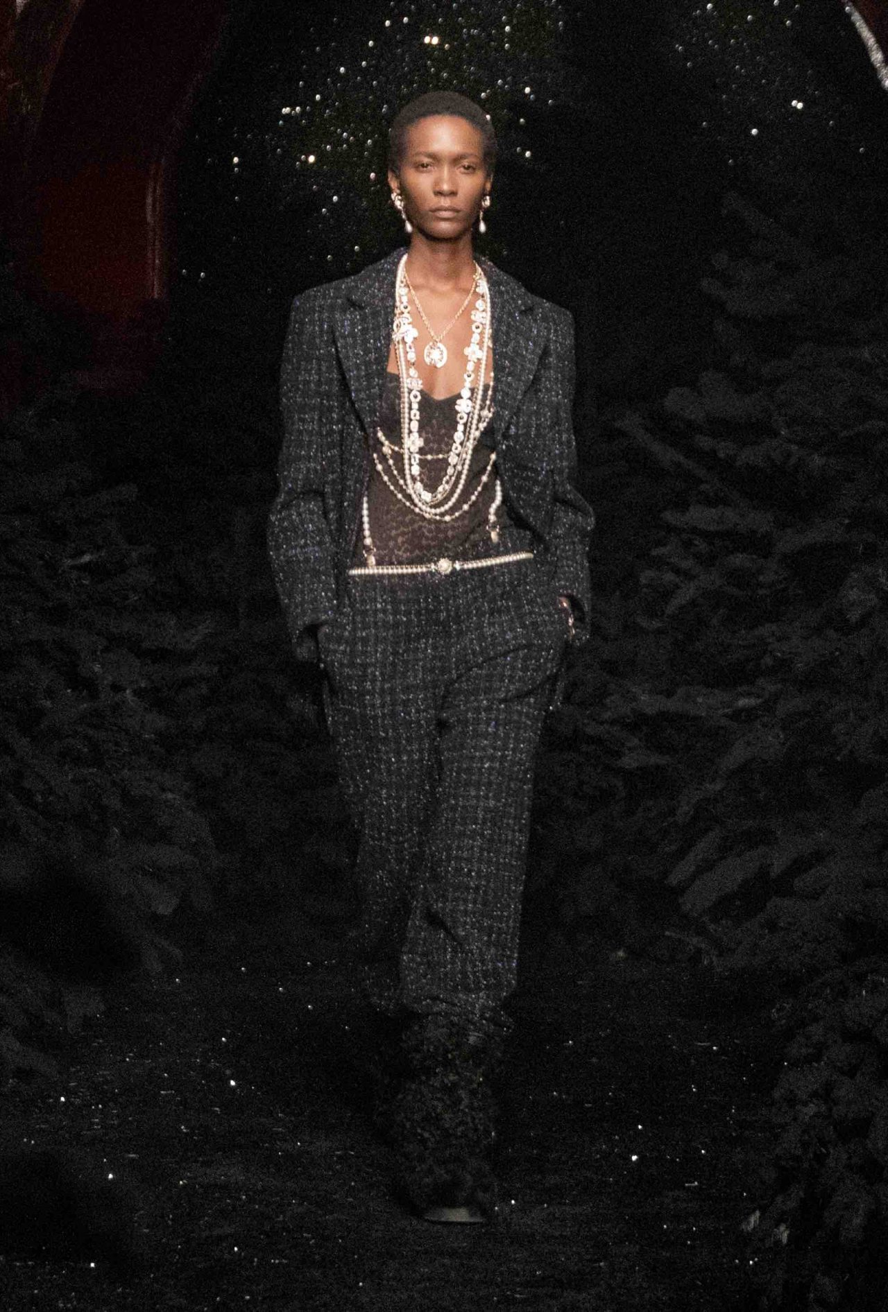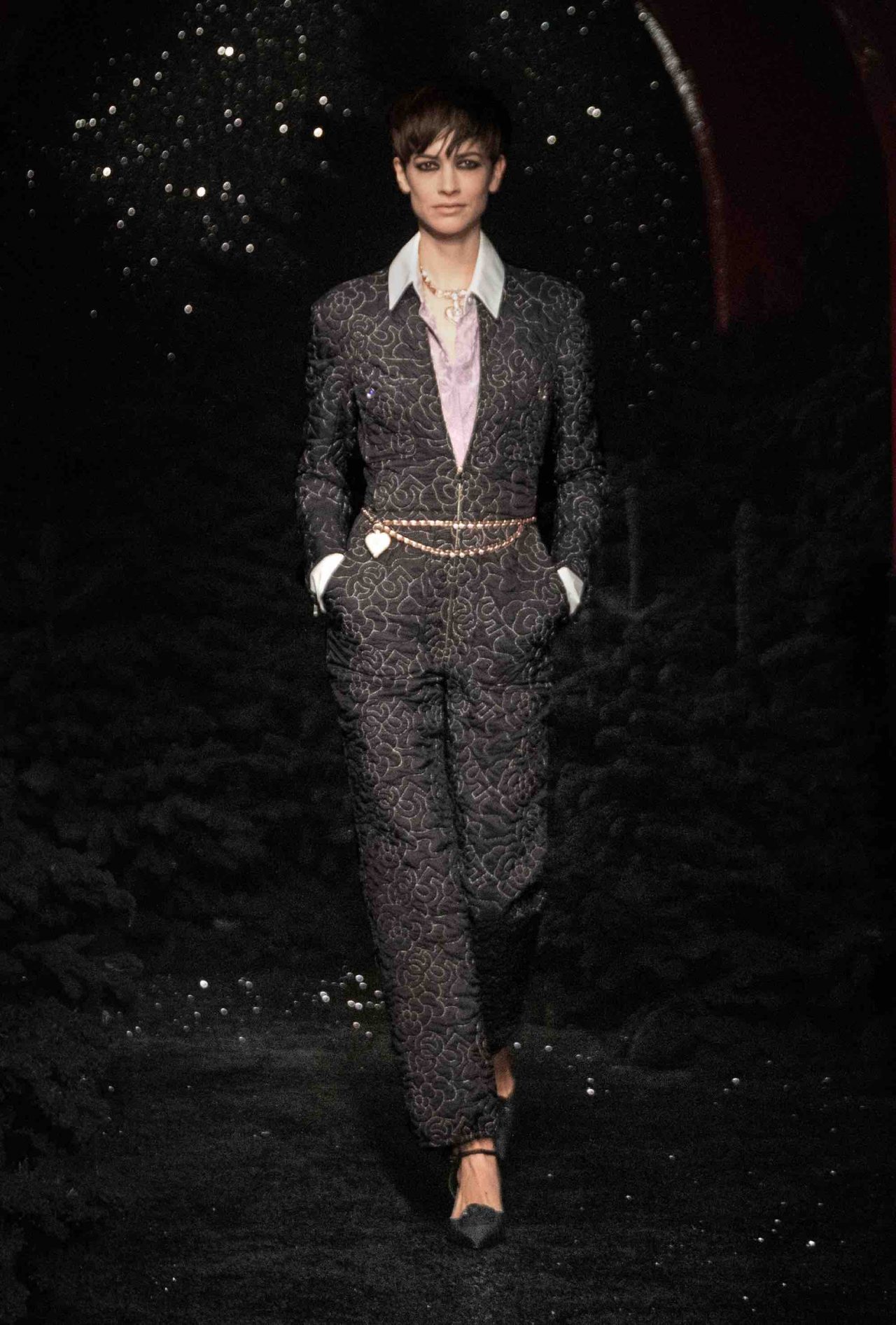また、Virginie Viard は本コレクションを語る上で、去年の12月に急逝したスーパーモデルの Stella Tennant の名前を挙げている。シルバーラメのバレリーナシューズや、ネックレスのように首から掛けられたミノディエール、ラメ糸で仕立てられたプレシャスなスーツと白襟とカフス付きのメンズシャツ、玉虫色の糸で装飾されたニットのジャンプスーツに重ねたツイードのキルトスカート…いずれもそのアンドロジナスな魅力で自由にファッションを楽しんだ彼女の姿を確かに彷彿とさせる。「これらのシルエットを見ていると、ステラ・テナントのアリュールを思い出さずにはいられません。彼女独自の着こなし。それはとてもシャネルらしいものでした」