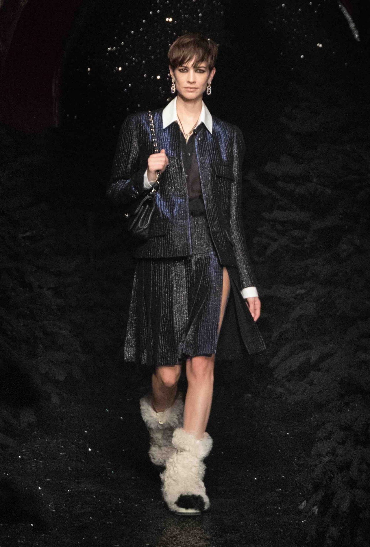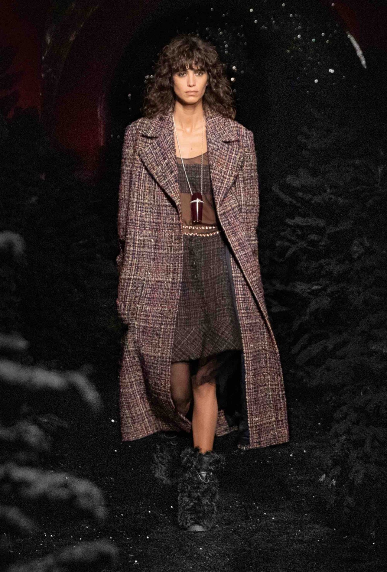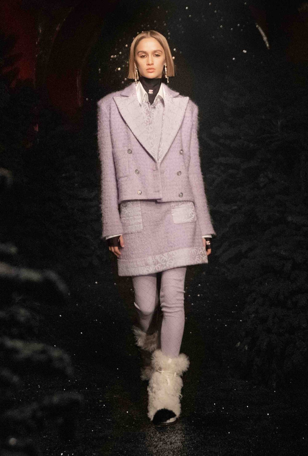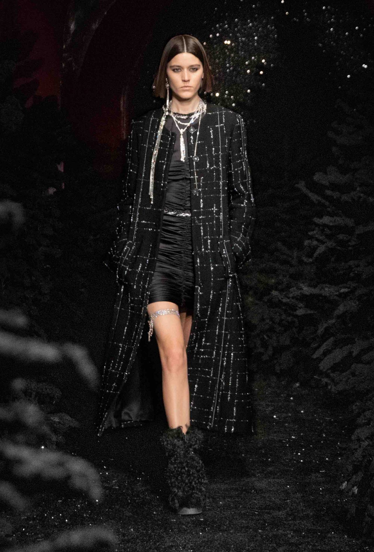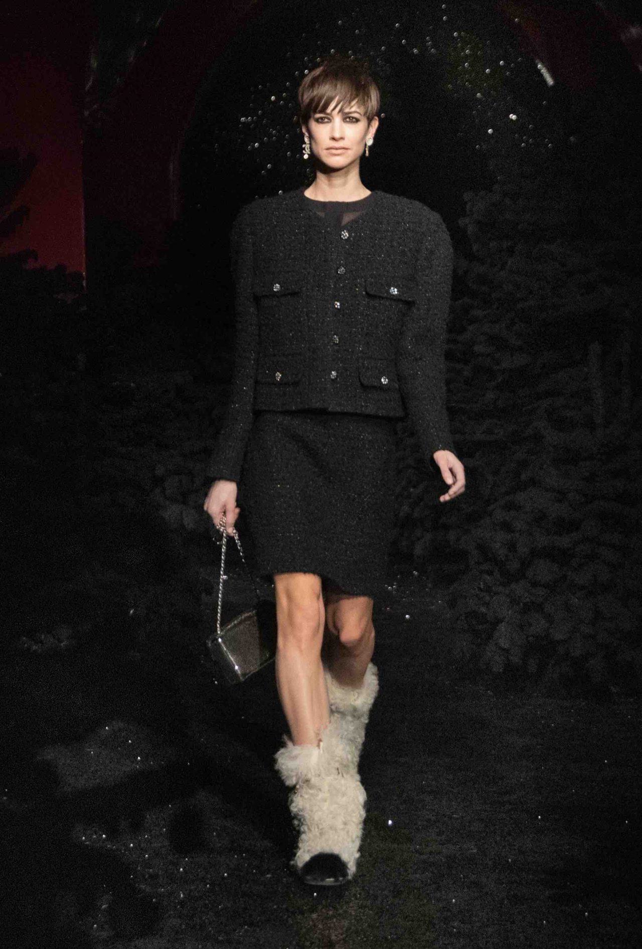 また、Virginie Viard は本コレクションを語る上で、去年の12月に急逝したスーパーモデルの Stella Tennant の名前を挙げている。シルバーラメのバレリーナシューズや、ネックレスのように首から掛けられたミノディエール、ラメ糸で仕立てられたプレシャスなスーツと白襟とカフス付きのメンズシャツ、玉虫色の糸で装飾されたニットのジャンプスーツに重ねたツイードのキルトスカート…いずれもそのアンドロジナスな魅力で自由にファッションを楽しんだ彼女の姿を確かに彷彿とさせる。「これらのシルエットを見ていると、ステラ・テナントのアリュールを思い出さずにはいられません。彼女独自の着こなし。それはとてもシャネルらしいものでした」
