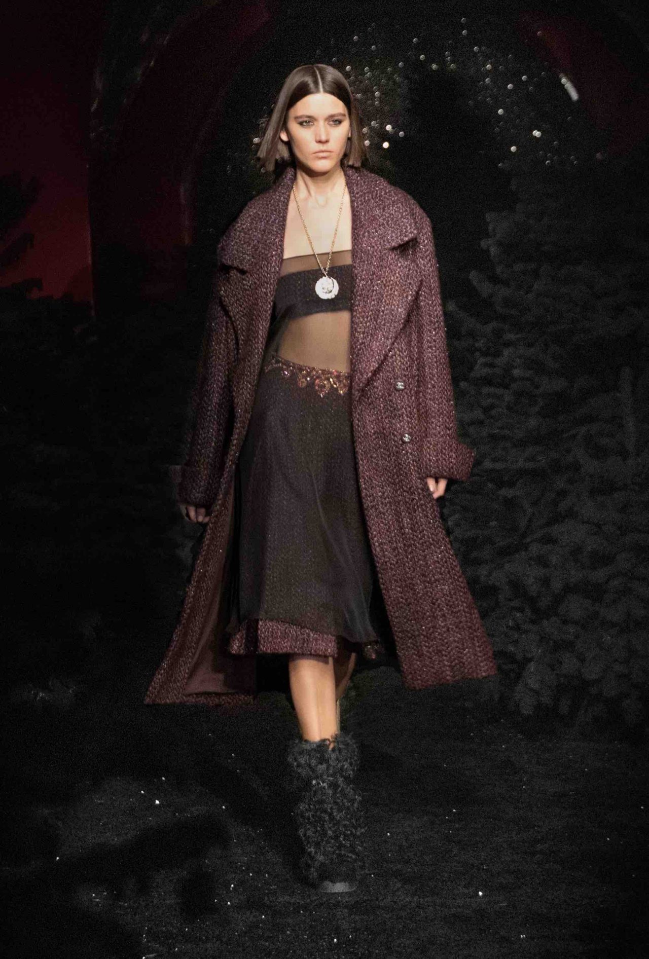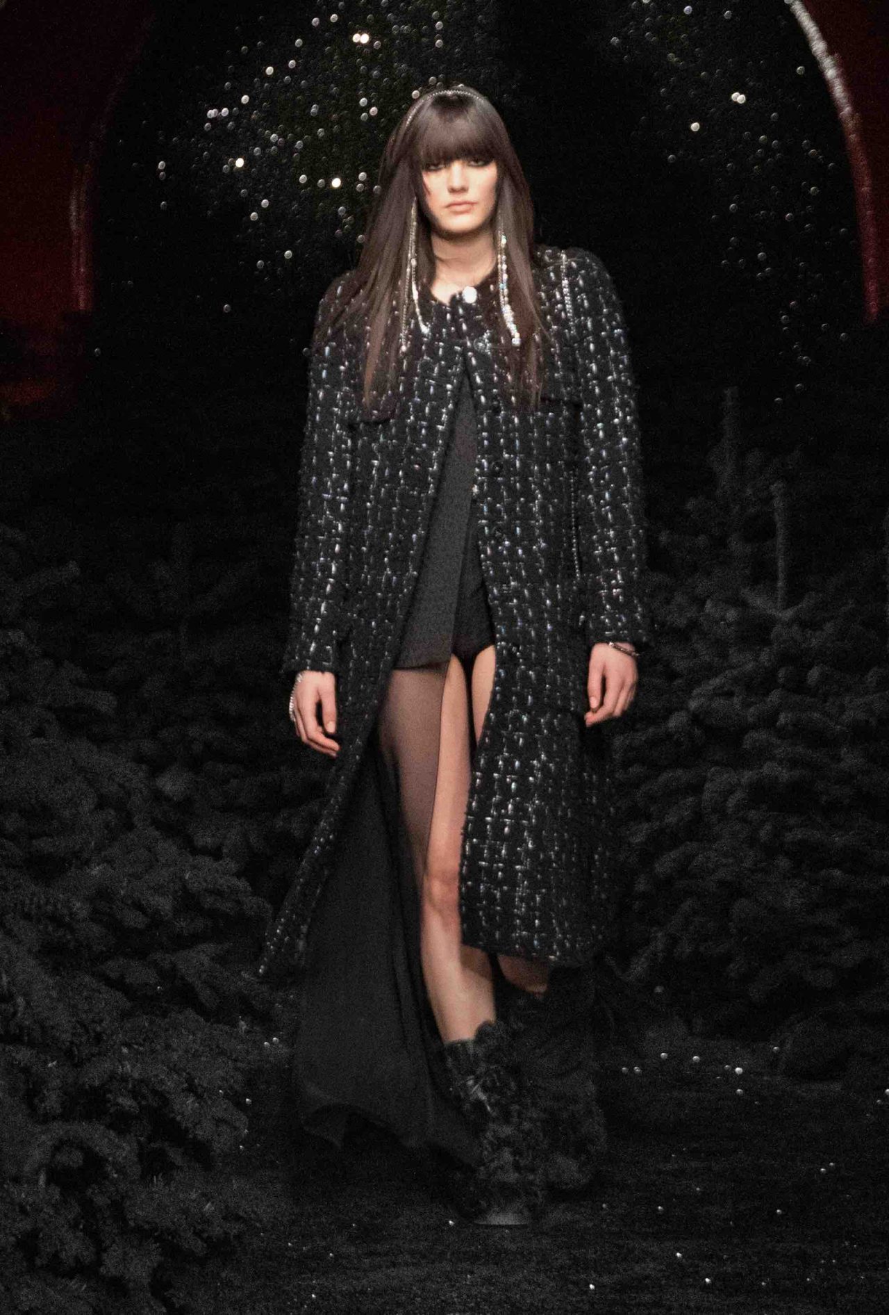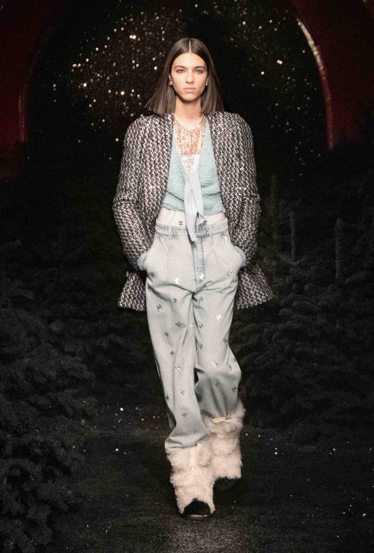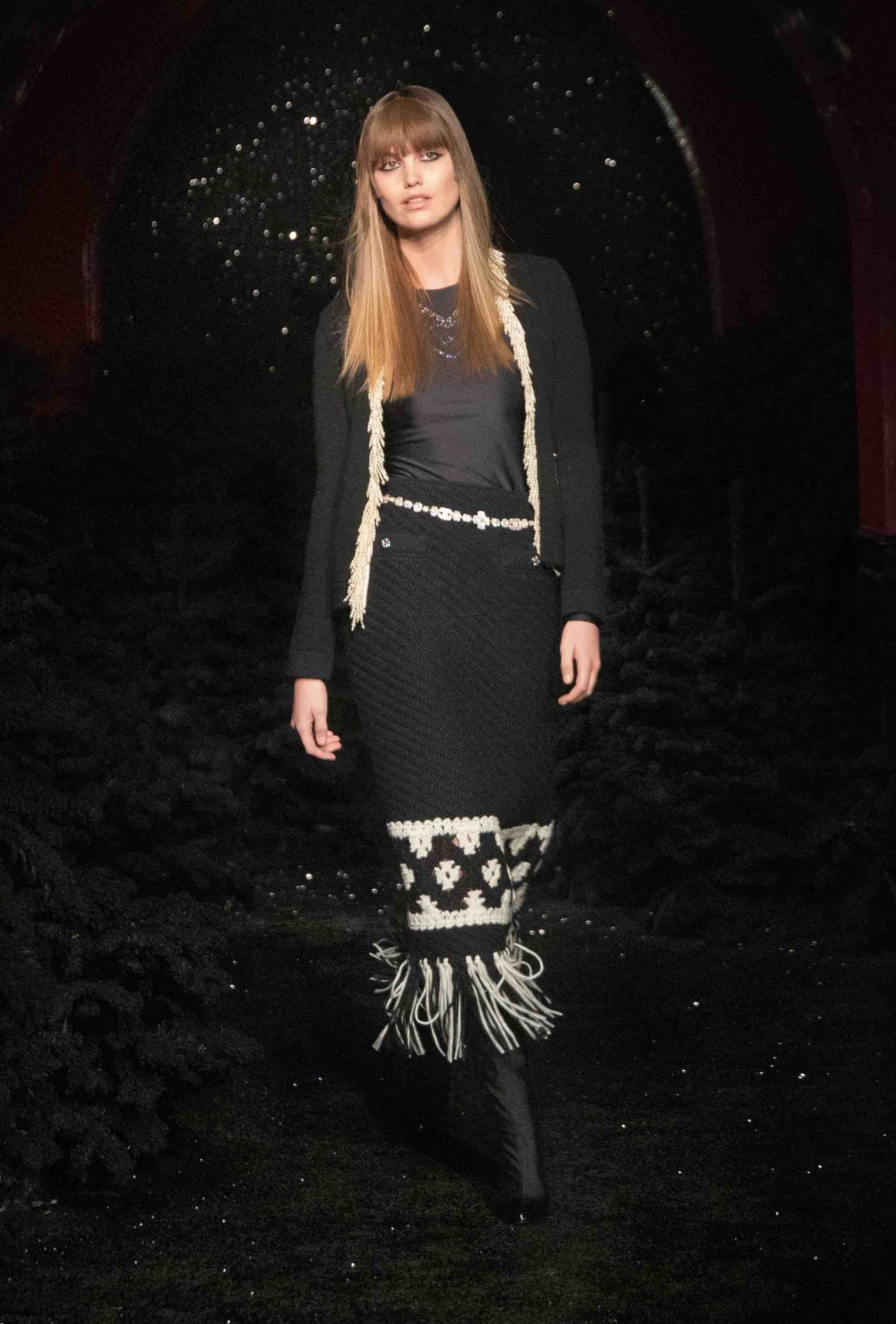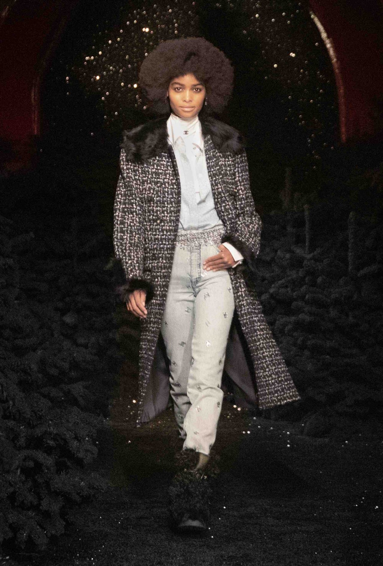 また、Virginie Viard は本コレクションを語る上で、去年の12月に急逝したスーパーモデルの Stella Tennant の名前を挙げている。シルバーラメのバレリーナシューズや、ネックレスのように首から掛けられたミノディエール、ラメ糸で仕立てられたプレシャスなスーツと白襟とカフス付きのメンズシャツ、玉虫色の糸で装飾されたニットのジャンプスーツに重ねたツイードのキルトスカート…いずれもそのアンドロジナスな魅力で自由にファッションを楽しんだ彼女の姿を確かに彷彿とさせる。「これらのシルエットを見ていると、ステラ・テナントのアリュールを思い出さずにはいられません。彼女独自の着こなし。それはとてもシャネルらしいものでした」