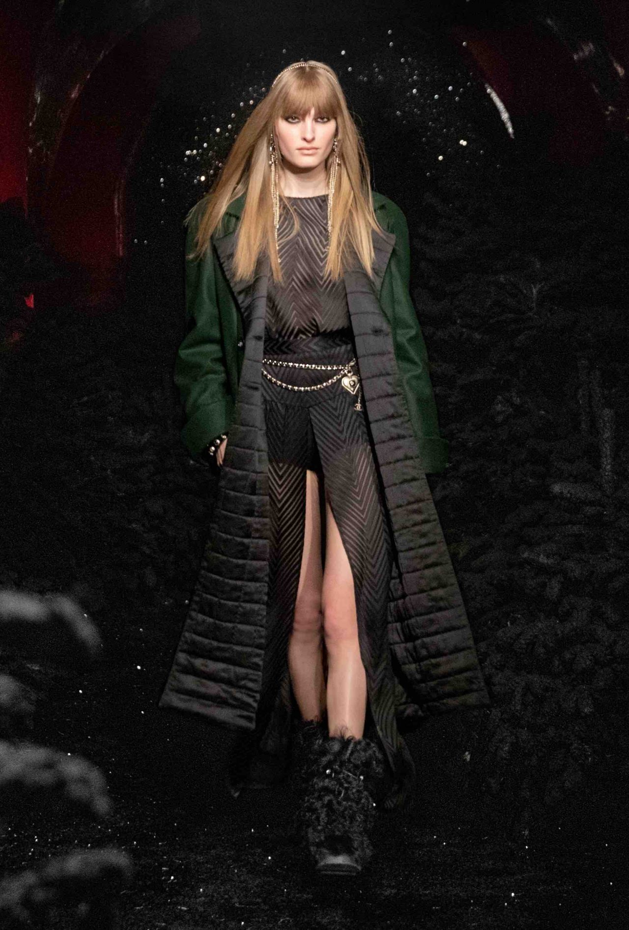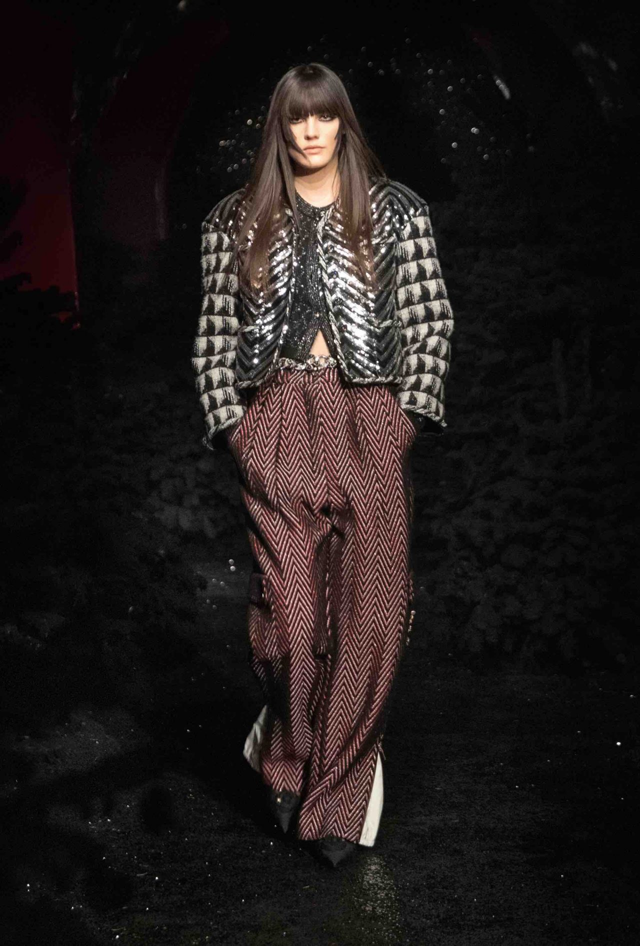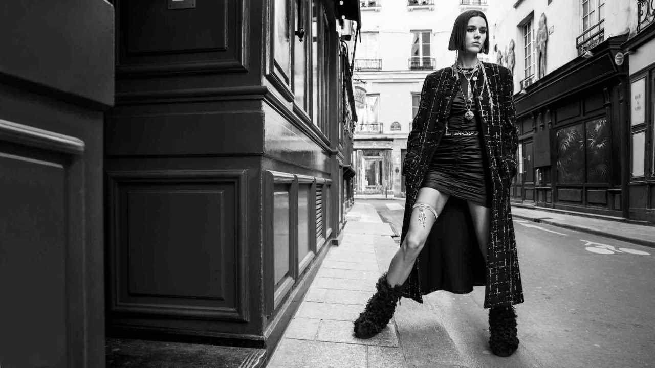 ファーストルックは、ブレードがあしらわれたロングのツイードコートにシフォンドレスの組み合わせ。コートから覗くビキニトップスがルックをコンテンポラリーにアップデートする。シェブロンモチーフのロングコートにはボディスーツを。大胆な肌見せもさりげないパリジャンシックだ。コレクションで目を惹いたのは、足元のファーブーツ。ふんだんに用いられたフェイクファーのボリュームとそこから伸びる素足のコントラストが印象的だった。