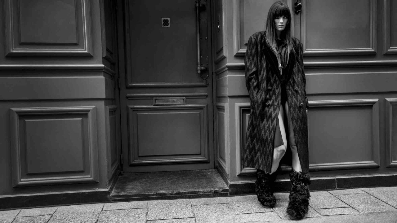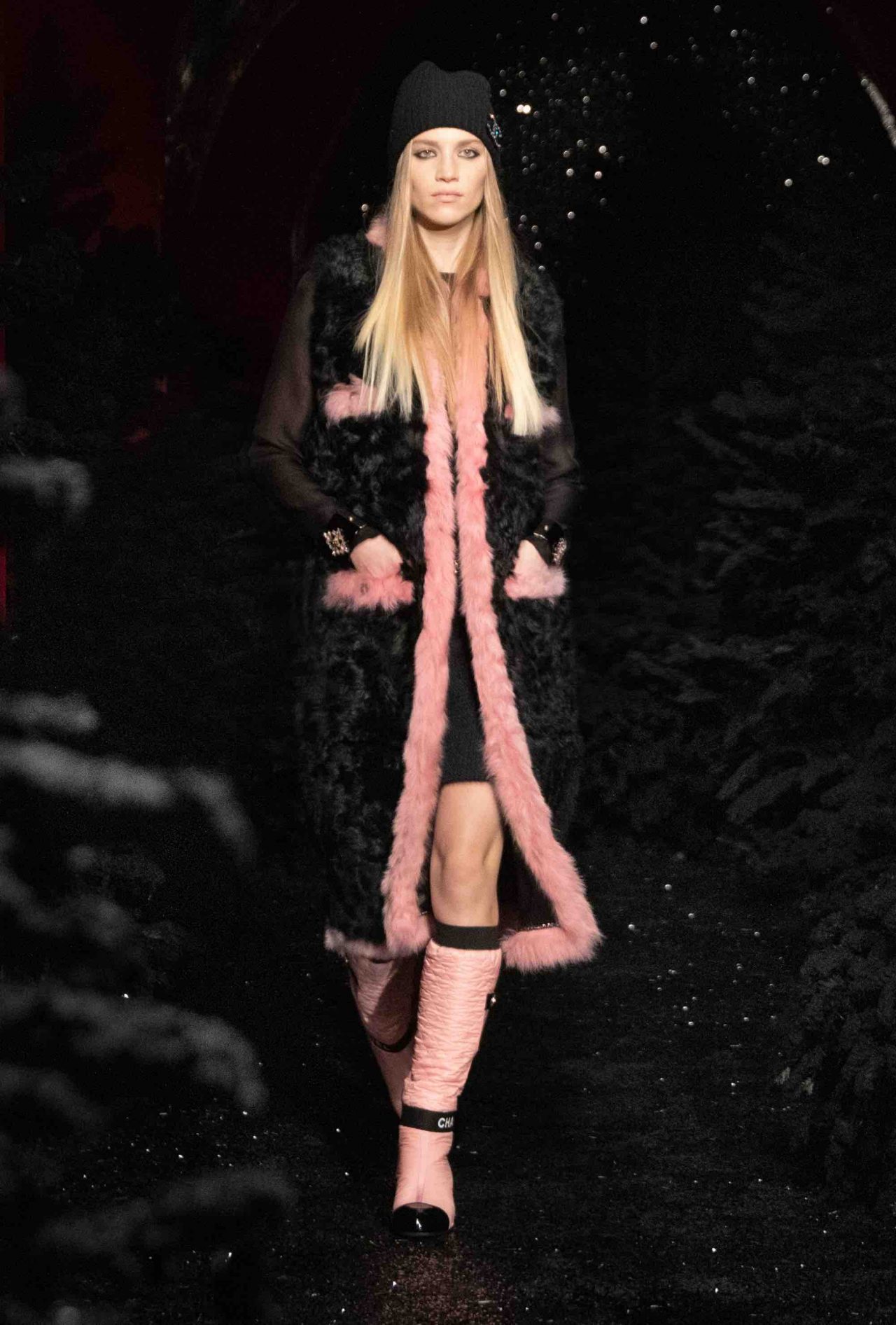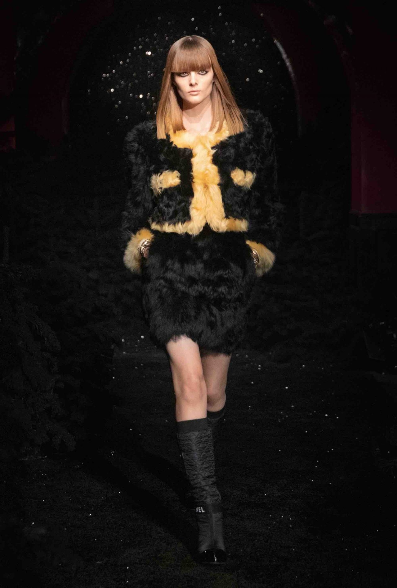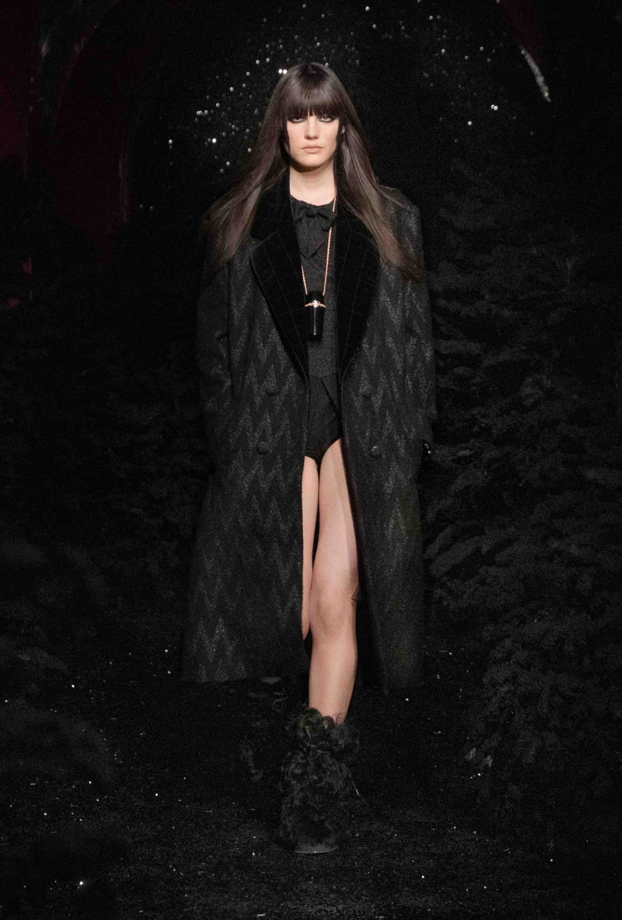 ファーストルックは、ブレードがあしらわれたロングのツイードコートにシフォンドレスの組み合わせ。コートから覗くビキニトップスがルックをコンテンポラリーにアップデートする。シェブロンモチーフのロングコートにはボディスーツを。大胆な肌見せもさりげないパリジャンシックだ。コレクションで目を惹いたのは、足元のファーブーツ。ふんだんに用いられたフェイクファーのボリュームとそこから伸びる素足のコントラストが印象的だった。