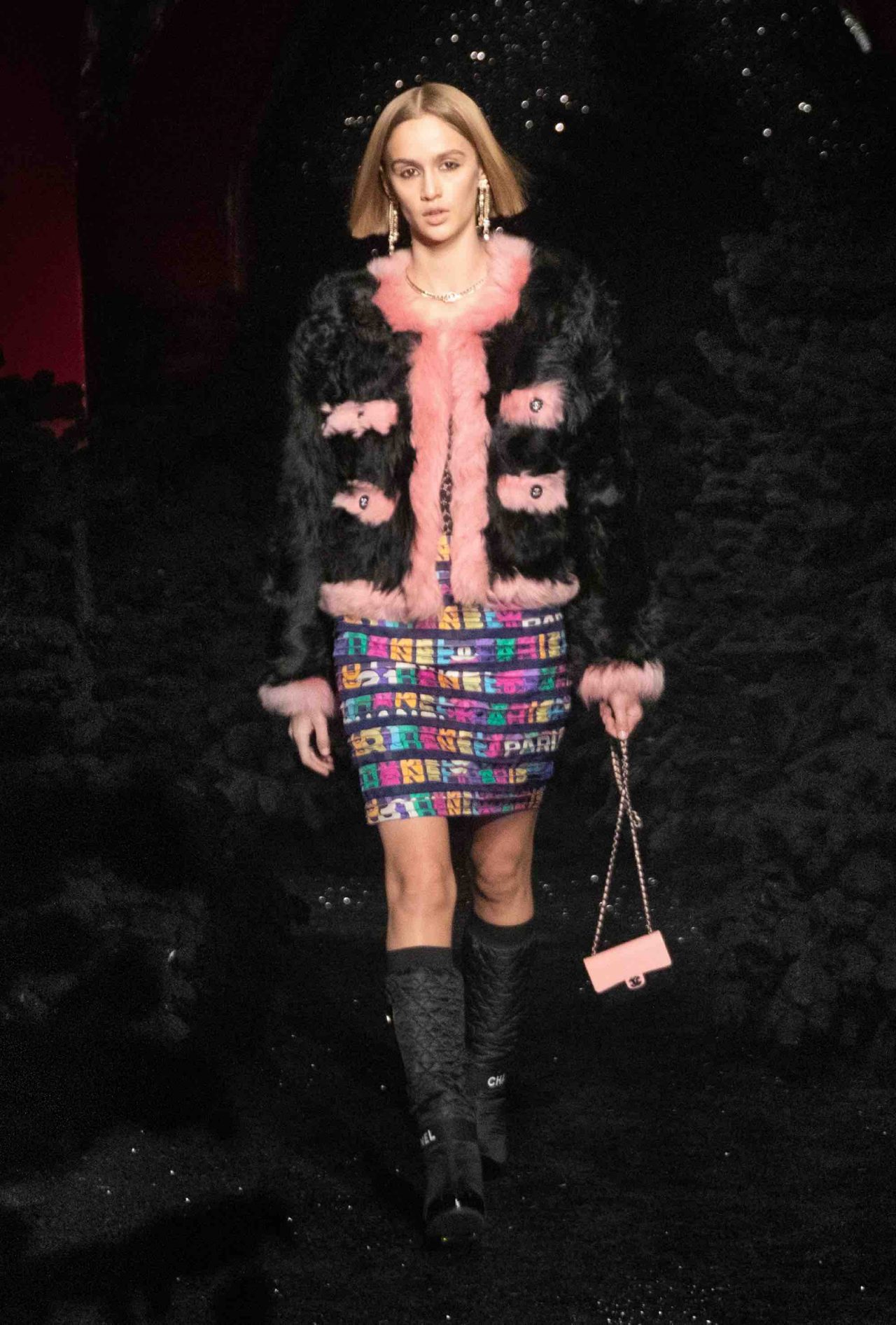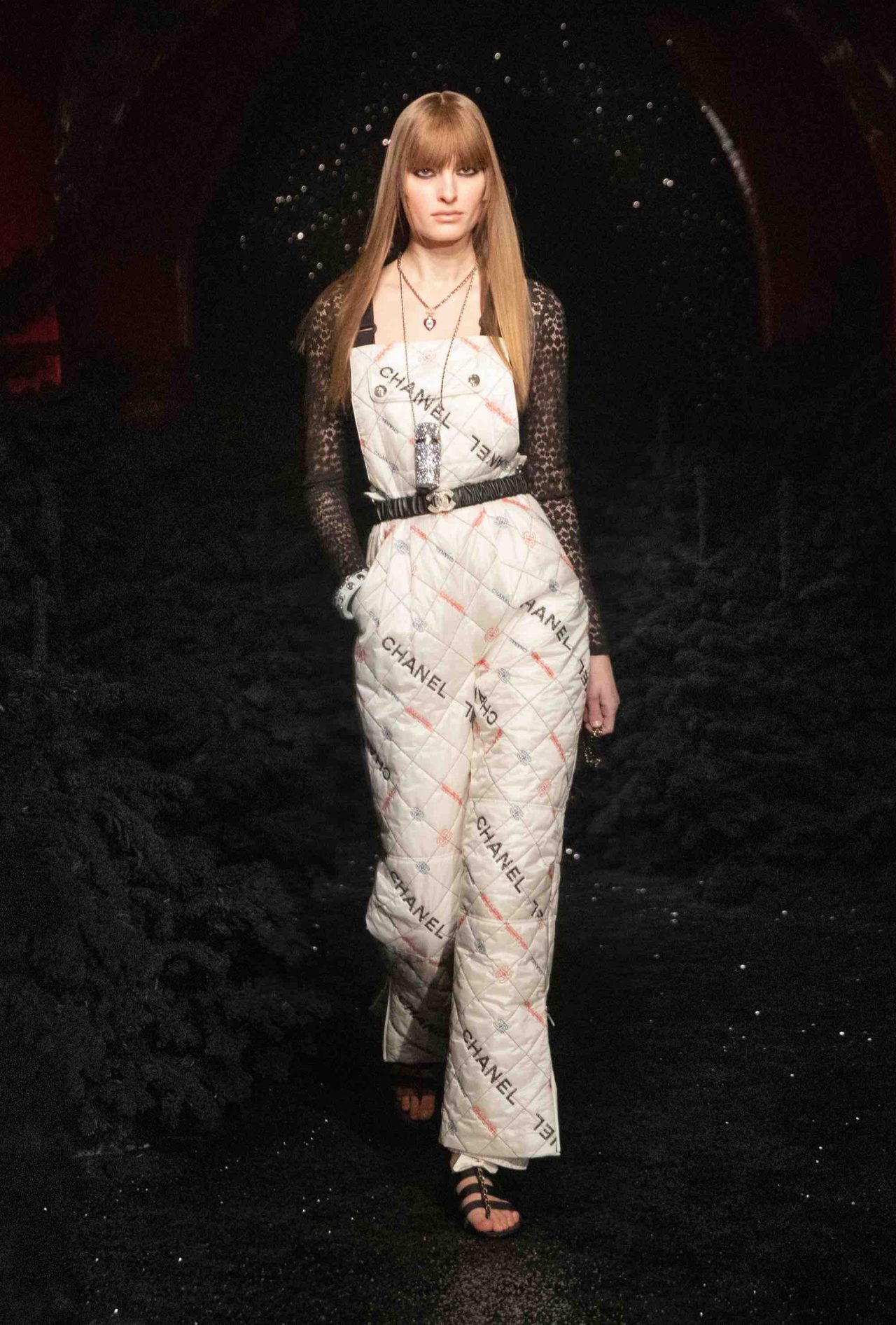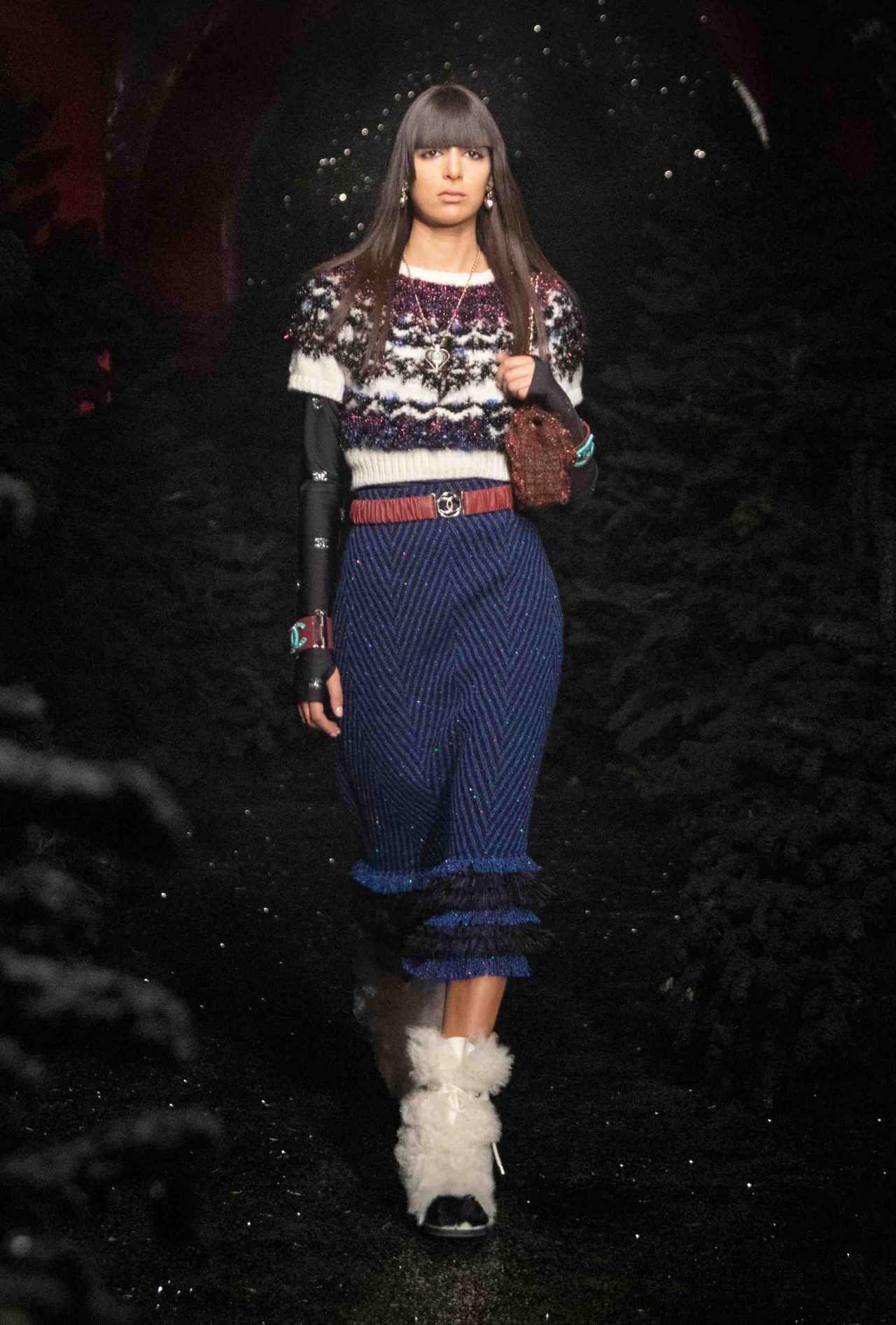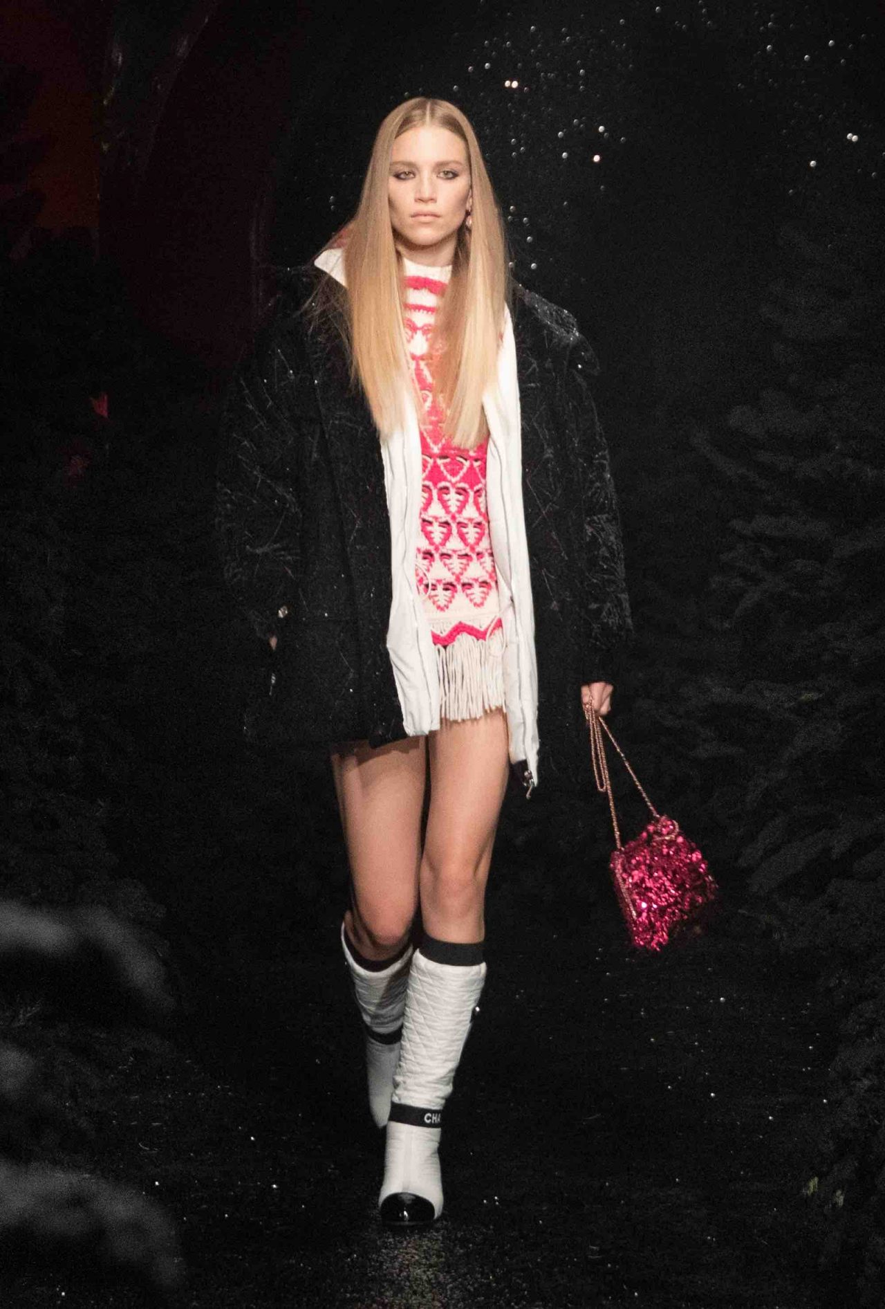 今回、Virginie Viard に大きなインスピレーションを与えたのは、ウィンタースポーツの装い。「私が愛してやまないスキーリゾートの雰囲気と、1970年代から今に続くクールなパリジャンシックから影響を受け、調和させたコレクションです」というに、サロペットのスキースーツやニット帽、”ダウンジャケット”風のブーツ、ノルディック柄のセーターといったアイテムがコレクションにコケティッシュな魅力を与えている。