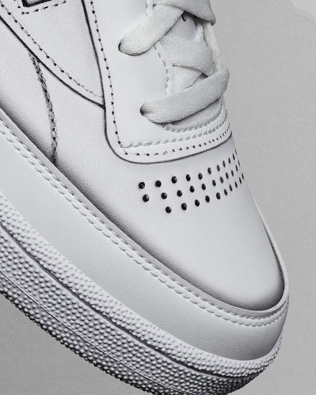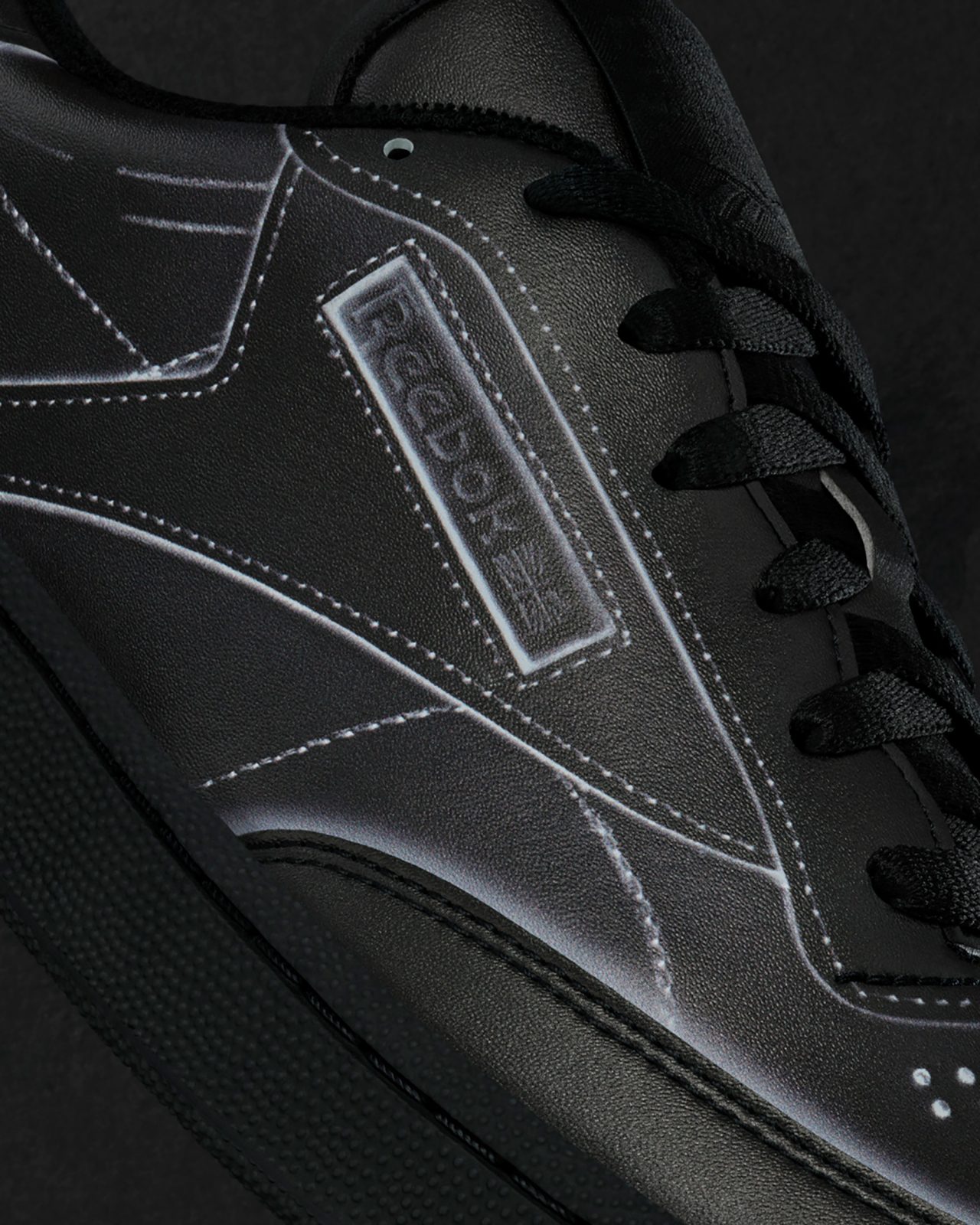注目したいのは、Maison Margiela が得意とするトロンプルイユ(だまし絵)を採用し、「Club C」シューズのデザインをスキャンした画像がプリントされたアッパーデザイン。フラットレザーに「Club C」の立体的なステッチ、曲線、影がリアルに描かれている。