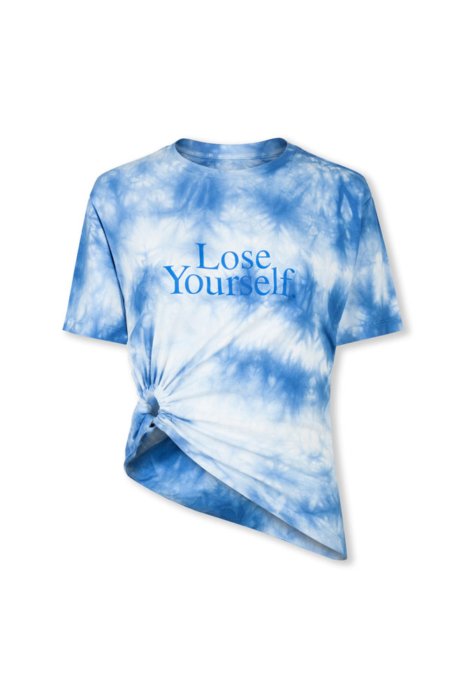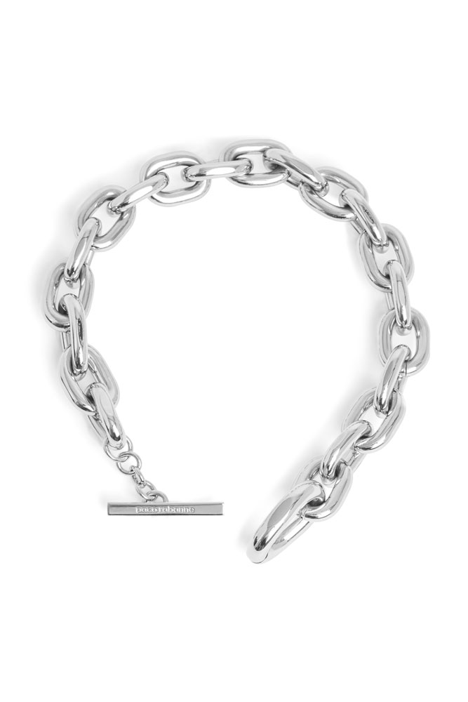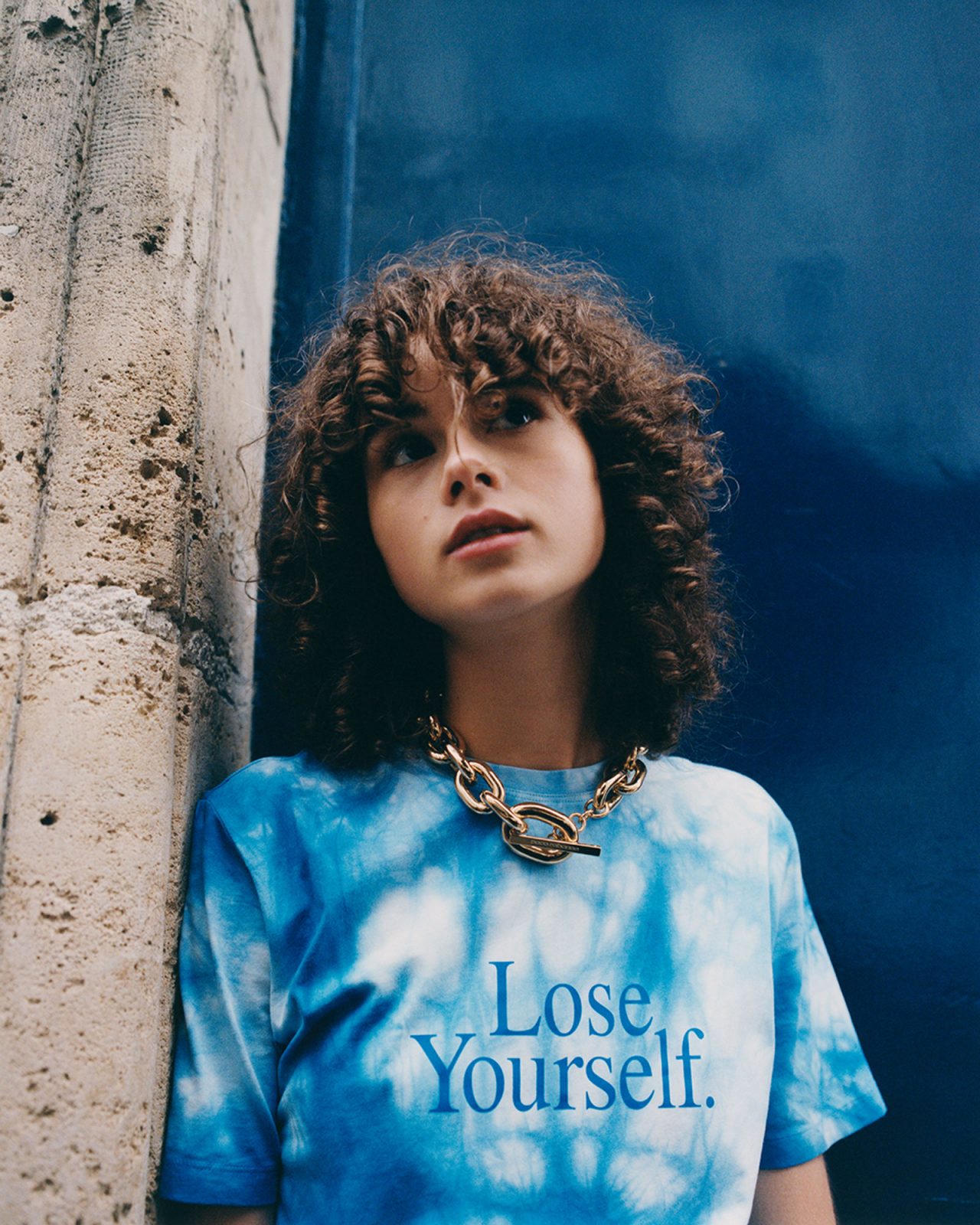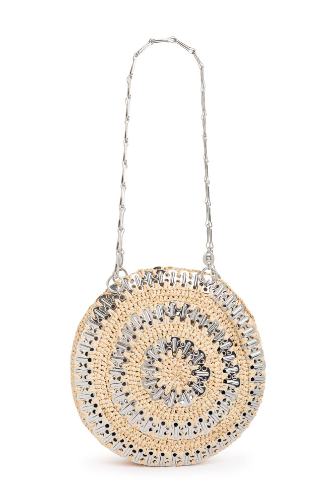本コレクションでは、Paco Rabanne がクラシックとなった作品を今もなお探究し続けていることが表現されており、ゴールドの円盤のアセンブラージュスカートは Paco Rabanne のアーカイブから再現。シグネチャーバッグである「1968」は、ラフィアとシルバーメタルのパスティルがシームレスに織り込まれ、新たにアップデートさている。また、Peter Saville (ピーター・サヴィル) との継続的なコラボレーションでは、「LOSE YOURSELF」Tシャツがお目見えした。