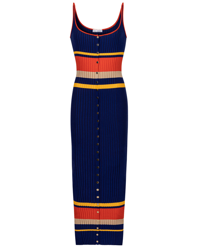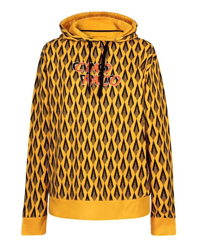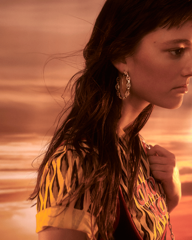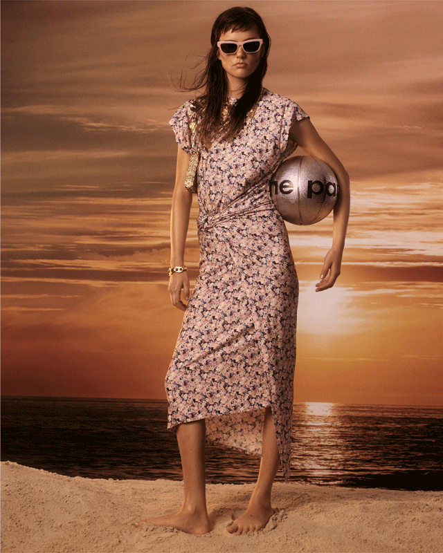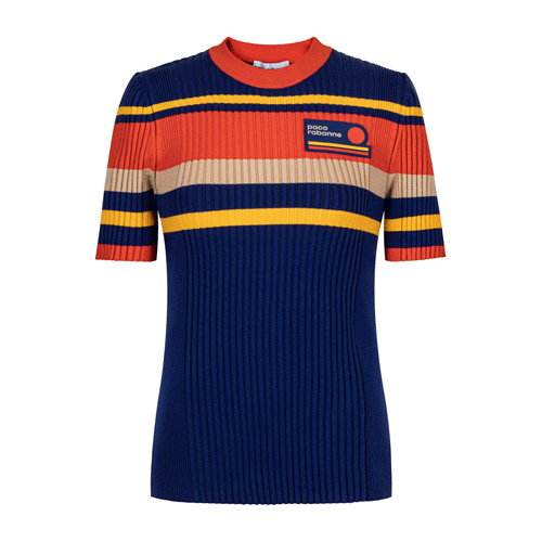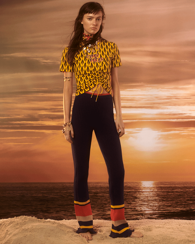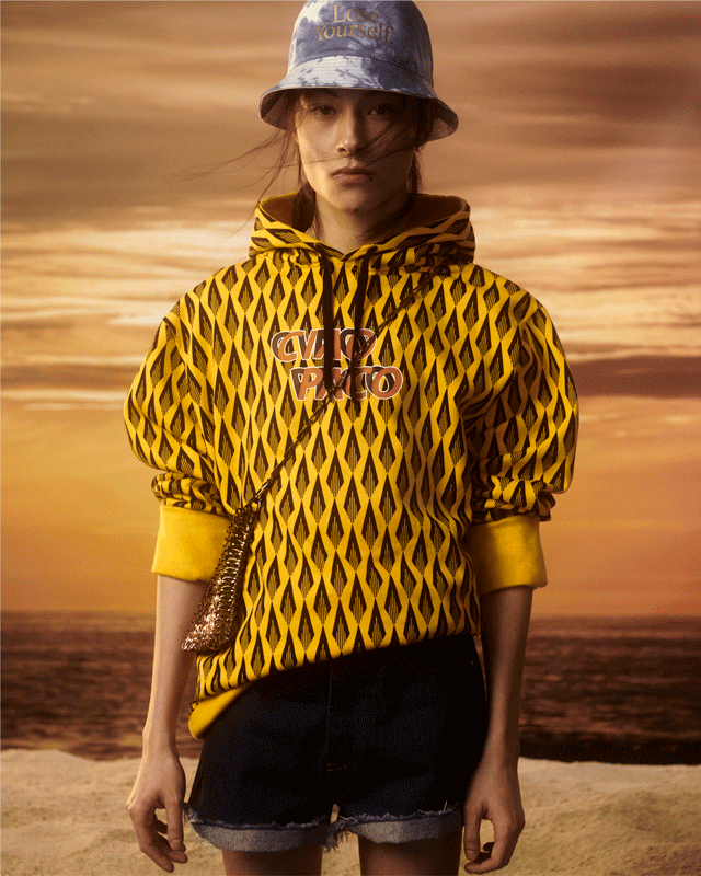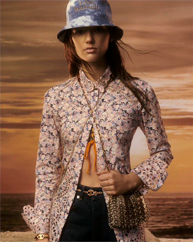 フレッシュなカラーパレットのTシャツやスウェット、またレトロなスイムウェアには、過去シーズンに登場したグラフィックデザイナー Peter Saville (ピーター・サヴィル) 考案の「Love Yourself」と、 新しい「Ciao Paco」のスローガンをデザイン。ドレープがかったジャージや、ハリのあるポプリンシャツにはリバティプリントが施され、サテンのパレオスカートとショーツ、メタルチェーンで刺繍されたスリーブレストップは、鮮やかなタイダイ染めで登場。どれもサンセットビーチを思わせる夏らしいムード満開だ。さらに本コレクションのレトロな魅力は、テニスストライプの身体に沿ったリブニット、デニムやユニセックスのカットオフショーツにも。まるで夏の記憶を留めておくための記録装置のようなブランドロゴ入りのラバーパッチは、様々なアイテムに散りばめられ、コレクションのレトロ感をより演出している。
