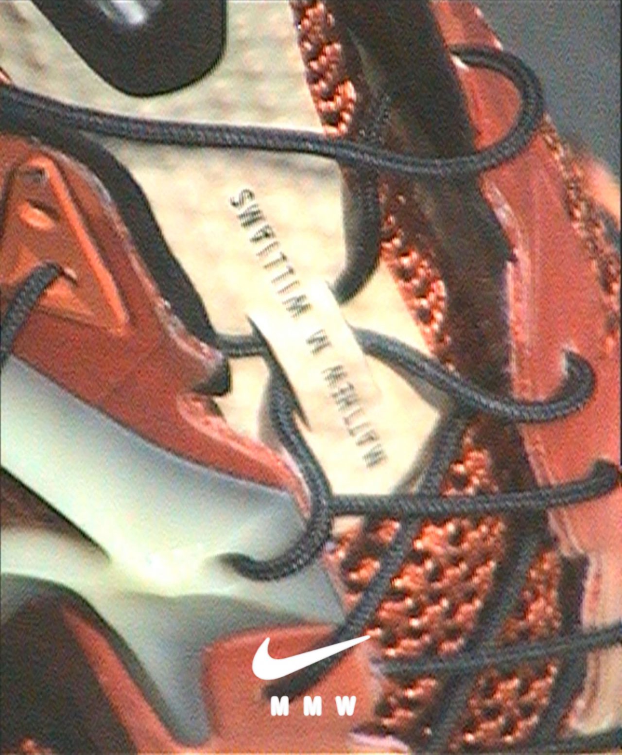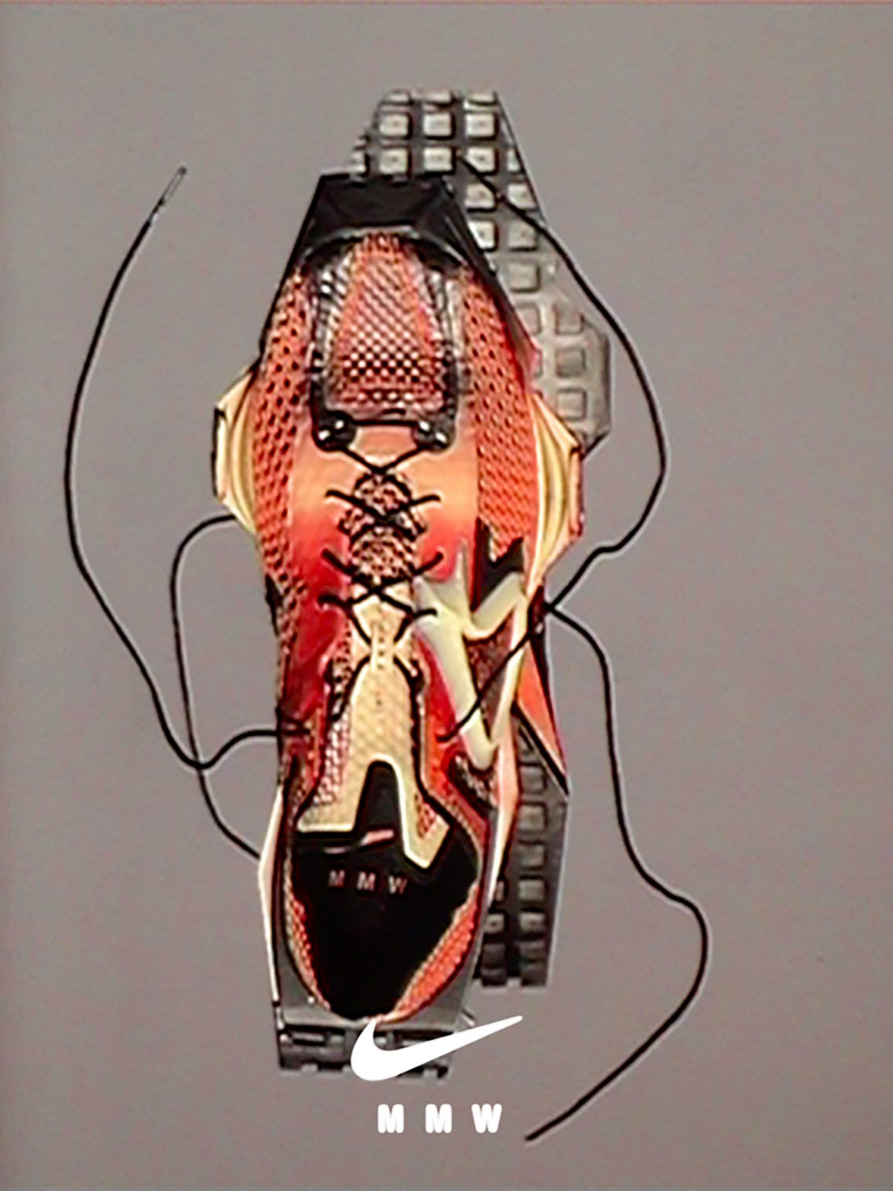 「MMW ズーム 4」ですね!これは、Nike がランニング向け技術として開発していたイノベーションから⽣まれたものです。⾃分のシューズのソールユニットをデザインできたことを幸運に思っています。私たちは、強固で機械的なクッショニングを作るというアイディアを模索していました。従来のフォームを使ったシューズが快適で安定性があるというのは普通のことですが、その構造に疑問を持ってみたのです。前に進むようなユニークな感触のあるものを作りたいと考え、それをシューズの形や⾊にも⽣かしています。特に3、4の異なるトーンの⻩褐⾊や⾚を⽤いた⾊を⽤いていますが、出来上がりにとても満⾜しています。