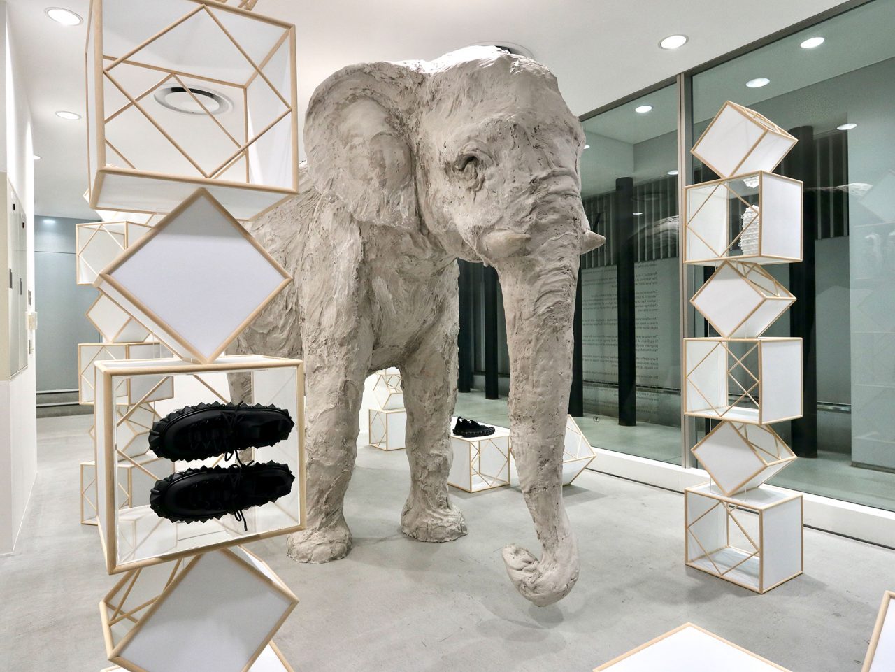 DSMG では、スニーカーの先行発売に合わせて、特別なインスタレーションも展示。両クリエイティブ ディレクターのインスピレーションを表現するべく、シェルターを思わせるミニマルなデザインの構造物が1Fのエレファントスペースに設置される。ここで使用された木材や紙などは、いずれも環境負荷の低い素材というところも注目したいポイントだ。