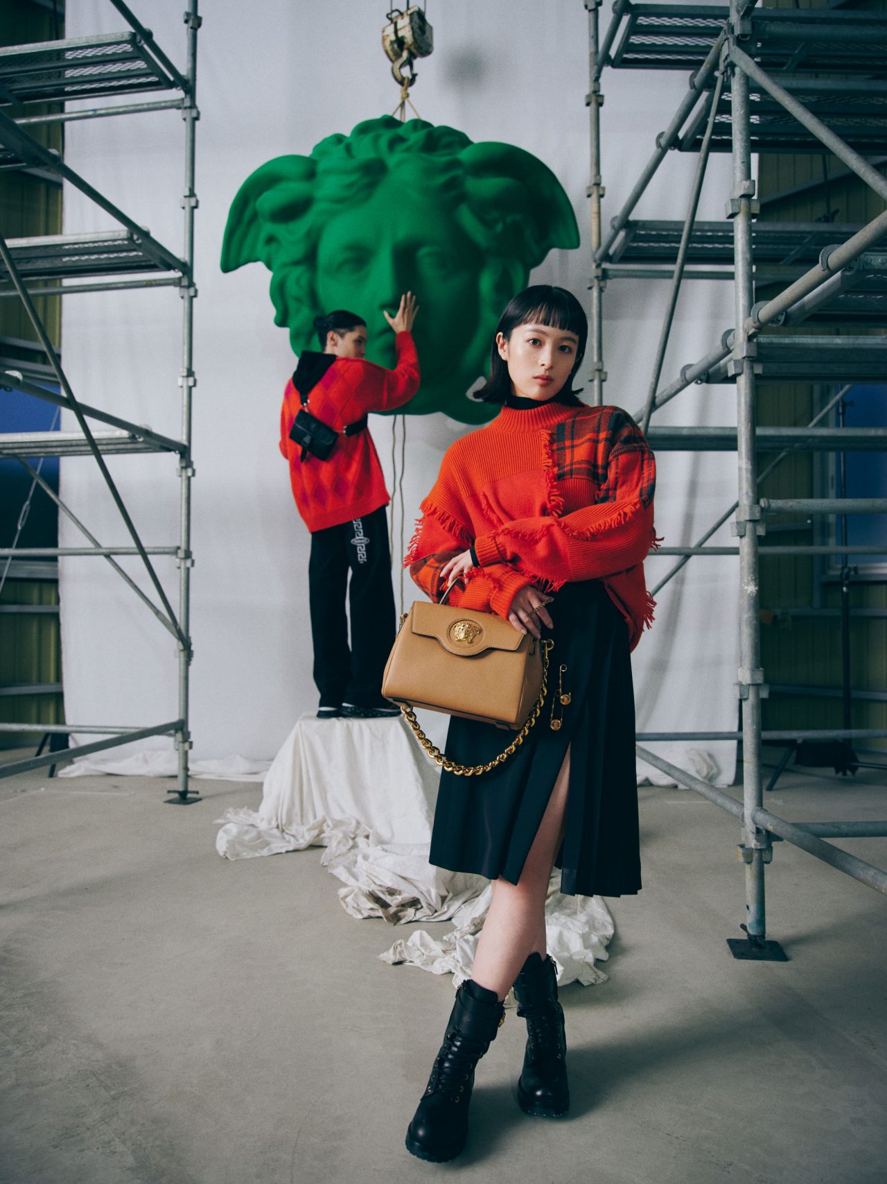 清野菜名は今回、日本で撮影された2021年プレフォールキャンペーンにも出演。2021年秋冬ランウェイショーからインスピレーションを受けた同キャンペーンは、神話的なヴェルサーチェの迷宮を舞台に、清野が巨大なメドゥーサと出会うインパクト抜群のビジュアルに仕上げられている。2021年プレフォールコレクションに身を包んだ清野の手元には、「ラ メドゥーサ」バッグが。VERSACE から新たに登場したアイコンバッグだ。