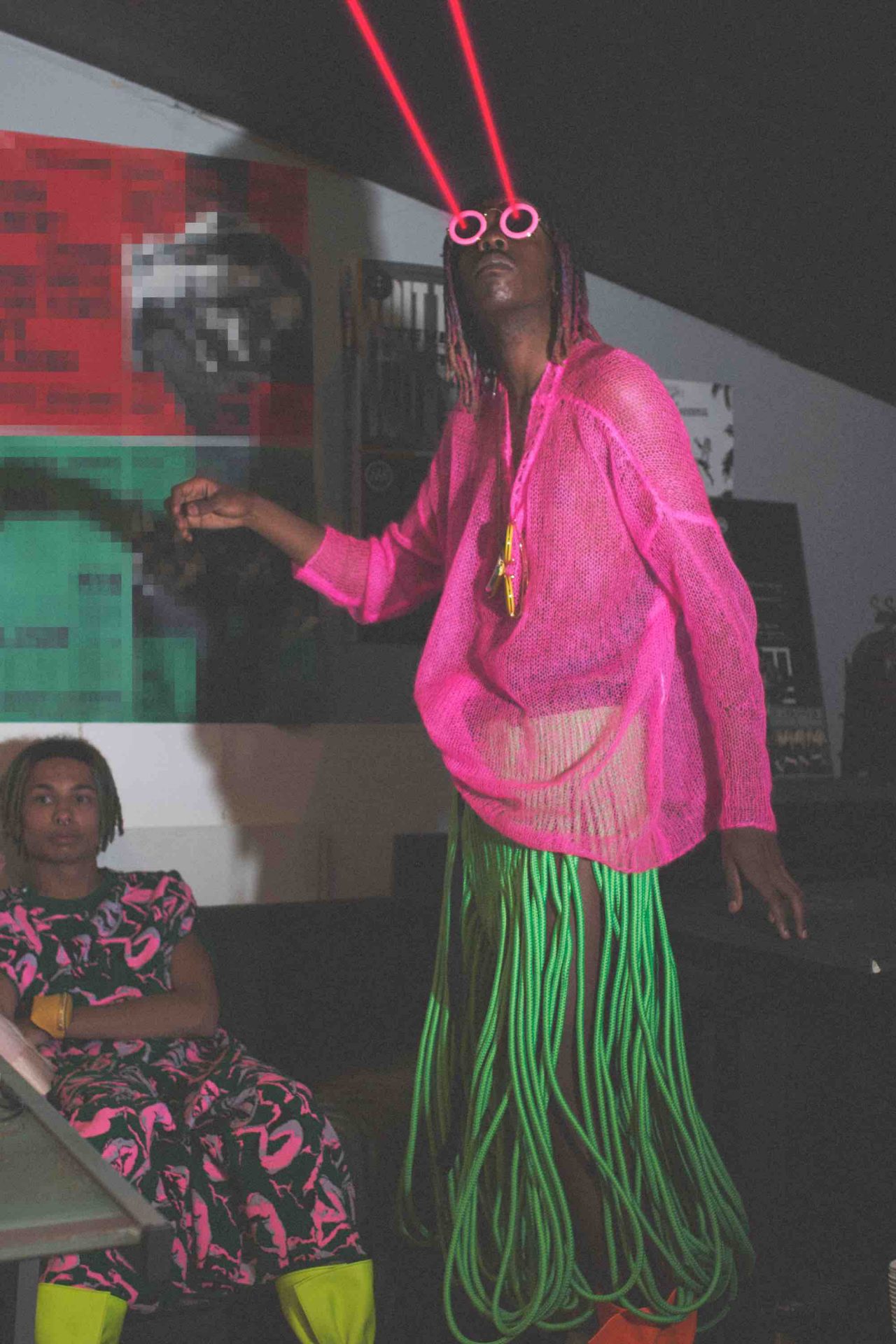 加えて、Florian Krewer のアートワークと David Sims の写真、メンズランウェイコレクションのルックブック、ウィメンズプレコレクションのルックブックがポスターになり、暗闇で光る星のステッカー300枚、そして蛍光のイエローレザーのスラップ ブレスレットが「夜遊び」の気分を盛り上げる。