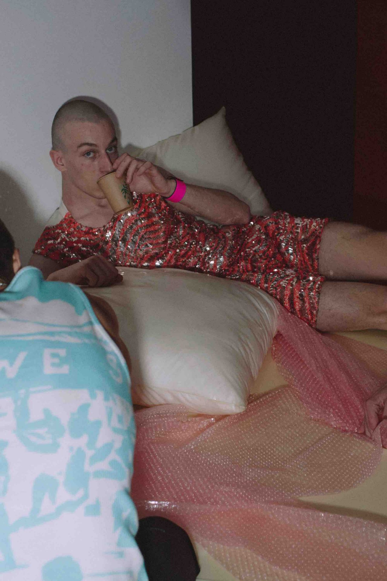 Jonathan Anderson が映像内で語っている通り、本コレクションのテーマの一つでもある「夜遊び」に大きなインスピレーションを与えたのは、ニューヨークを拠点に活動するドイツの芸術家 Florian Krewer (フロリアン・クルーワー)。絶妙な色合いのカラーパレットが印象的な同氏の作品は、自身が撮った写真や見つけた写真をベースに、自由でありながらカオスなキャラクターを通して、街の公共スペースで繰り広げられる衝突や欲望といったテーマを掘り下げているという。