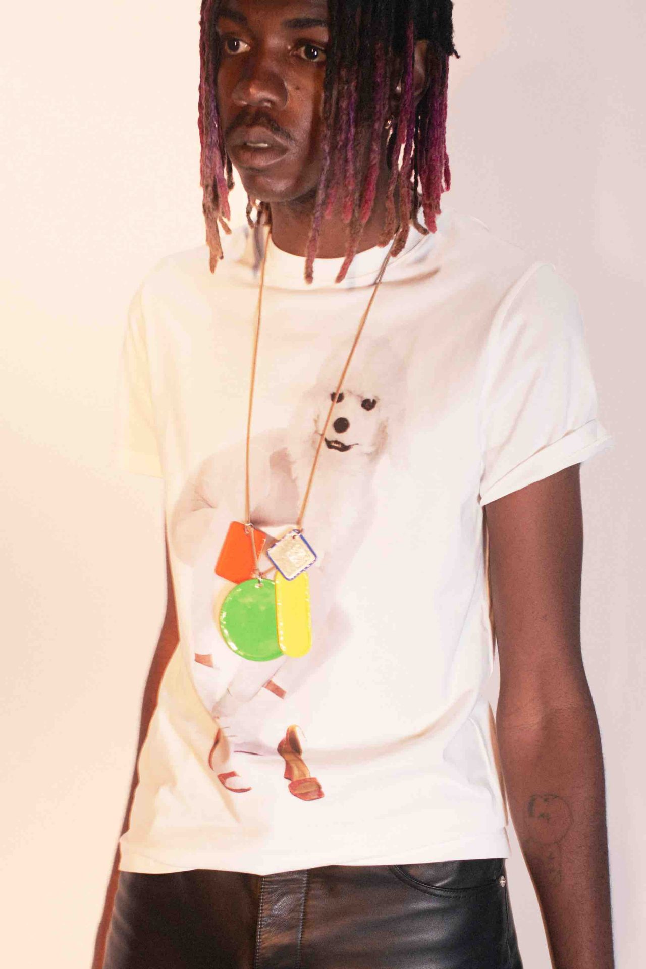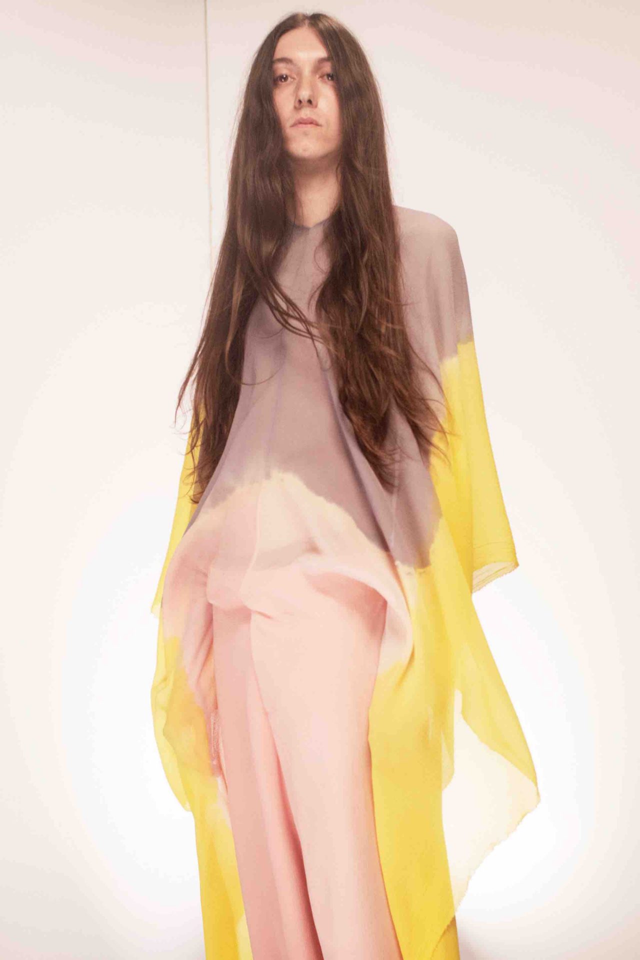 コレクションもまた、抽象的な形状を単純化し、弾けるような極彩色を取り入れることで、実験的かつ遊び心溢れるアイテムが盛りだくさん。ドレーピングや計算された配置のカットアウトで、動くと素肌が見え隠れするデザインはセンシュアル。スパンコールが施されたアニマルプリントやプードルのイラストがプリントされたTシャツなどキッチュなアイテムも。また、レイヴカルチャーを彷彿とさせるネオンカラーのレイヤードやサイケデリックなプリント使い…快楽主義的解放とメゾンがたとえるように、抑圧から反動し、外に出かけ、思わず踊りだしたくなようなルックが揃う。