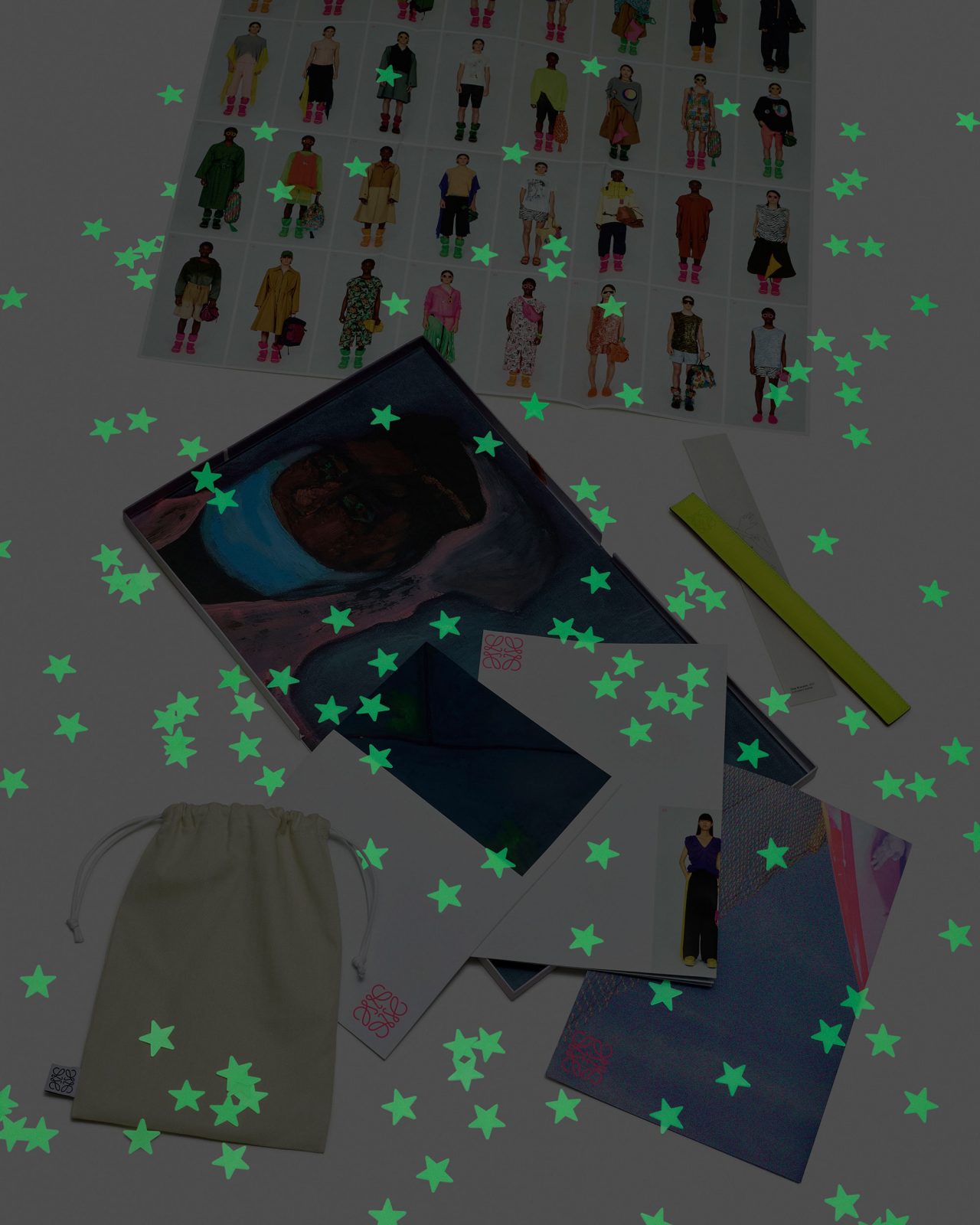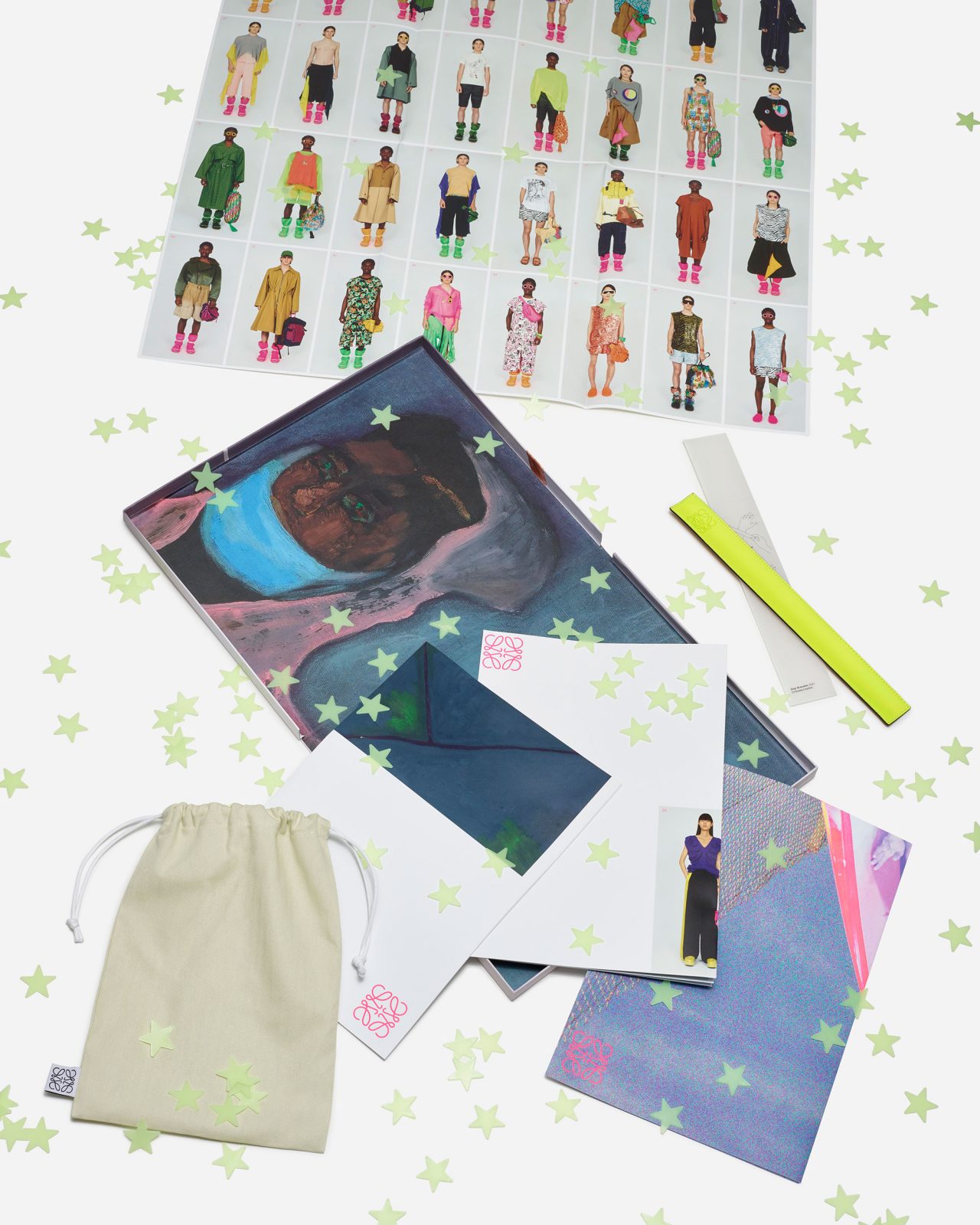 本コレクションの発表に向けて、LOEWE からお目見えしたのは2冊の本、ポスター4枚、ステッカー、ストラップブレスレットが入ったボックス。そのひとつひとつにコレクションの魅力を紐解くヒントが託されている。
