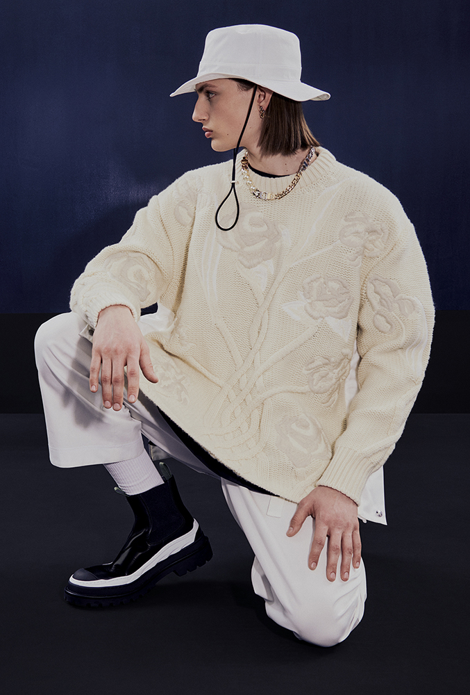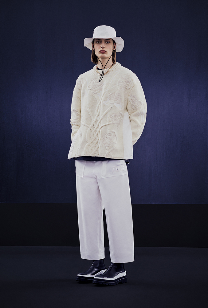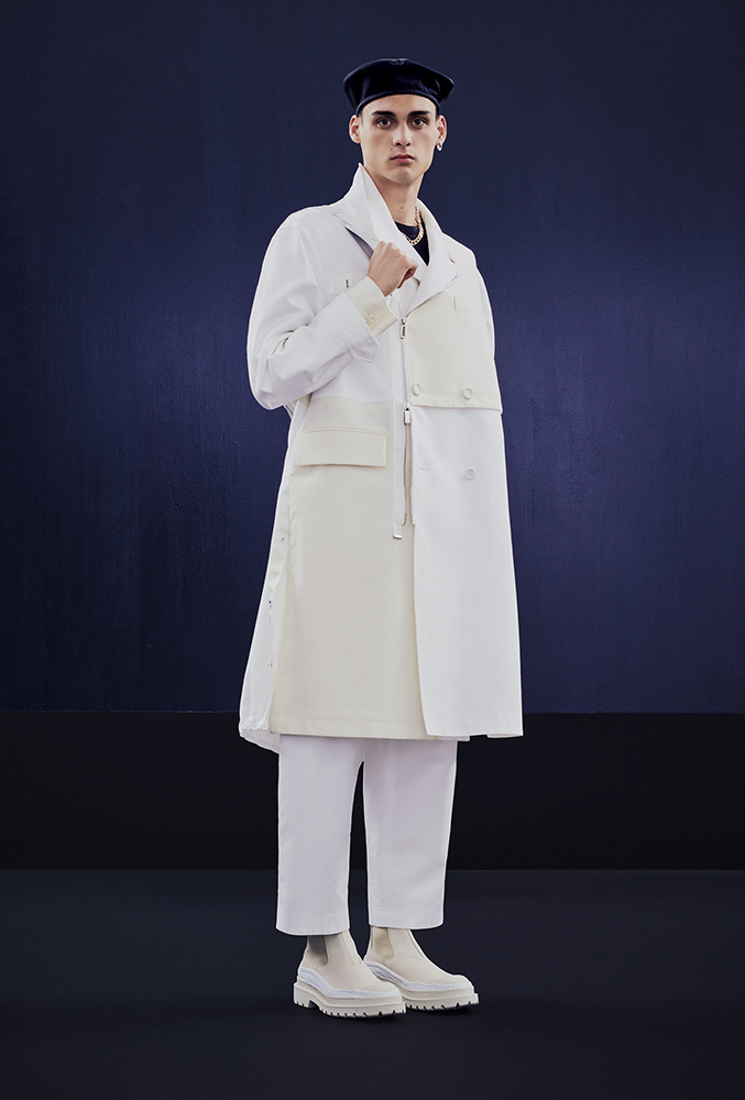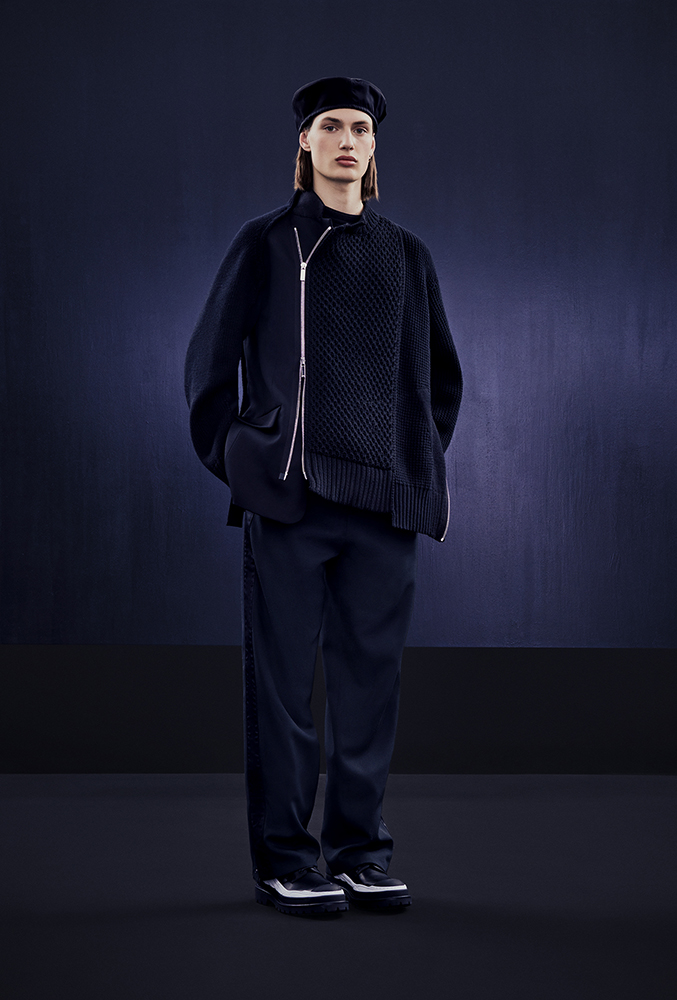 DIOR のメンズ アーティスティック ディレクターである Kim Jones (キム・ジョーンズ) と阿部千登勢がタッグを組んだ本コレクションは、両ブランドのアイデンティティを融合。DIOR のアイコニックなロゴがカスタムされ、Dior の”i”の部分にsacai のロゴを落とし込んだデザインや、DIOR の上質なテーラリングと sacai のスポーツウェアのテイストを兼ね備えたアイテムなど、パリと東京のクリエイティブな交流がコレクション全体に色濃く反映されている。