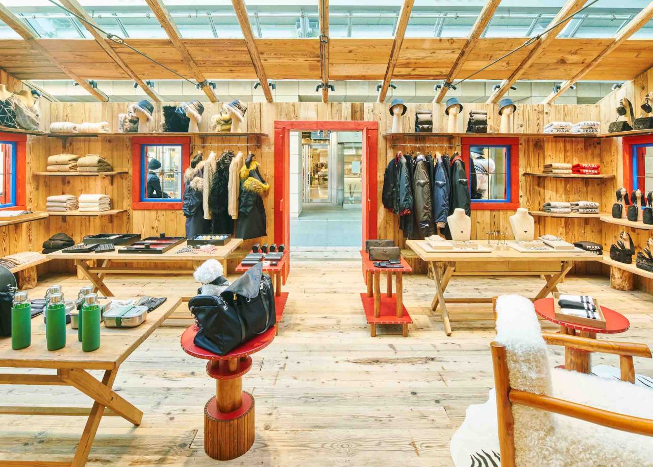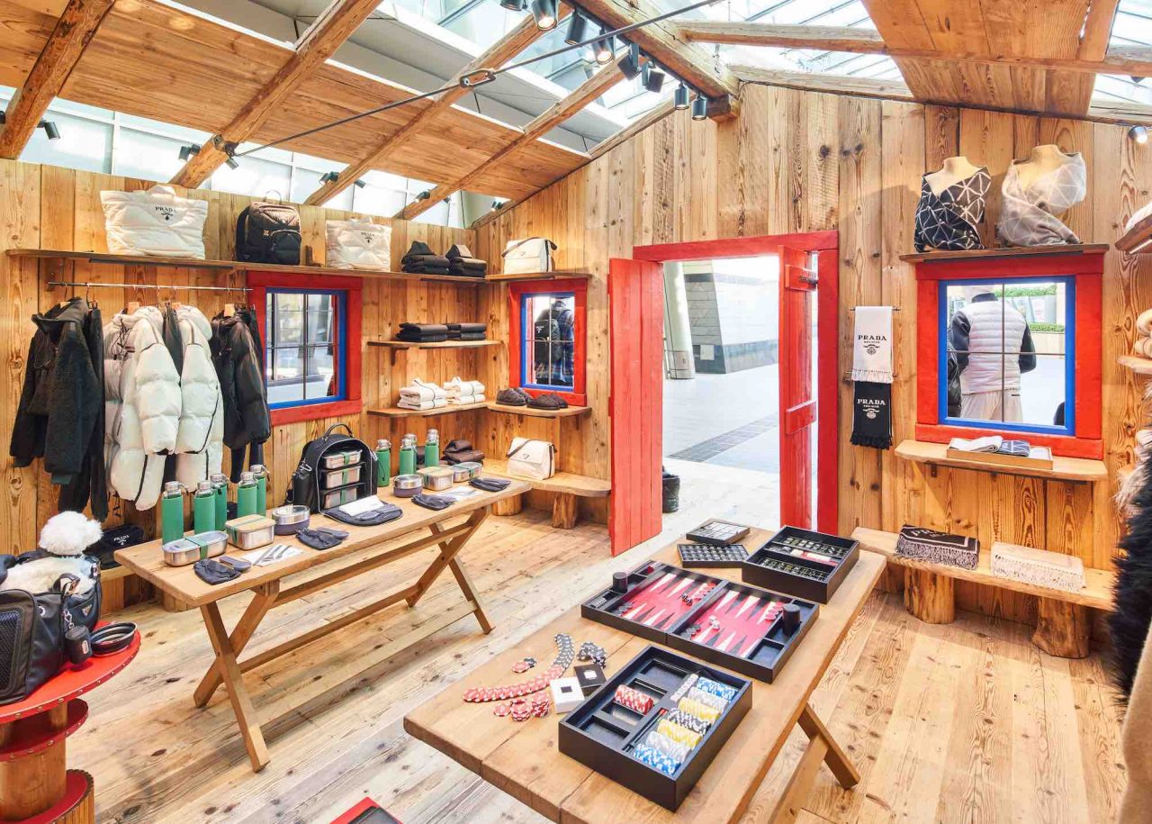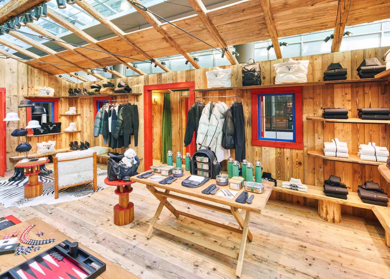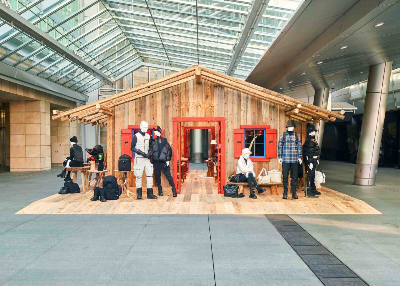 来るウィンターシーズンに向けて、ウェアやアクセサリーだけでなく、スキーやスノーボード、スキーゴーグルなどウィンタースポーツにちなんだアイテムもセレクションされた「PRADA CHALET」は、六本木ヒルズの開放的な空間の中、大胆にもアルプスの山小屋を再現。イタリア・アルプスに何十年も保存されている硬い古材で作られた高山建築の建物を詳細に研究した結果から生まれた精巧なセットは、すべて完全に取り外して再利用できるように設計されており、使用されている希少な素材が末永く使えるように工夫されているという。