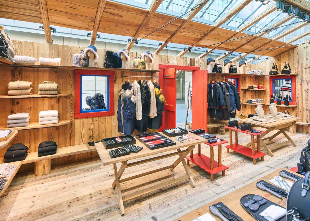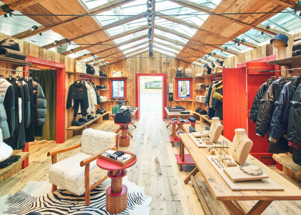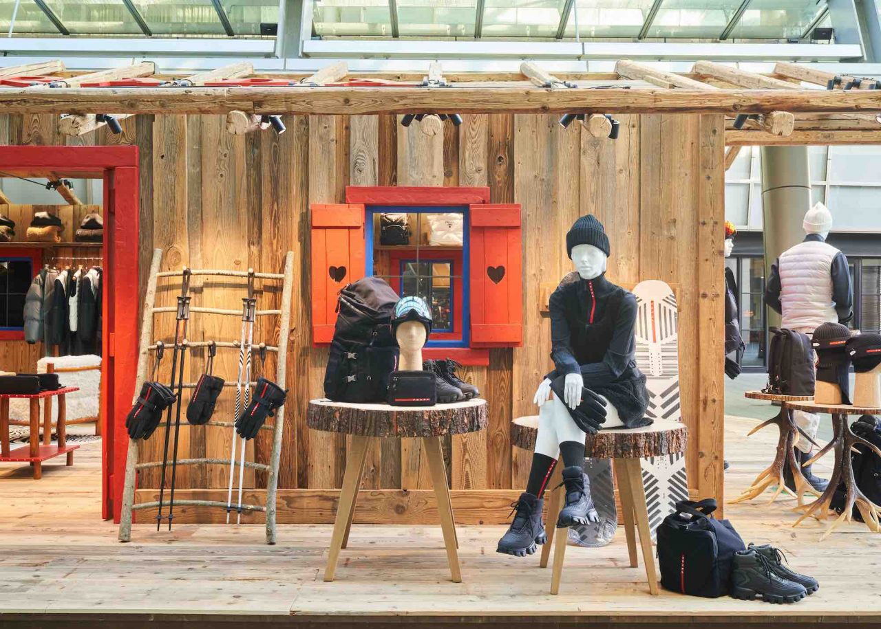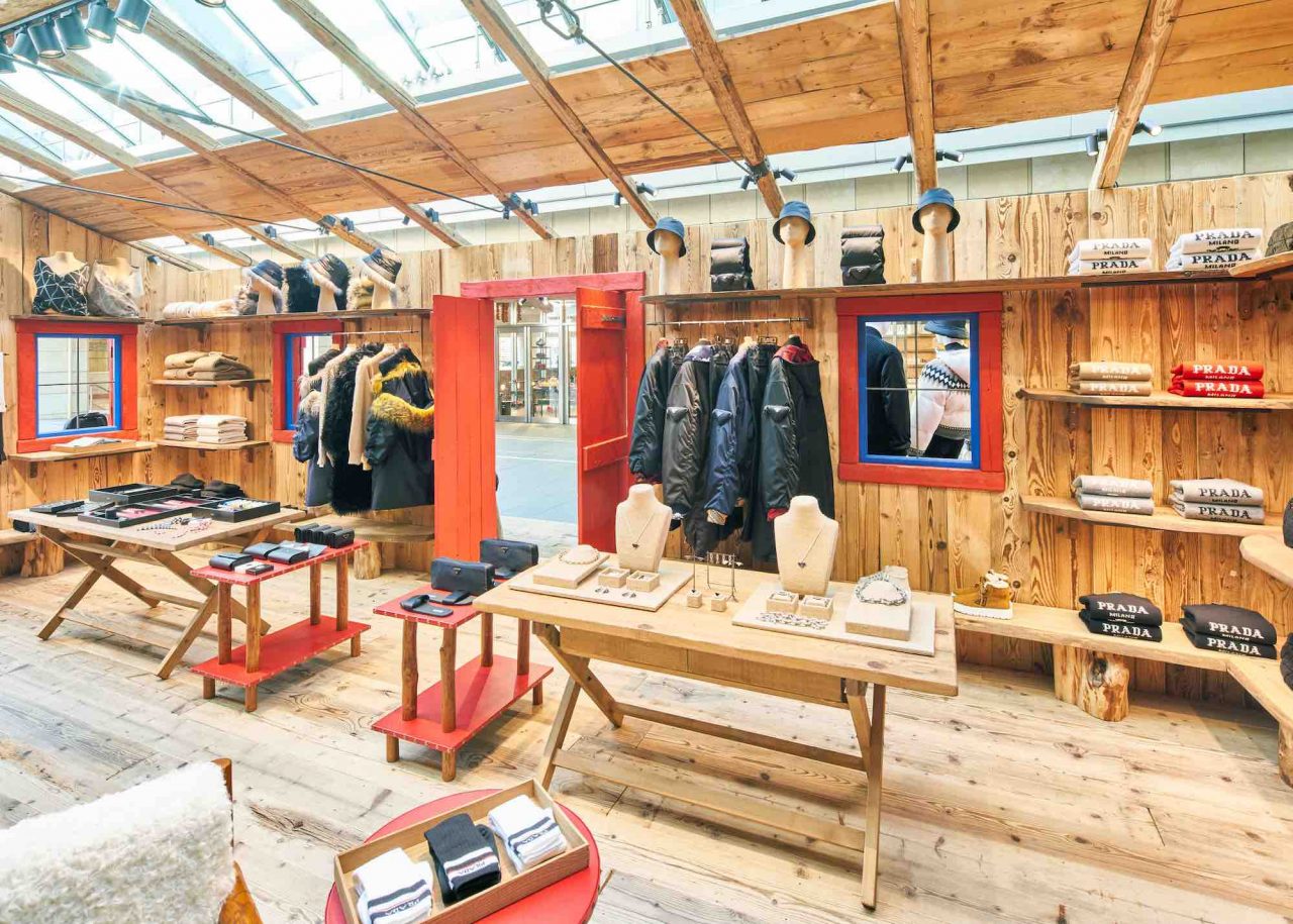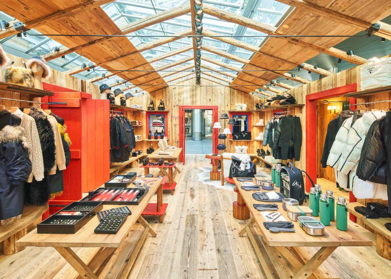 来るウィンターシーズンに向けて、ウェアやアクセサリーだけでなく、スキーやスノーボード、スキーゴーグルなどウィンタースポーツにちなんだアイテムもセレクションされた「PRADA CHALET」は、六本木ヒルズの開放的な空間の中、大胆にもアルプスの山小屋を再現。イタリア・アルプスに何十年も保存されている硬い古材で作られた高山建築の建物を詳細に研究した結果から生まれた精巧なセットは、すべて完全に取り外して再利用できるように設計されており、使用されている希少な素材が末永く使えるように工夫されているという。