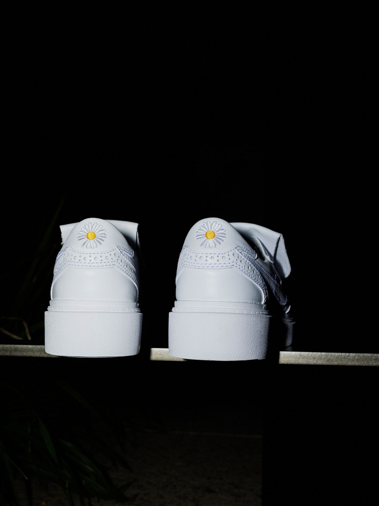 かかとのタブには、G-DRAGONが手がけるファッションブランド PEACEMINUSONE(ピースマイナスワン)のアイコンであるデイジーの花のモチーフを刺繍。「ナイキ クウォンド 1」 の名前は、韓国武道の Taekwondo(テコンドー)と D-DRAGON の本名 Kwon Ji Yong(クォン・ジヨン)、Nike のスローガン “Just Do It” を組み合わせた造語だ。