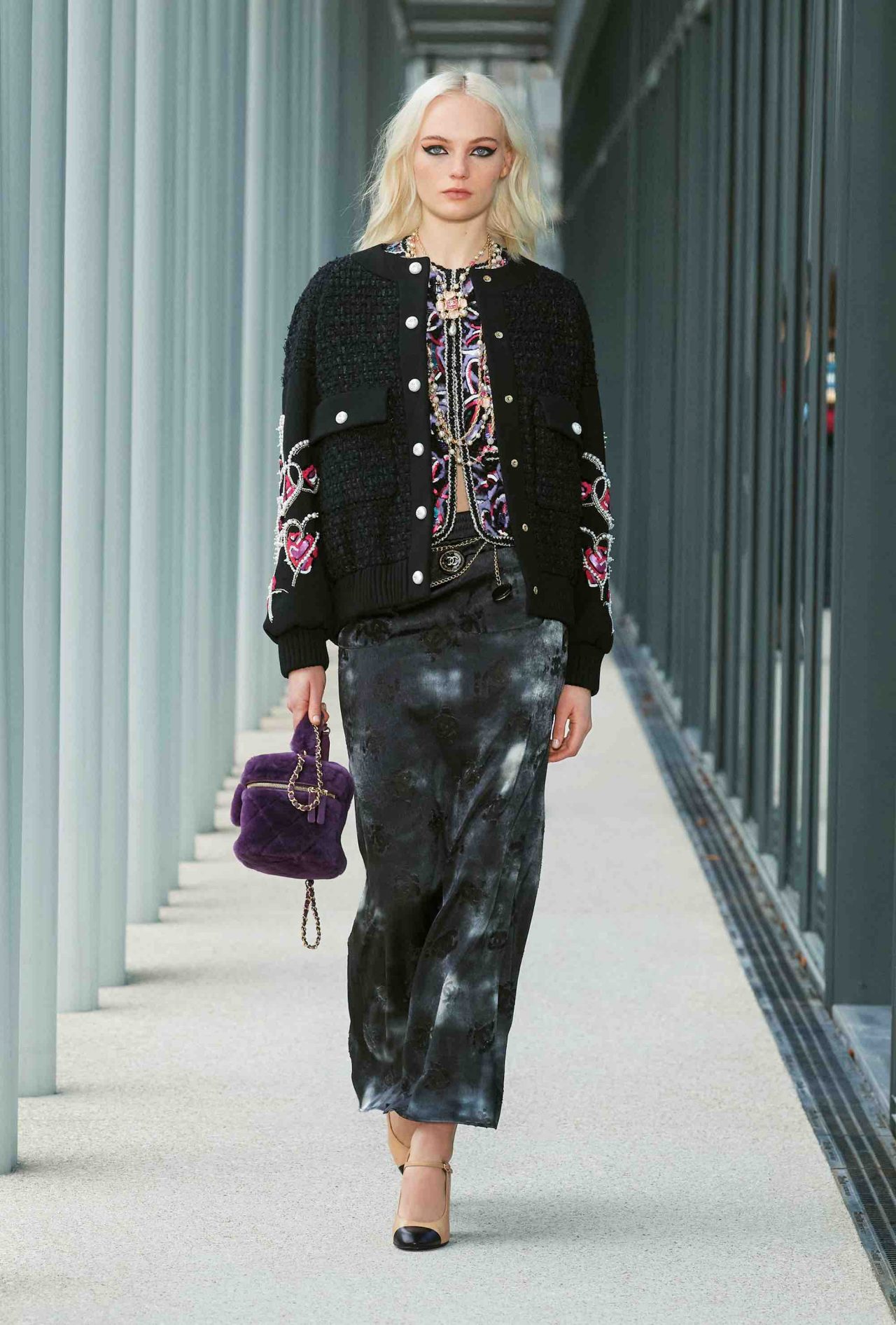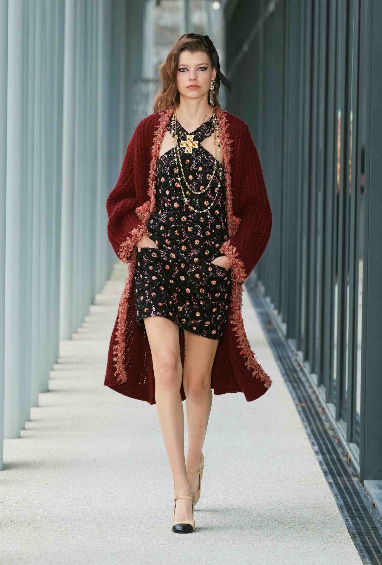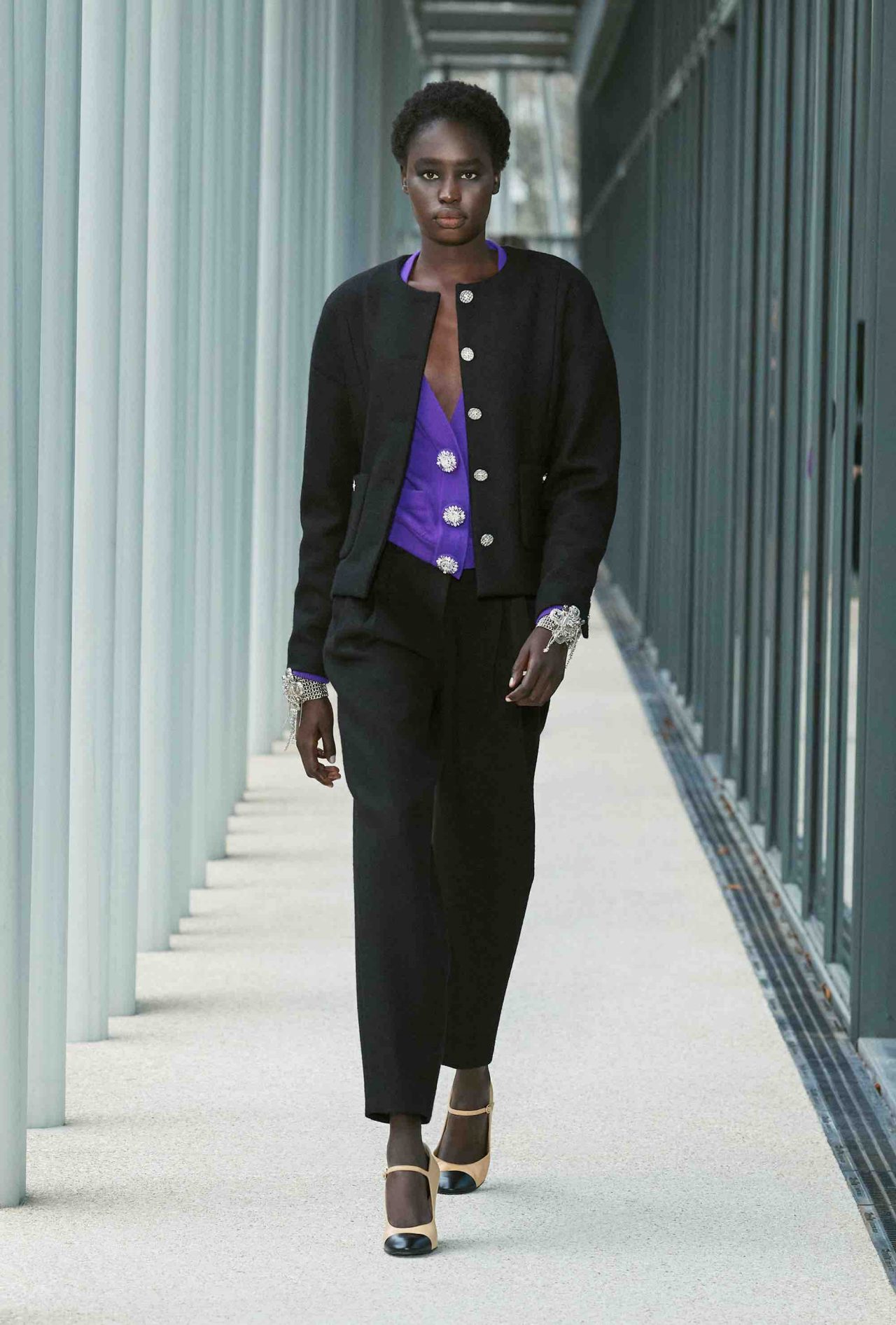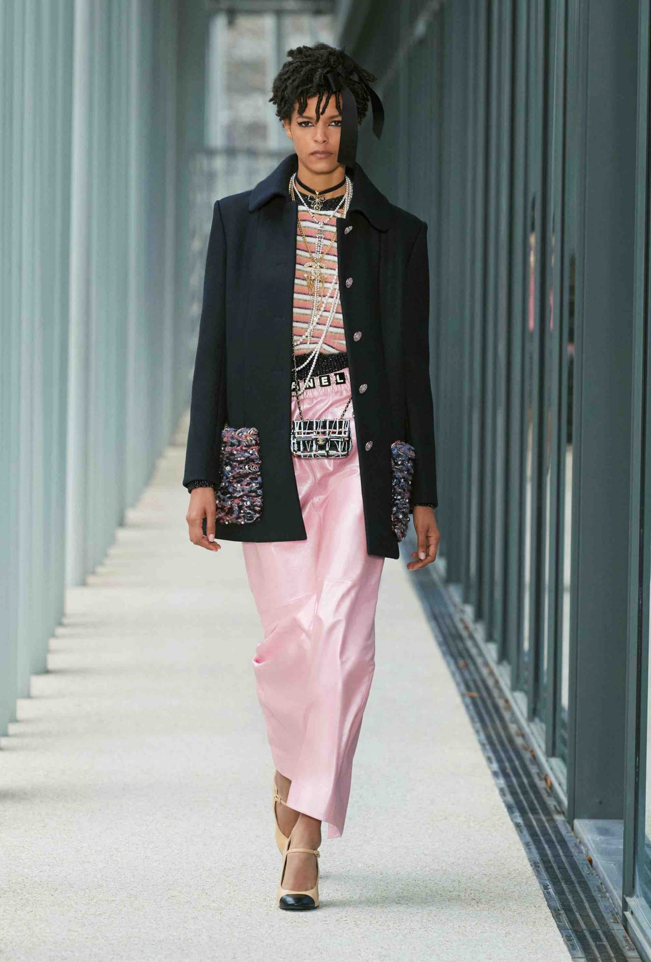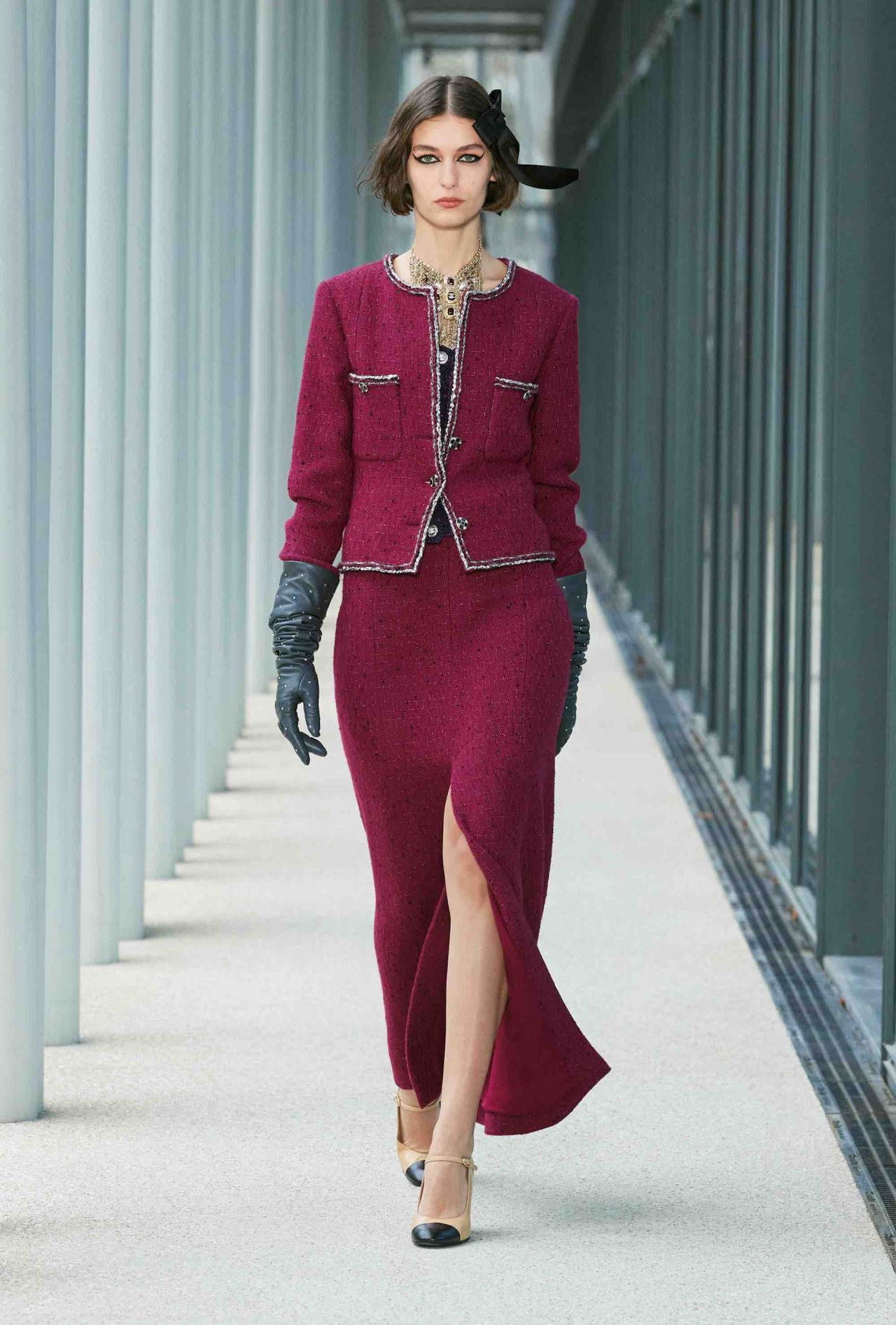 コレクション自体も、「Le19M」に共鳴するかのように都会的かつ洗練されたムード。メゾンを象徴する黒と白のバイカラーや Virginie Viard らしいフレッシュなピンクは健在ながら、シャンパンゴールドやバーガンディ、ノーブルなパープルといった深みのある色合いが差し込まれ、どこかマチュアな仕上がり。刺繍の多くも、「Le19M」の建物からインスピレーションを得たという。