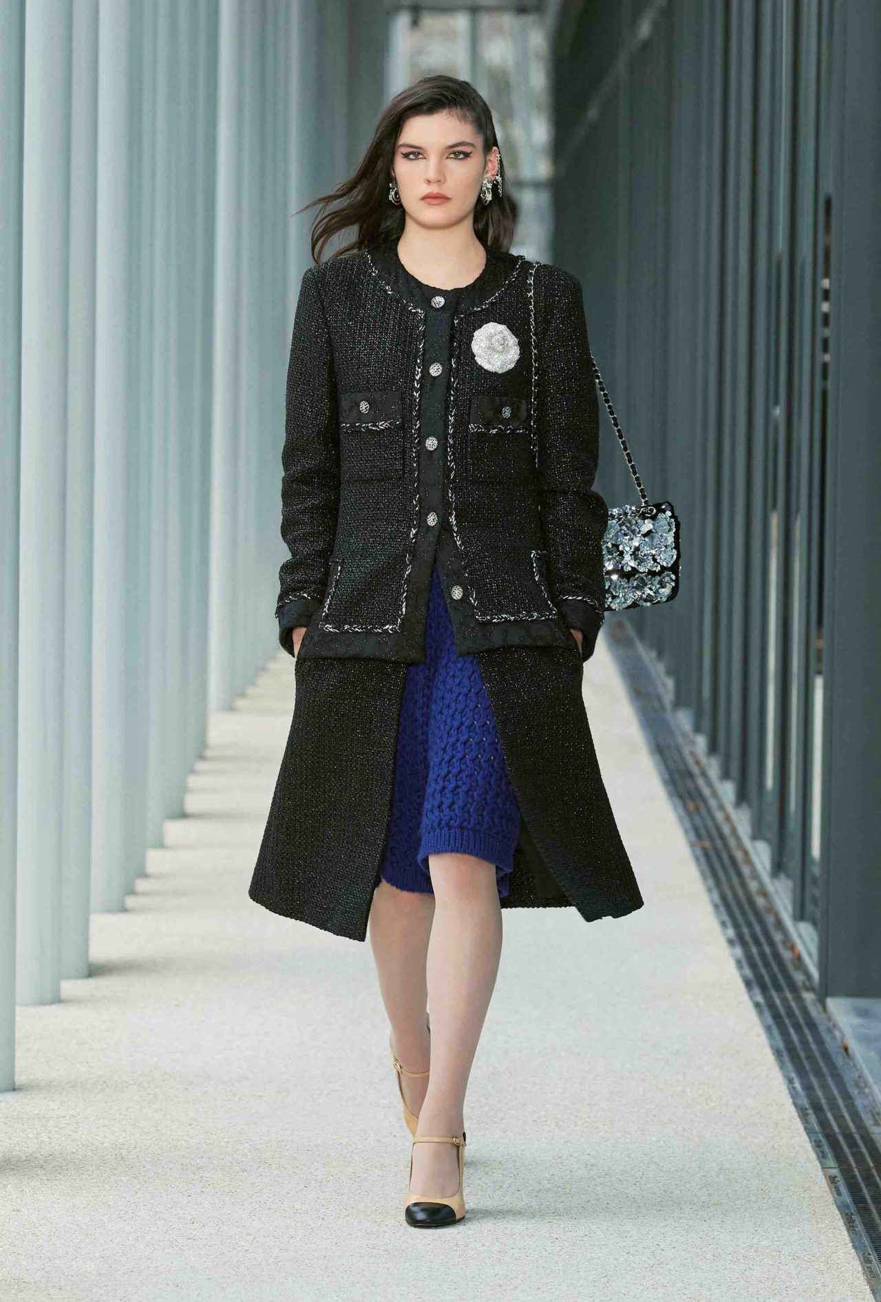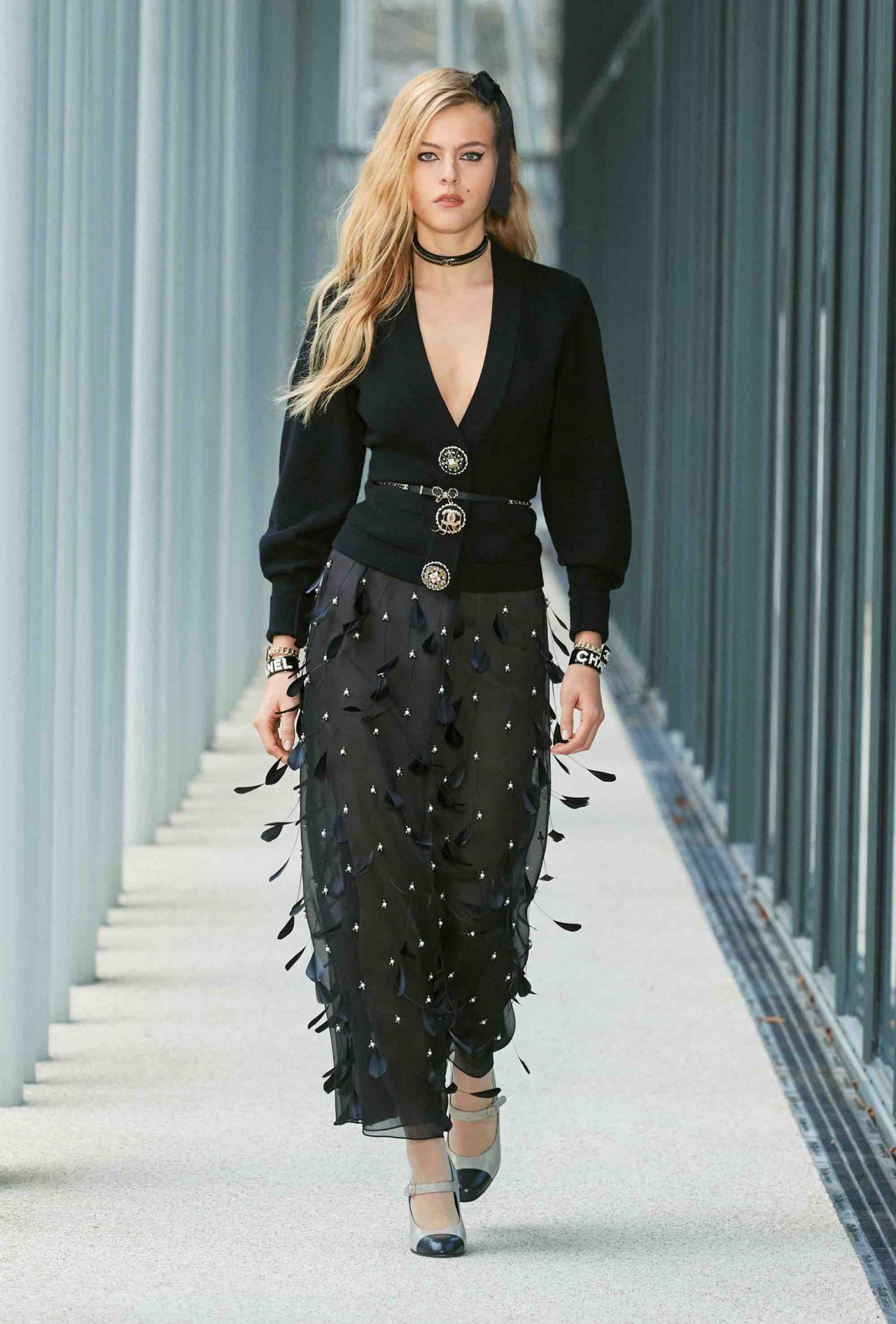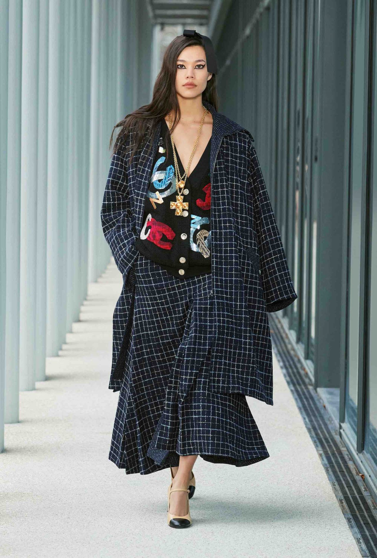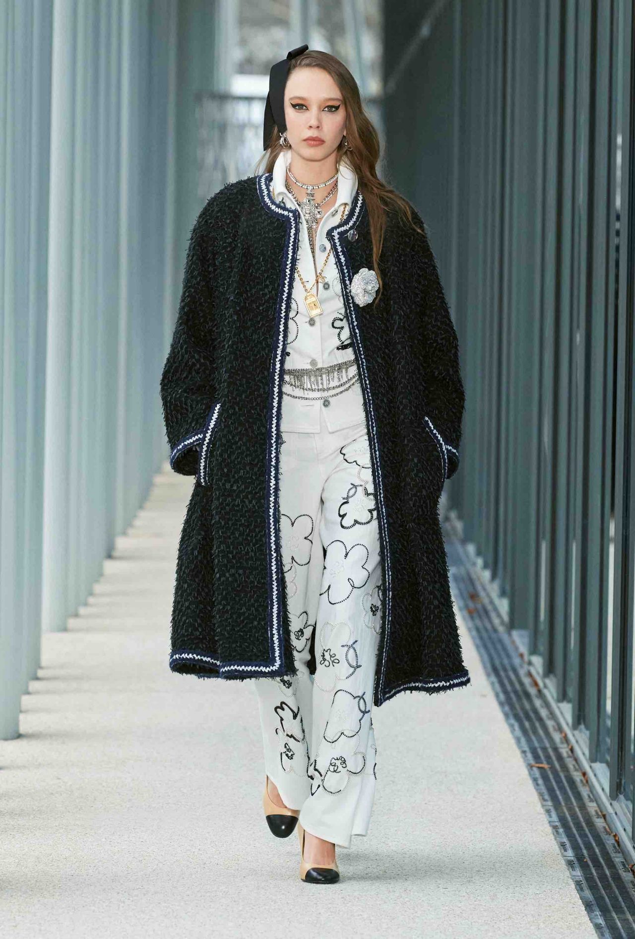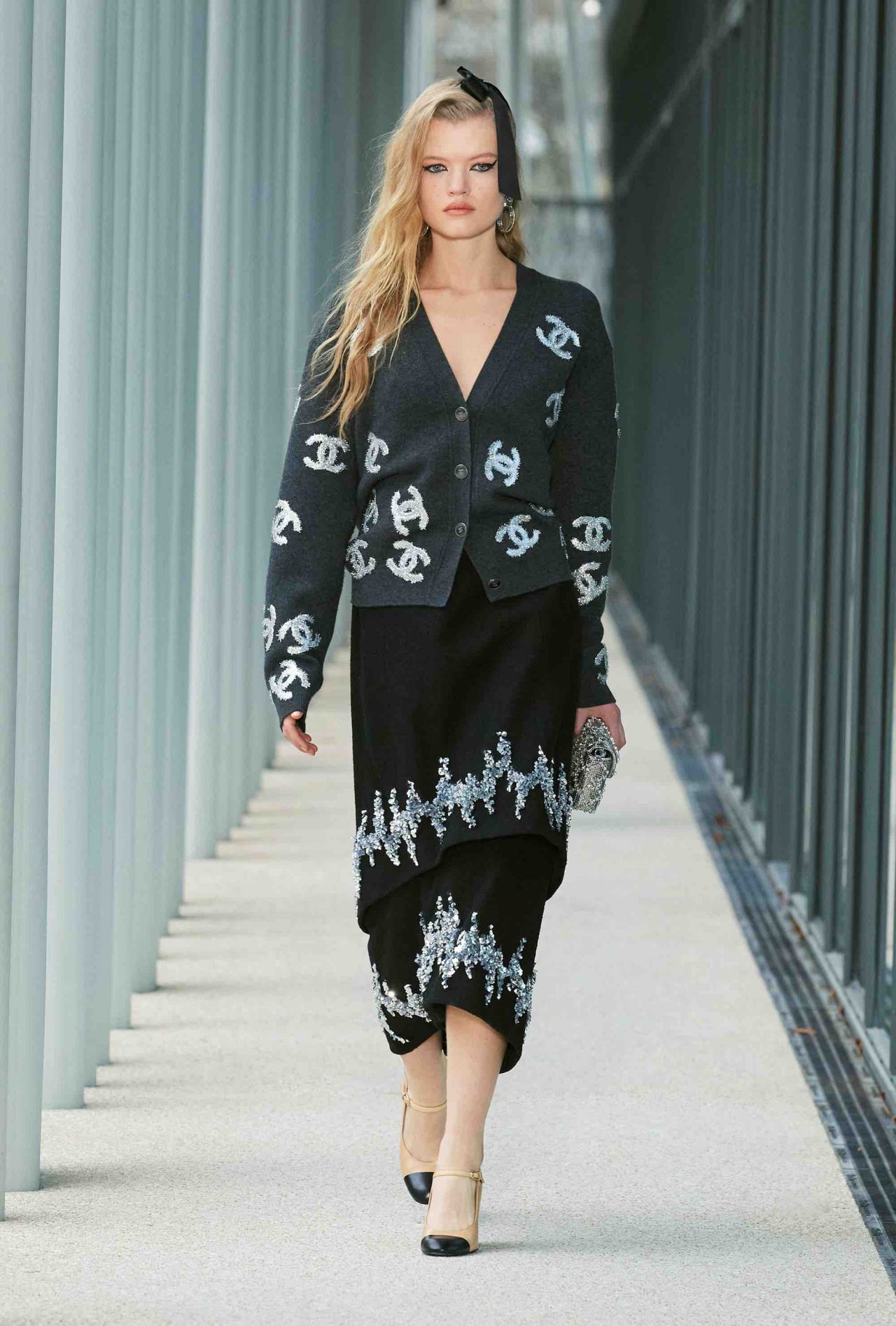 ファーストルックは、くるぶしまで伸びるシングルコートに素足、ベージュ×ブラックのヒール付きメリージェーンの組み合わせ。シンプルな装いながら、アトリエ モンテックスが手がけたシルバーのグラフィカルなスパンコールの刺繍やメゾン ミッシェルによるリボンのヘッドピースがルックを華やかに盛り上げる。ツイードジャケットやバミューダパンツ、カーディガンやニットなど、いずれもウェアラブルなアイテムが並んだが、ディテールを見れば見るほど職人たちの卓越した技術を堪能することができる。モダンなグラフィカルパターンや大胆なアクセサリー使いとメゾンが誇るサヴォアフェールの化学反応が、「Le19M」の幕開けを盛大に祝福した。