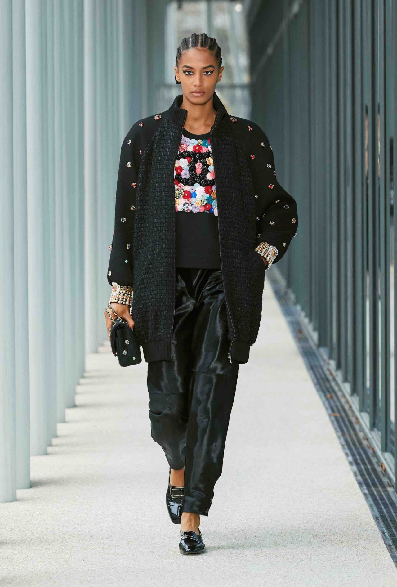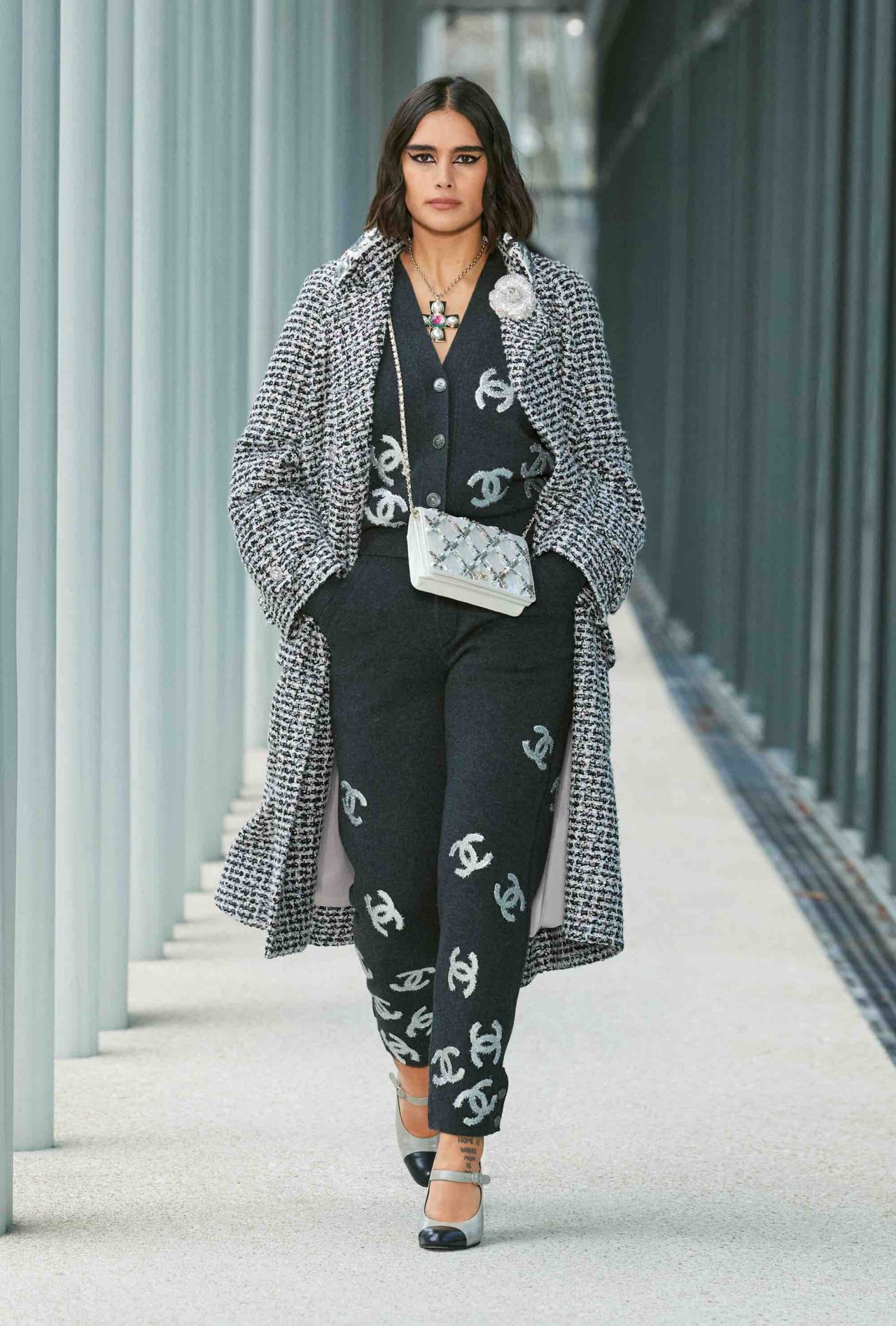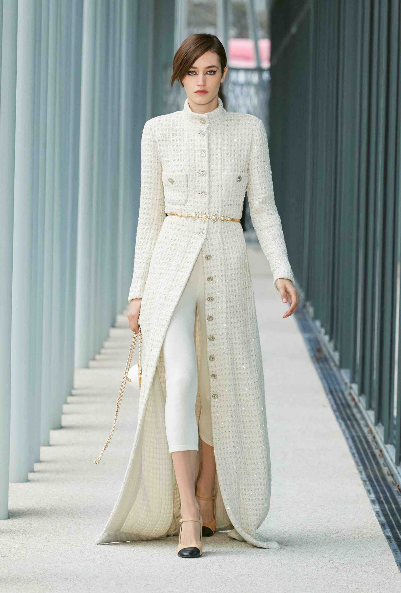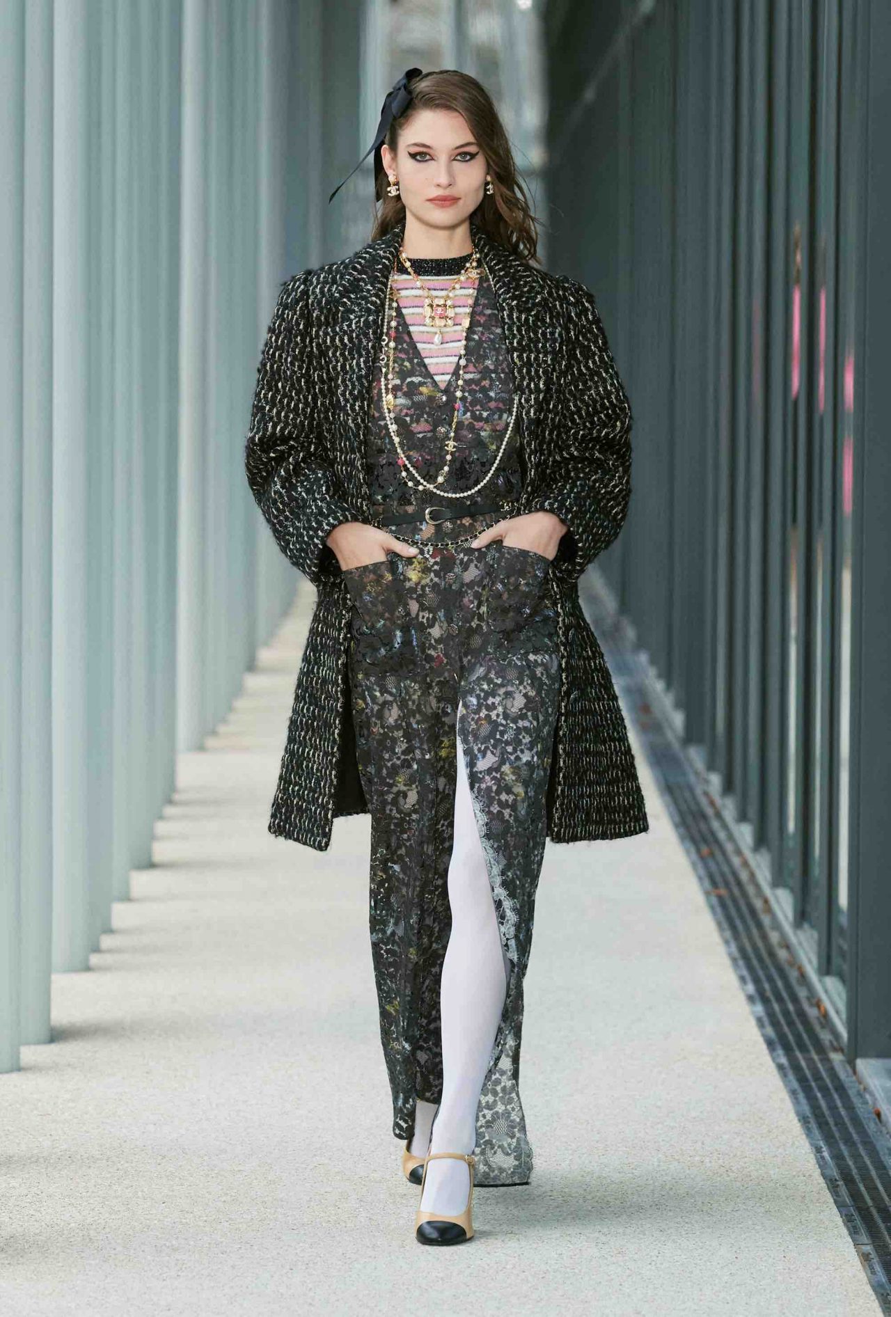 ファーストルックは、くるぶしまで伸びるシングルコートに素足、ベージュ×ブラックのヒール付きメリージェーンの組み合わせ。シンプルな装いながら、アトリエ モンテックスが手がけたシルバーのグラフィカルなスパンコールの刺繍やメゾン ミッシェルによるリボンのヘッドピースがルックを華やかに盛り上げる。ツイードジャケットやバミューダパンツ、カーディガンやニットなど、いずれもウェアラブルなアイテムが並んだが、ディテールを見れば見るほど職人たちの卓越した技術を堪能することができる。モダンなグラフィカルパターンや大胆なアクセサリー使いとメゾンが誇るサヴォアフェールの化学反応が、「Le19M」の幕開けを盛大に祝福した。