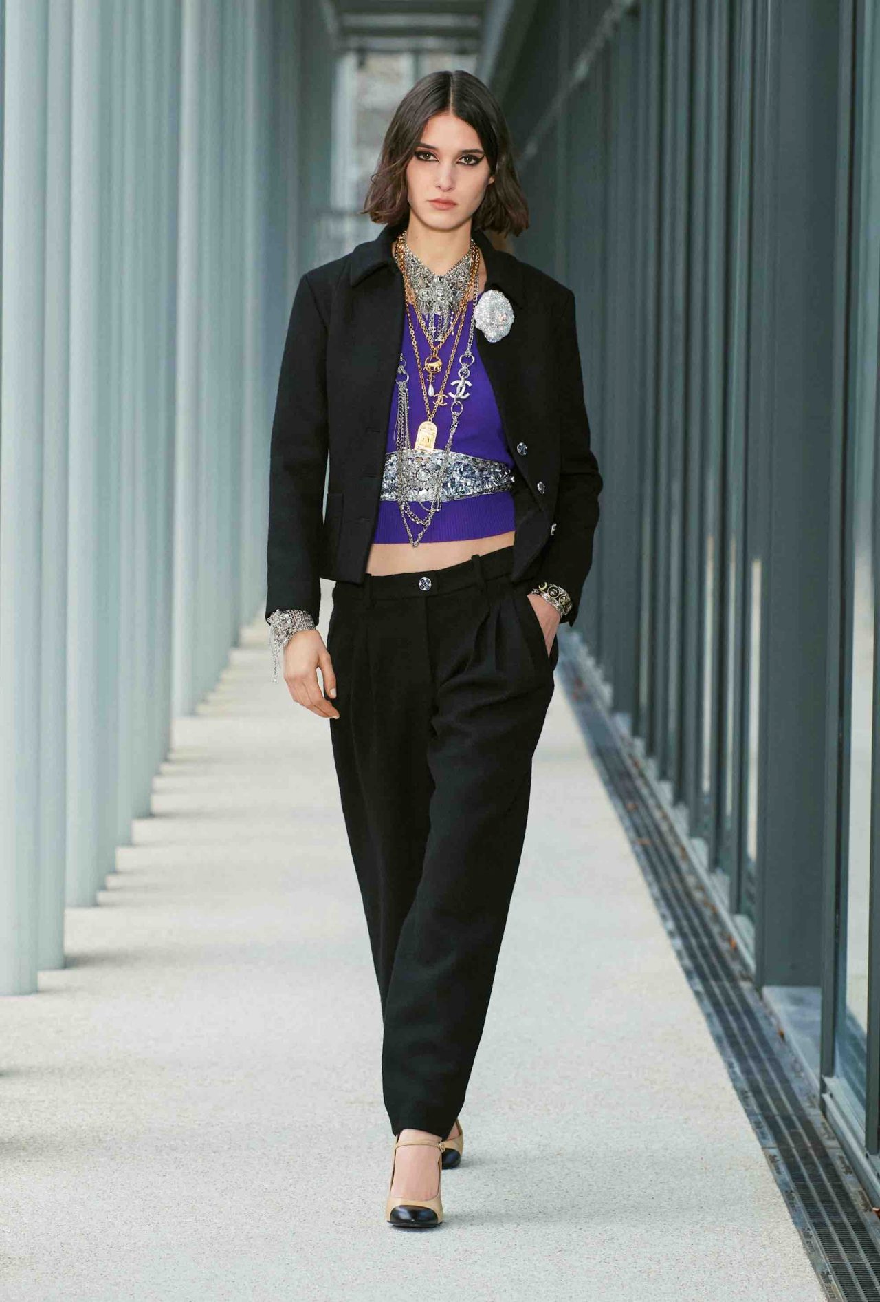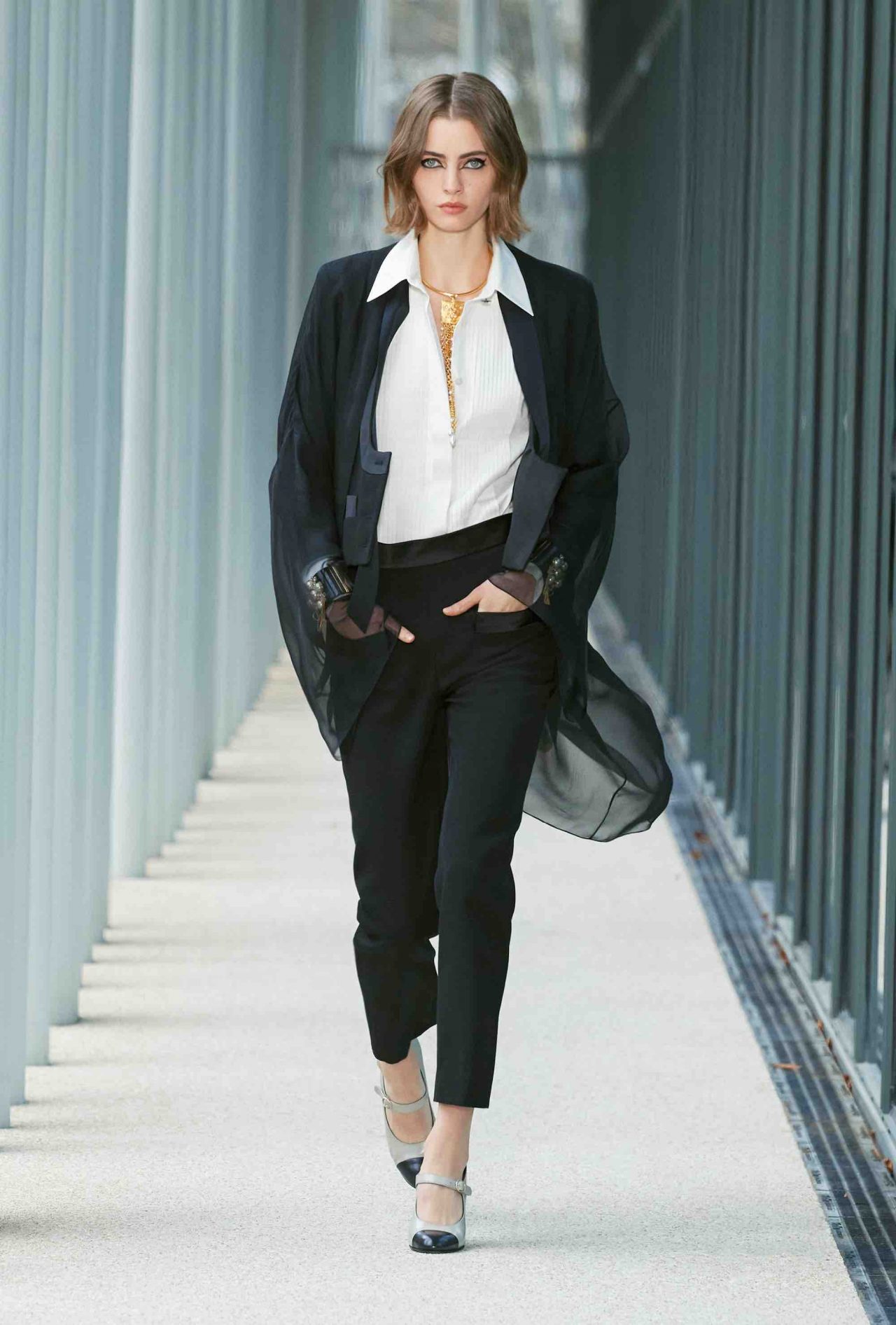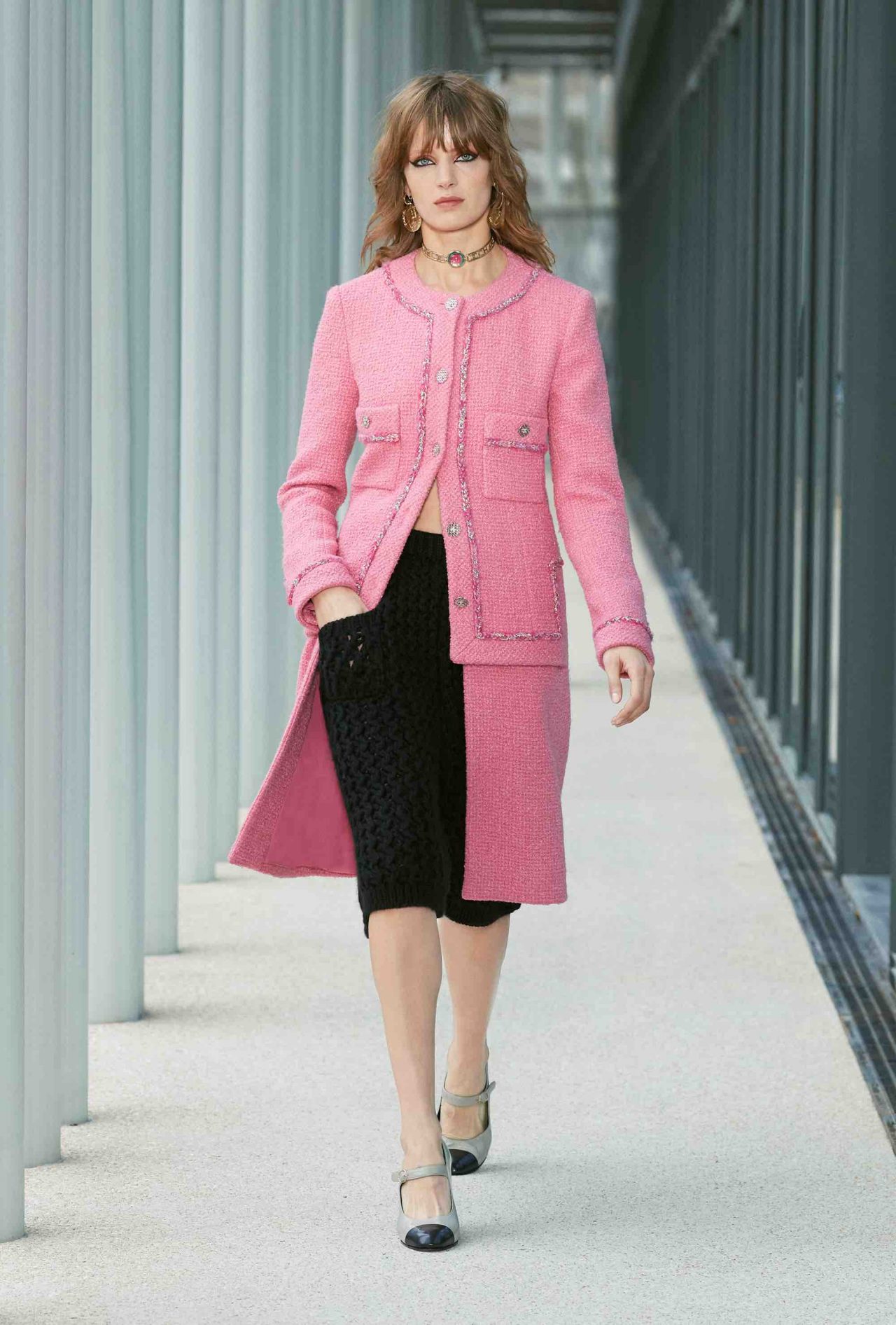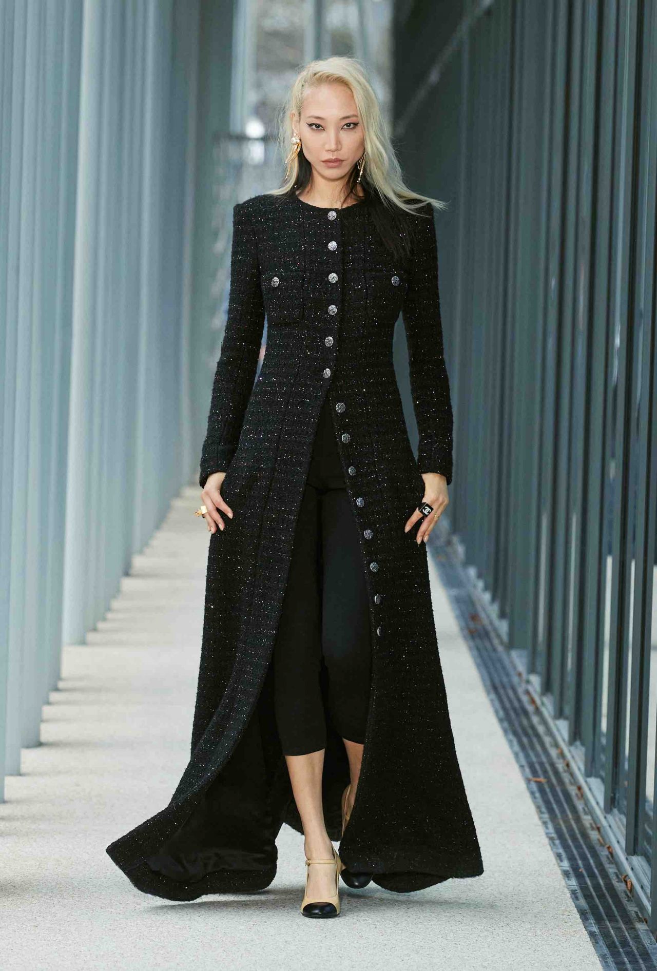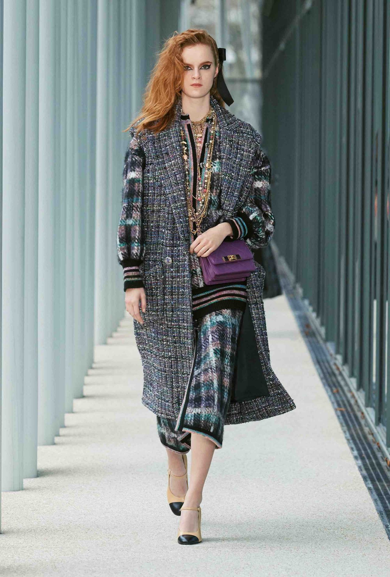 ファーストルックは、くるぶしまで伸びるシングルコートに素足、ベージュ×ブラックのヒール付きメリージェーンの組み合わせ。シンプルな装いながら、アトリエ モンテックスが手がけたシルバーのグラフィカルなスパンコールの刺繍やメゾン ミッシェルによるリボンのヘッドピースがルックを華やかに盛り上げる。ツイードジャケットやバミューダパンツ、カーディガンやニットなど、いずれもウェアラブルなアイテムが並んだが、ディテールを見れば見るほど職人たちの卓越した技術を堪能することができる。モダンなグラフィカルパターンや大胆なアクセサリー使いとメゾンが誇るサヴォアフェールの化学反応が、「Le19M」の幕開けを盛大に祝福した。