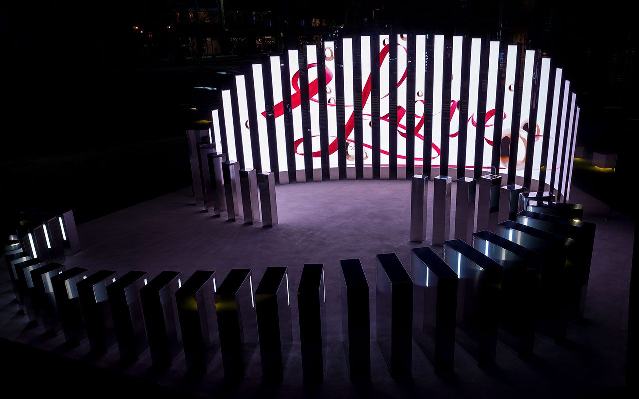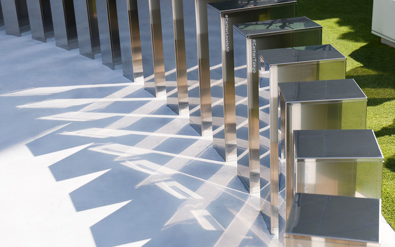 あらゆる価値観や感性が交錯する表参道の交差点を飾るのは Cartier の頭文字、C を象ったミラーの柱。一刻一刻、時をオマージュした60本のバーが連なり、光の反射によって生み出される影を楽しむことができる。