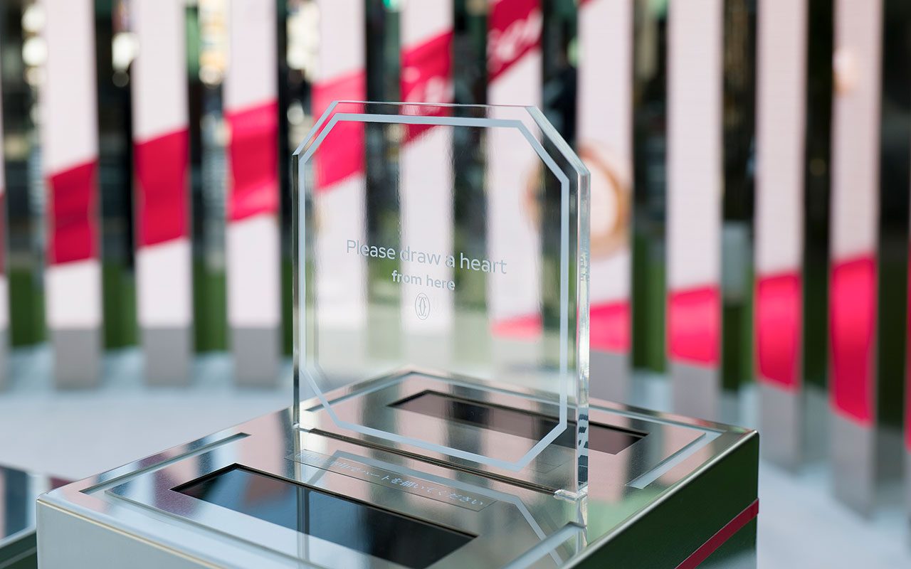 メゾンのエンブレム、パンテールに出迎えられ、中に入るとLEDスクリーンが登場。一人、そして二人、指でハートを描くと、それぞれの気持ちを反映したコンテンツが出てきて、愛を祝福してくれる。