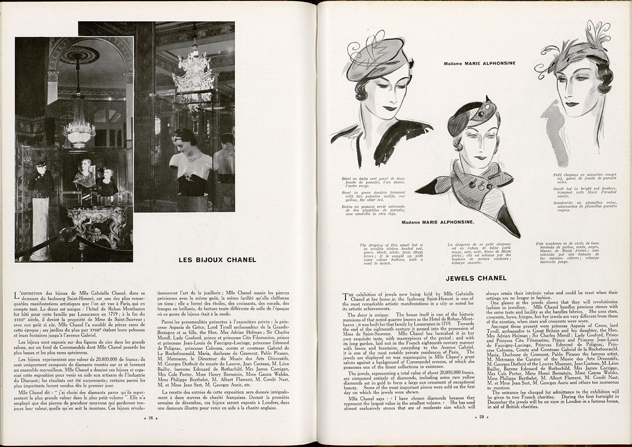 そして Mademoiselle Chanel は「Bijoux de Diamants」の発表にあたって、1932年11月7日から19日にかけての展示会の2日前の11月5日に、世界各国の記者たちや上流階級の人々が押し寄せた内覧会を開いた。内覧会は29番地にあった 彼女自身の邸宅で行い、化粧とスタイリングされた蝋の胸像が、まるで命を吹き返したかのように大理石の台座の上に置かれ、胸像の首元や手元に飾られたダイヤモンドは、鏡によって無限に増幅しており、あらゆる角度からクリエイションが見えるようになっていた。シュールレアリスムを好んだ Mademoiselle Chanel は、ジュエリーを従来のショーケースに閉じ込めることはせず、 招待客たちが庭園の上の星がまたたく空へ舞い上がったような気分にさせる舞台を作り上げた。彼女が作り上げたジュエリーのヴィジョンは、時間の経過にも、ファッションの移り変わりにも耐えうる永遠の価値を持ったものとなっている。