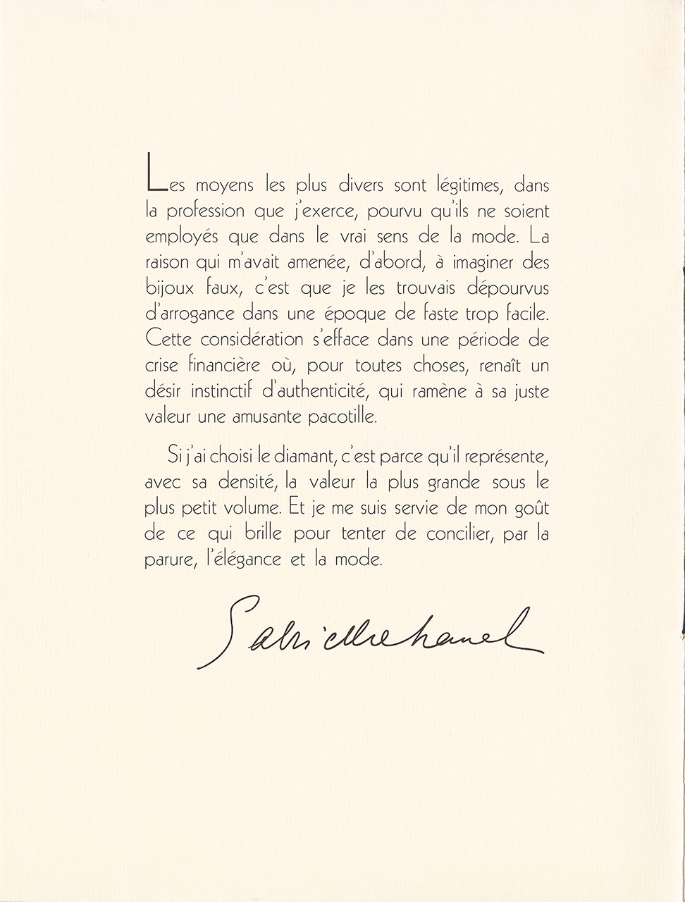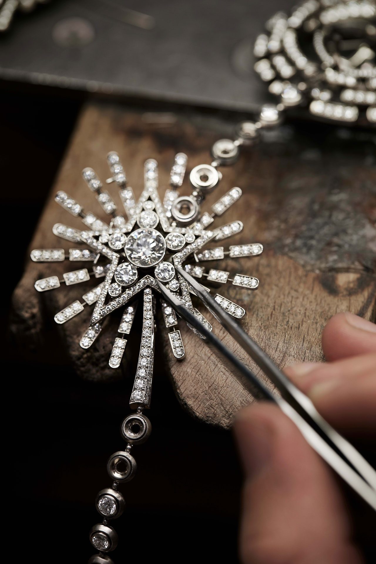 Mademoiselle Chanel が発表した「Bijoux de Diamants」 のコレクションはパリのある夏の夜のきらめく星々がインスピレーション源になっており、それは後に CHANEL の全てのハイジュエリーの礎となっている。大空に瞬く星たちを見上げながら、Mademoiselle Chanel は女性の肌と髪を、流星のシャワー、白く輝く三日月、そして燃え立つ太陽で飾ろうと決めた。彼女は極めてパーソナルな言葉でスタイルと革新的なアイデアを表現し、ルックを生み出すためにシルエットに焦点を当てた。オートクチュールの原理を取り入れ、クチュールのデザインと全く同じようにジュエリーを作り上げた。ダイヤモンドはシンプルに際立ち、控え目で目立たないジェムセッティングと伝統的なカッティングを用いて、サイズのバランスを完璧に取った。未来のジュエリーを作り出すため、Paul Iribe (ポール・イリブ) のデザインに再解釈を加え、再考を繰り返し、身体の自由な動きを妨げるクラスプを取り除き、調整できるものにした。