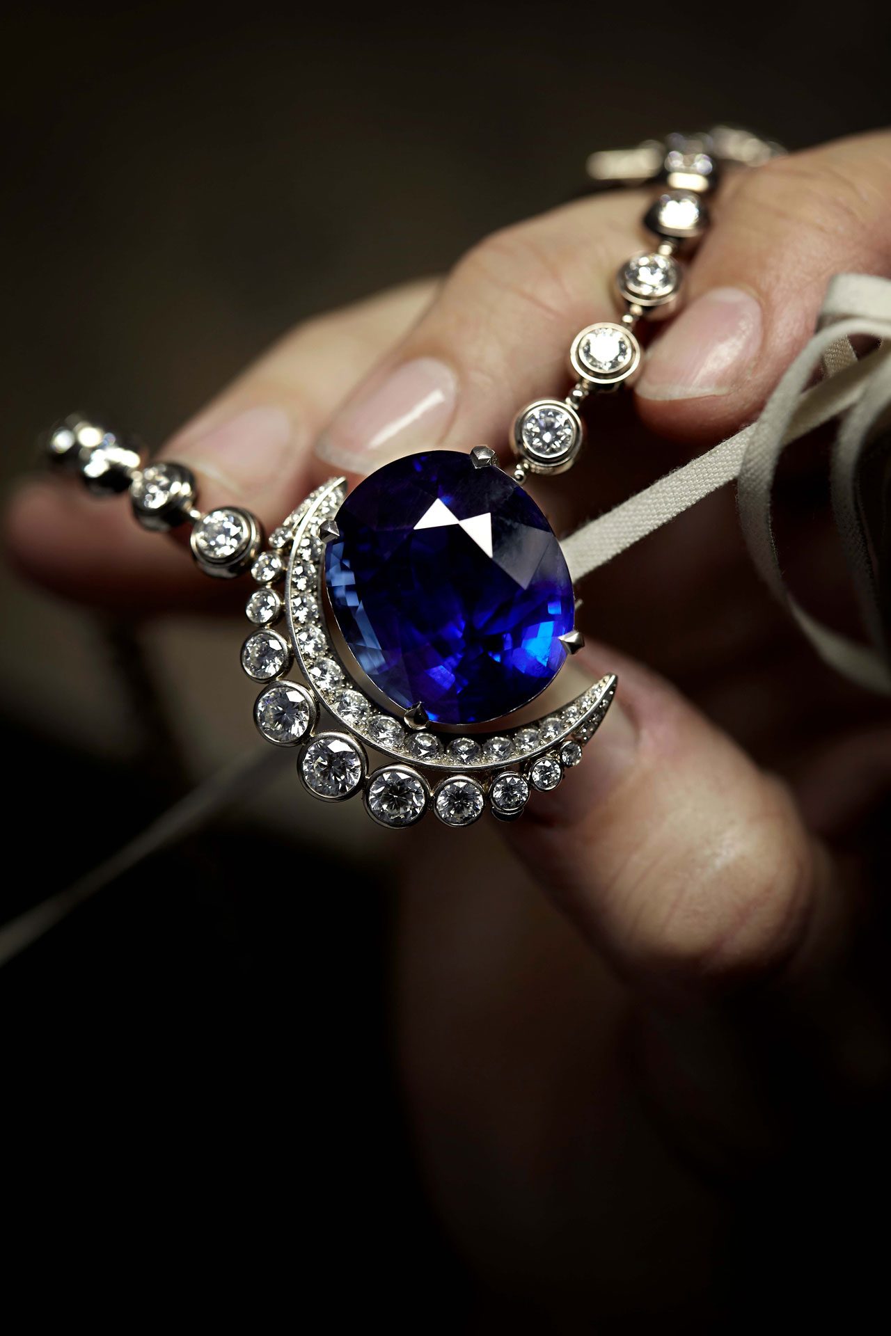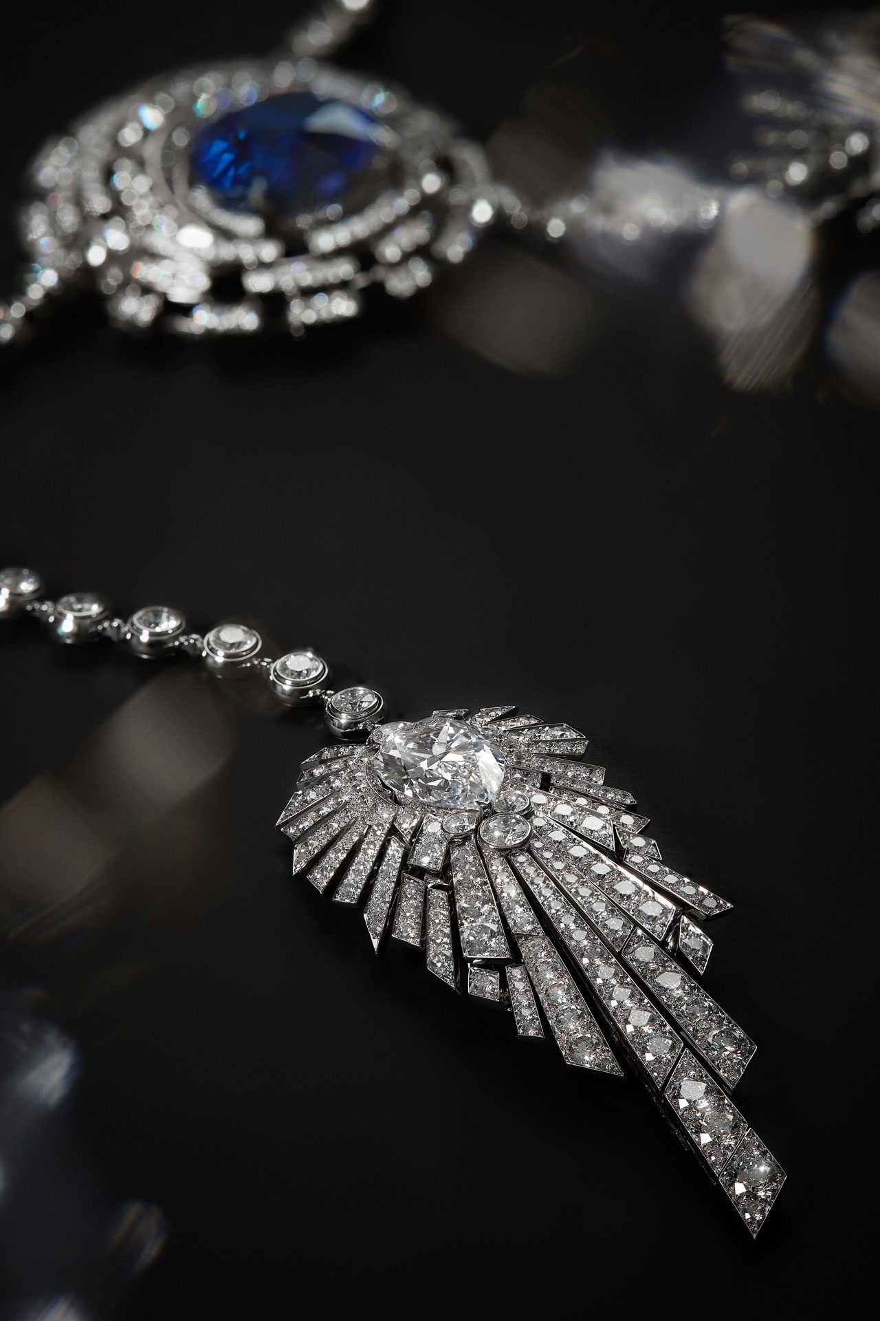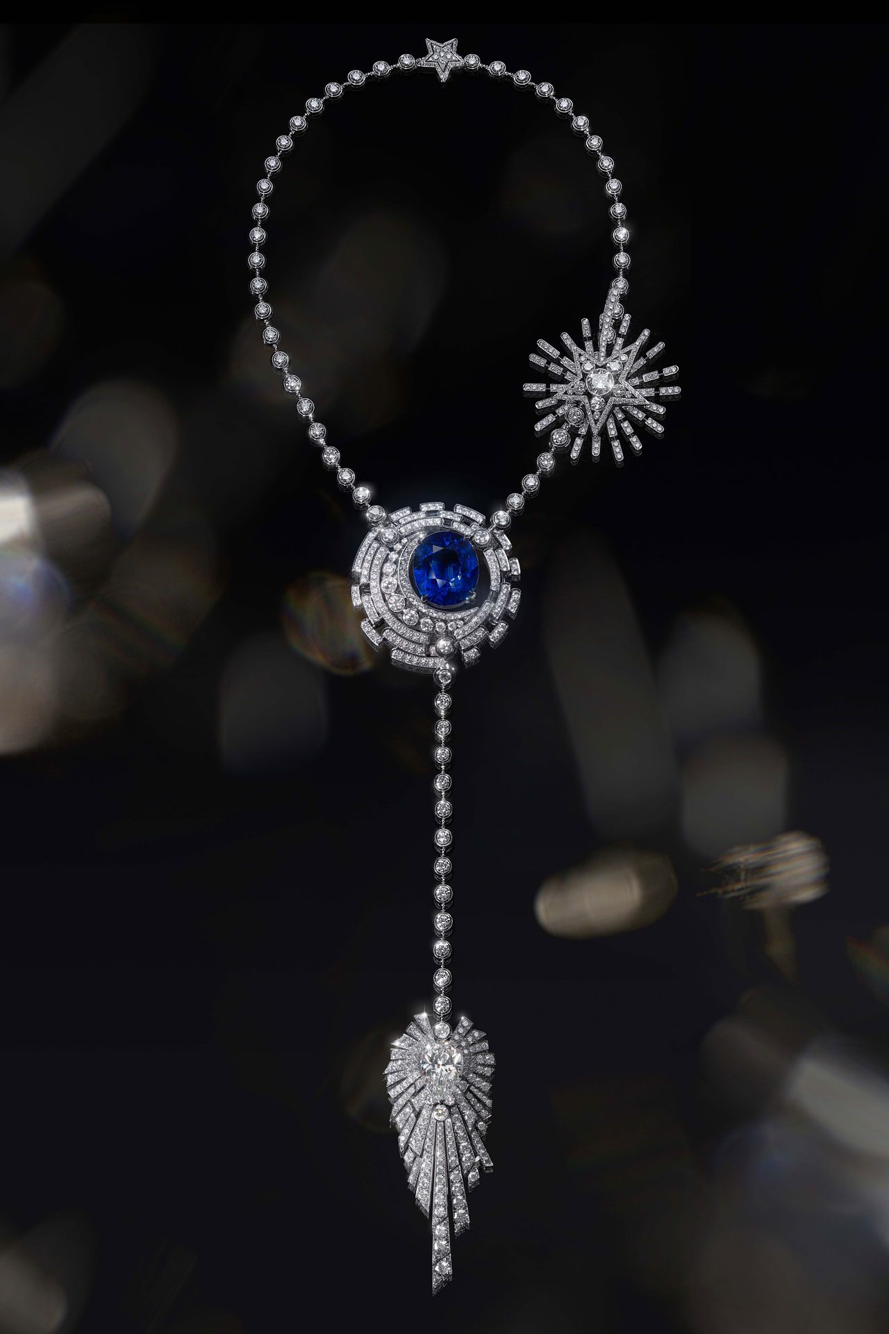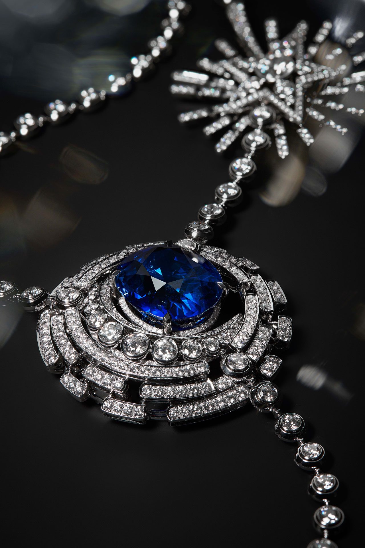 今コレクションの象徴となる Allure Céleste (アリュール セレスト) ネックレスは、極めて大きい55.55カラットの深く鮮やかなオーバルカットのブルーサファイア、その周りにラウンドカットのダイヤモンド、そして8.05カラットのタイプ2a、 D カラー、フローレスのペアシェイプカットダイヤモンドが使われており、これ以上ないほどの輝きを放っている。ジュエリーは形を変えることもでき、光輪は、取り外すとブローチ、中央で連なるダイヤモンドはブレスレットに、ネックレスは⻑さを短くすることもできる。