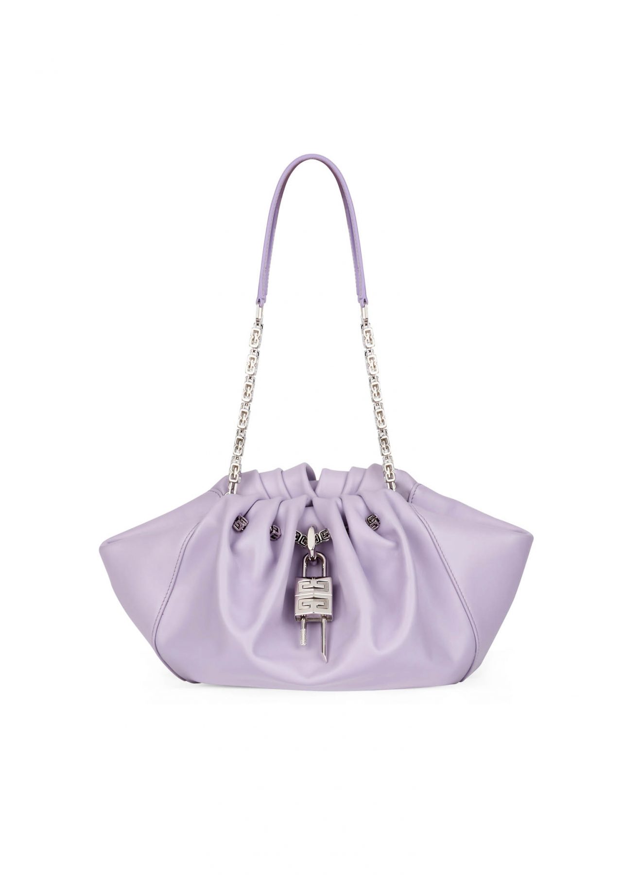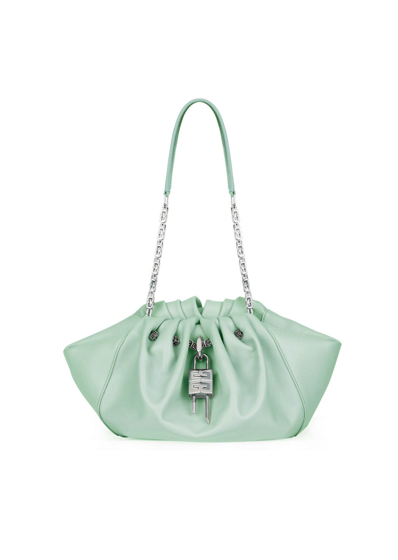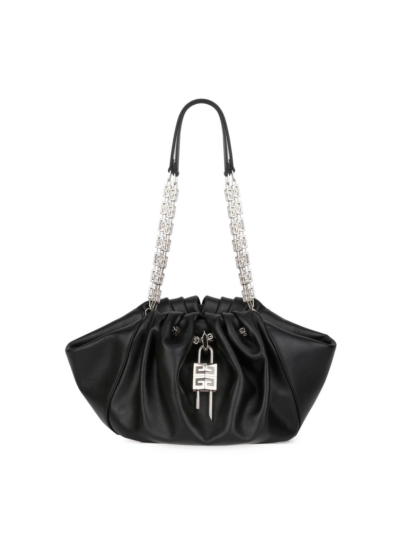 しなやかな巾着型のハンドバッグは巧妙な丸い形状で、極めてソフトなカーフレザーで作られている。 G-Cube のエレメントが散りばめられ、手作業で寄せたドレープがバッグの個性を強調。ダブルの G-Cube チェーンストラップやソフトなカーフレザーを用いたショルダーピース、閉めた時にカチッと心地よい音がする、しっかりとしたマグネティック・クロージャーなどのディテールはラグジュアリーでありながら実用的なところが魅力的だ。