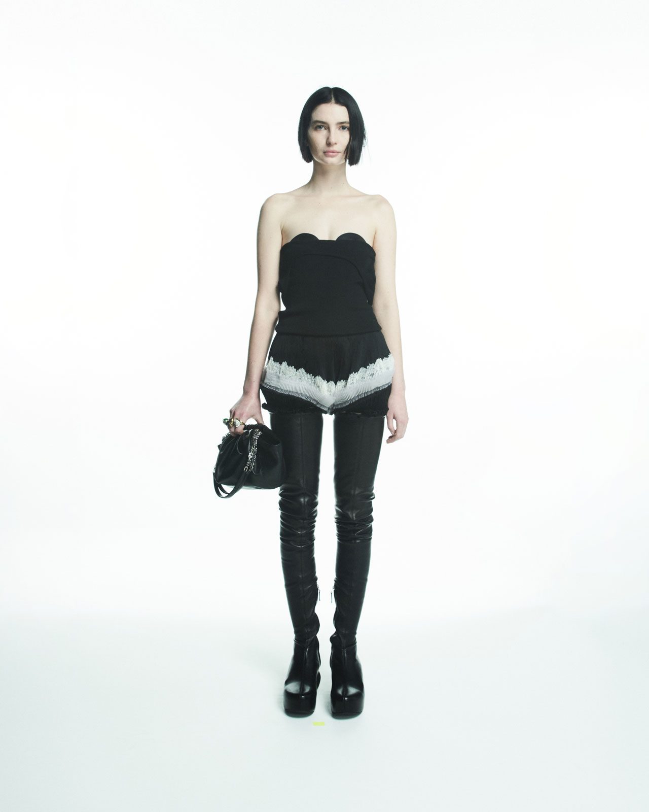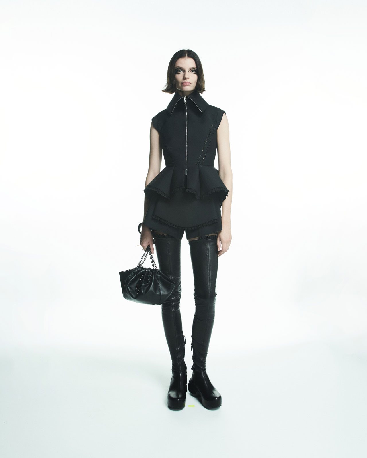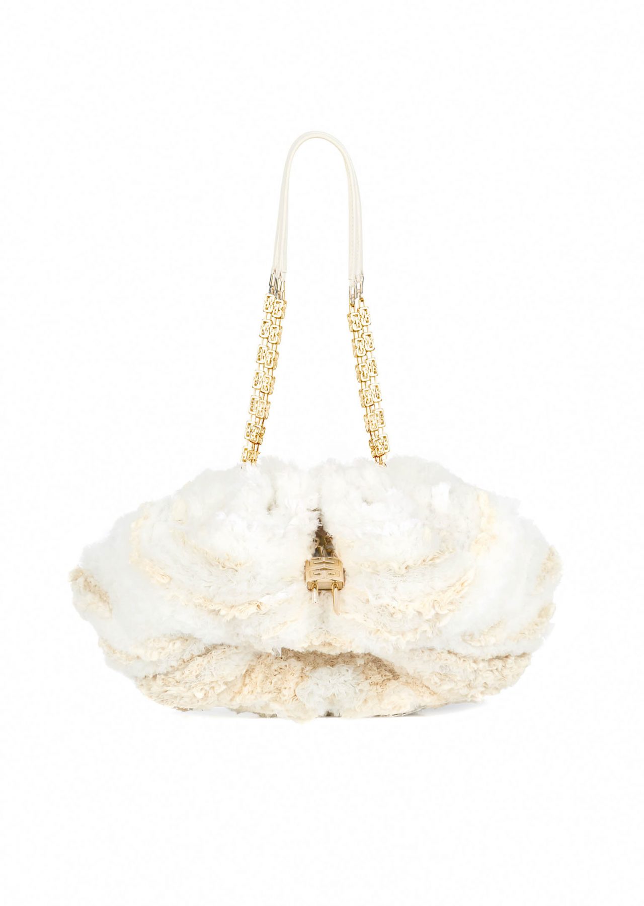 しなやかな巾着型のハンドバッグは巧妙な丸い形状で、極めてソフトなカーフレザーで作られている。 G-Cube のエレメントが散りばめられ、手作業で寄せたドレープがバッグの個性を強調。ダブルの G-Cube チェーンストラップやソフトなカーフレザーを用いたショルダーピース、閉めた時にカチッと心地よい音がする、しっかりとしたマグネティック・クロージャーなどのディテールはラグジュアリーでありながら実用的なところが魅力的だ。