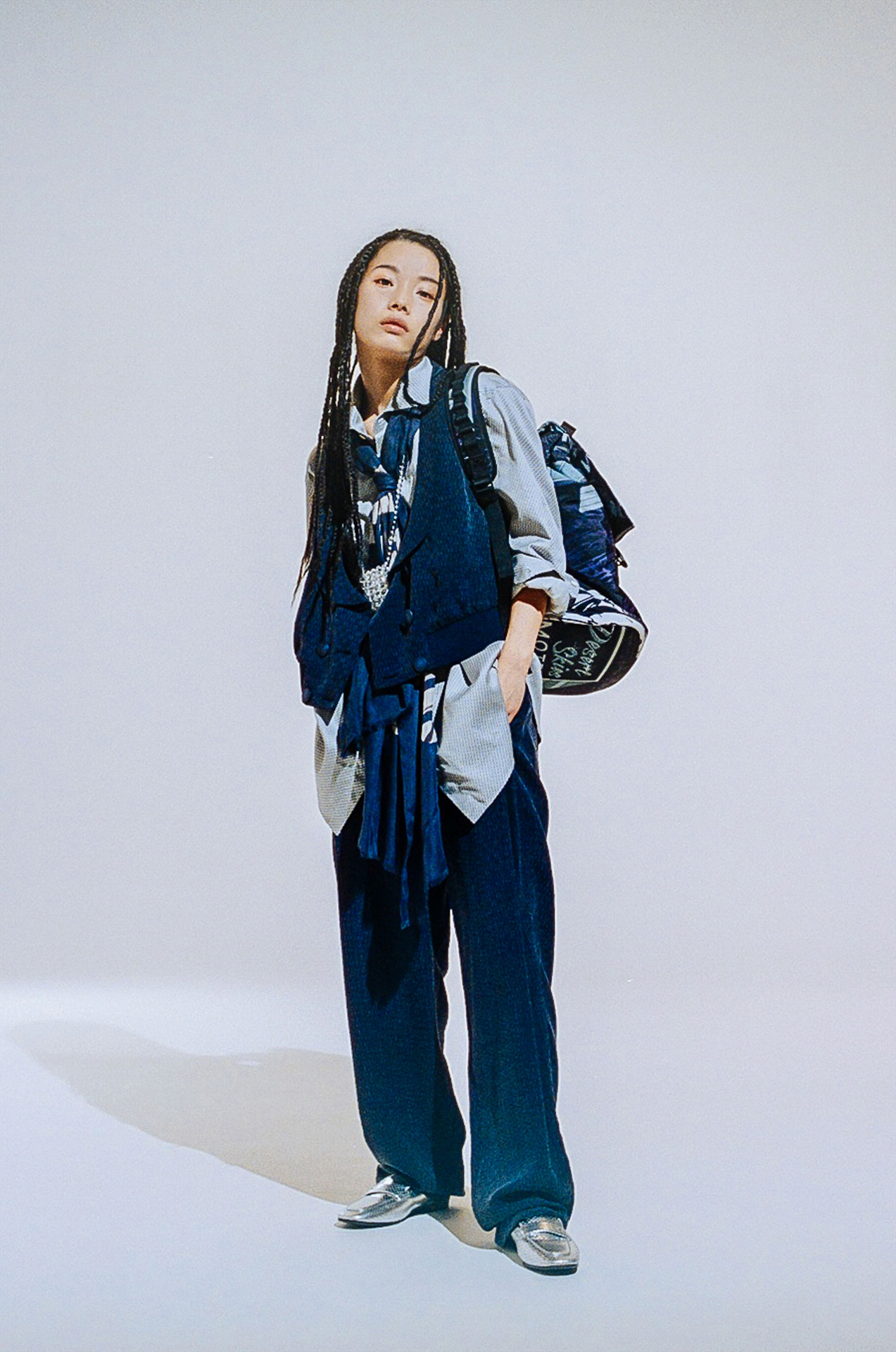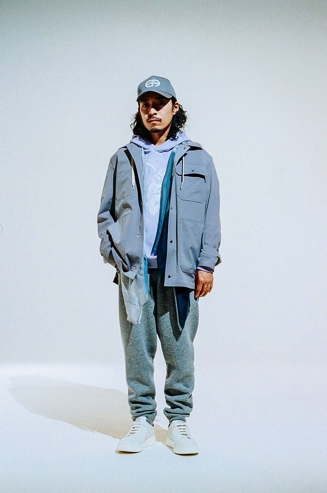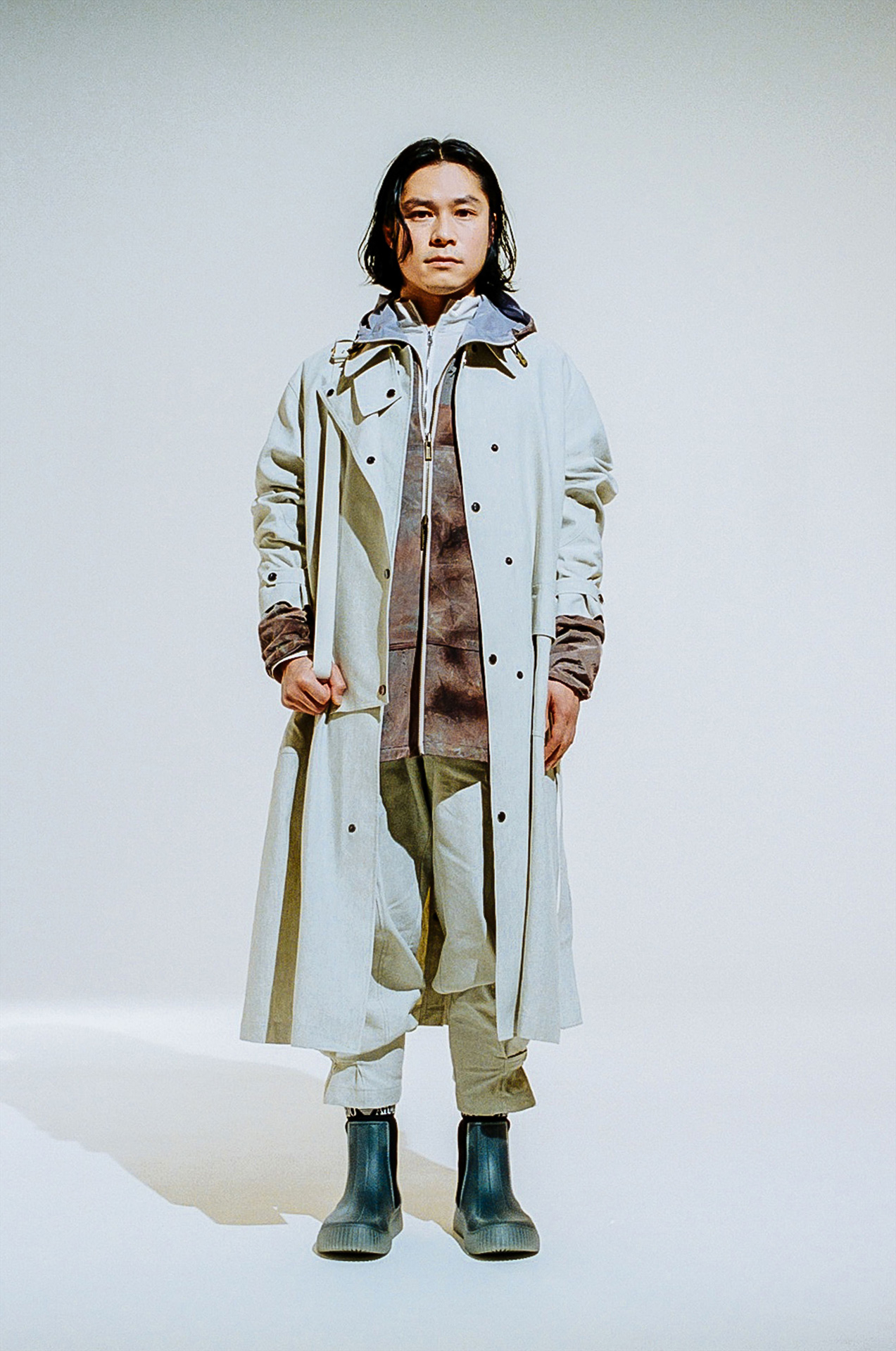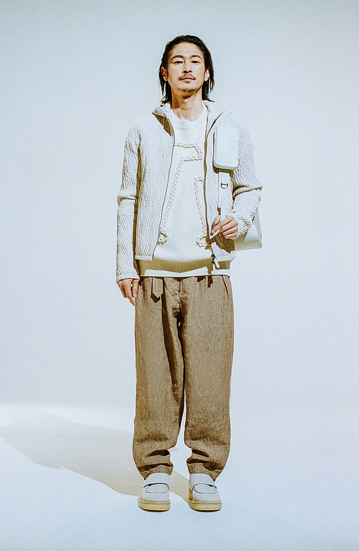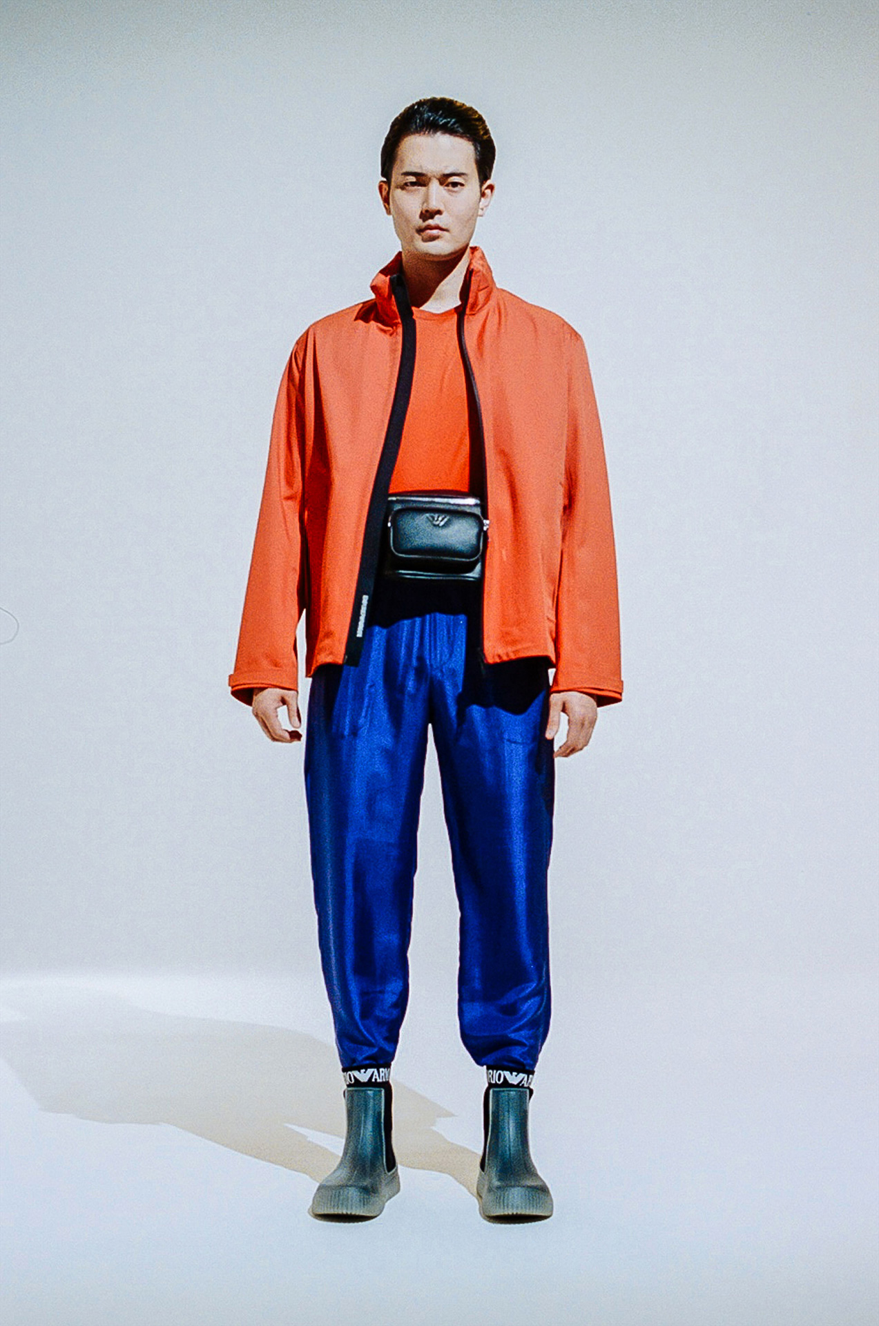 またデジタル化が進み、撮影した画像がその場で確認できる時代だからこそ、今回の撮影はフィルムを採用したという。無機質な白の背景を背に存在するのはひとりの人間と EMPORIO ARMANI のアイテムのみ。