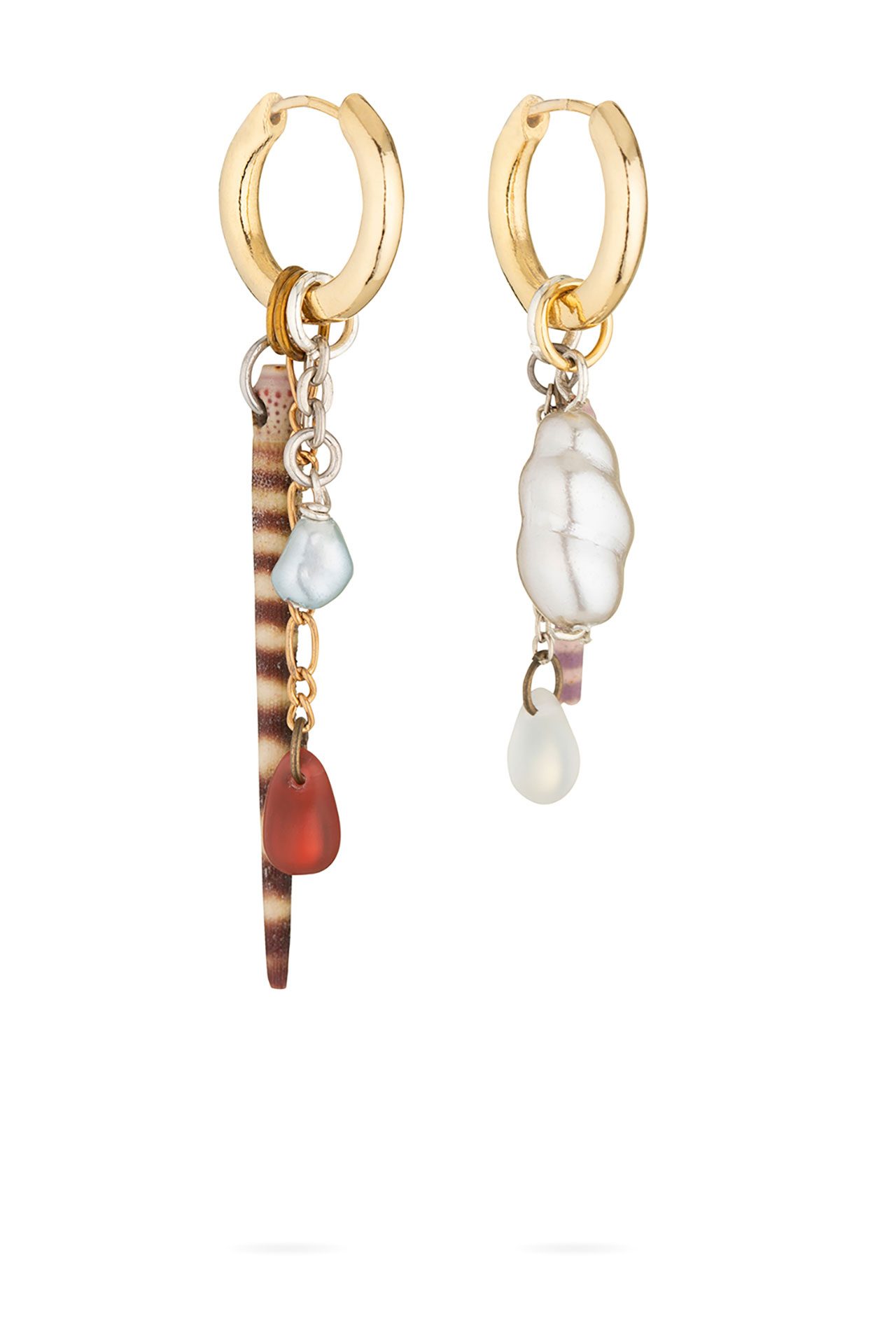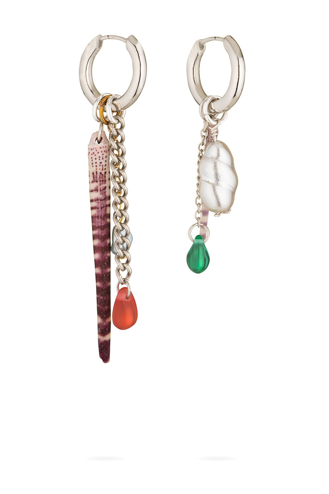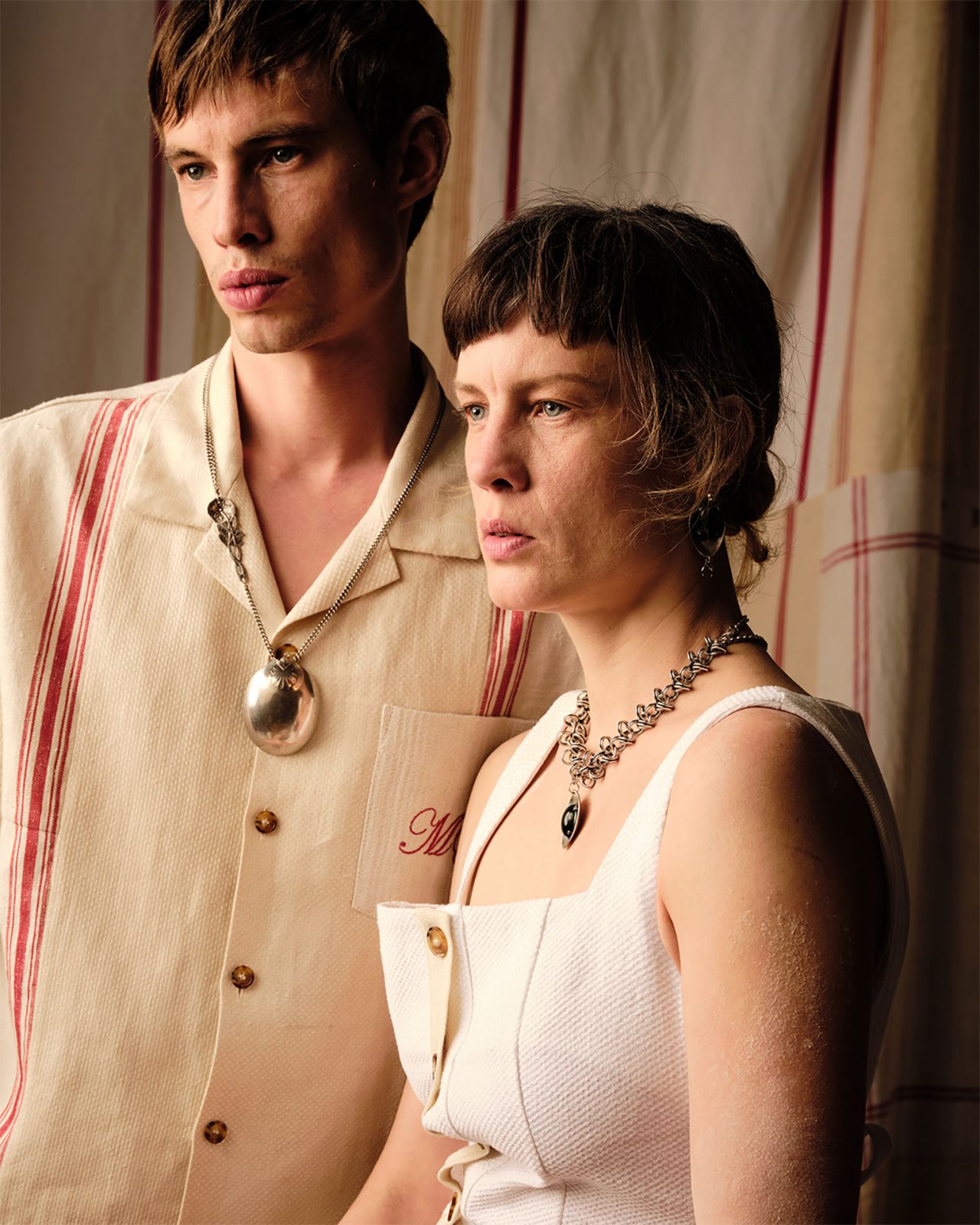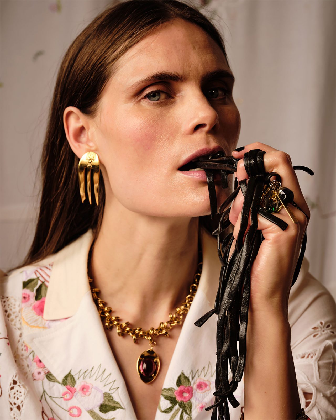 同シリーズでは「物や素材が持つ特徴を生かし、再生させていく」というブランドの根底にある考え方を取り入れた。例えば、フォークの先端部分はイヤリングやネックレス、持ち手部分はブレスレットへと再生している。また、長年に渡って世界中から収集した貝殻、パール、ウッド、ガラスビーズなどを用いたジュエリーも登場。ゴールドチェーンと艶のある石を融合させたラッキーチャームは、御守りのような意味合いも持ち合わせながら、スタイリングを華やかに彩ってくれるのがポイントだ。