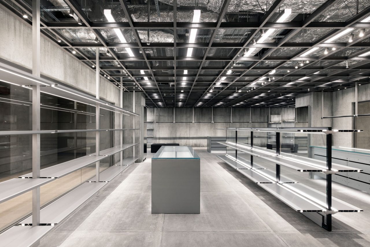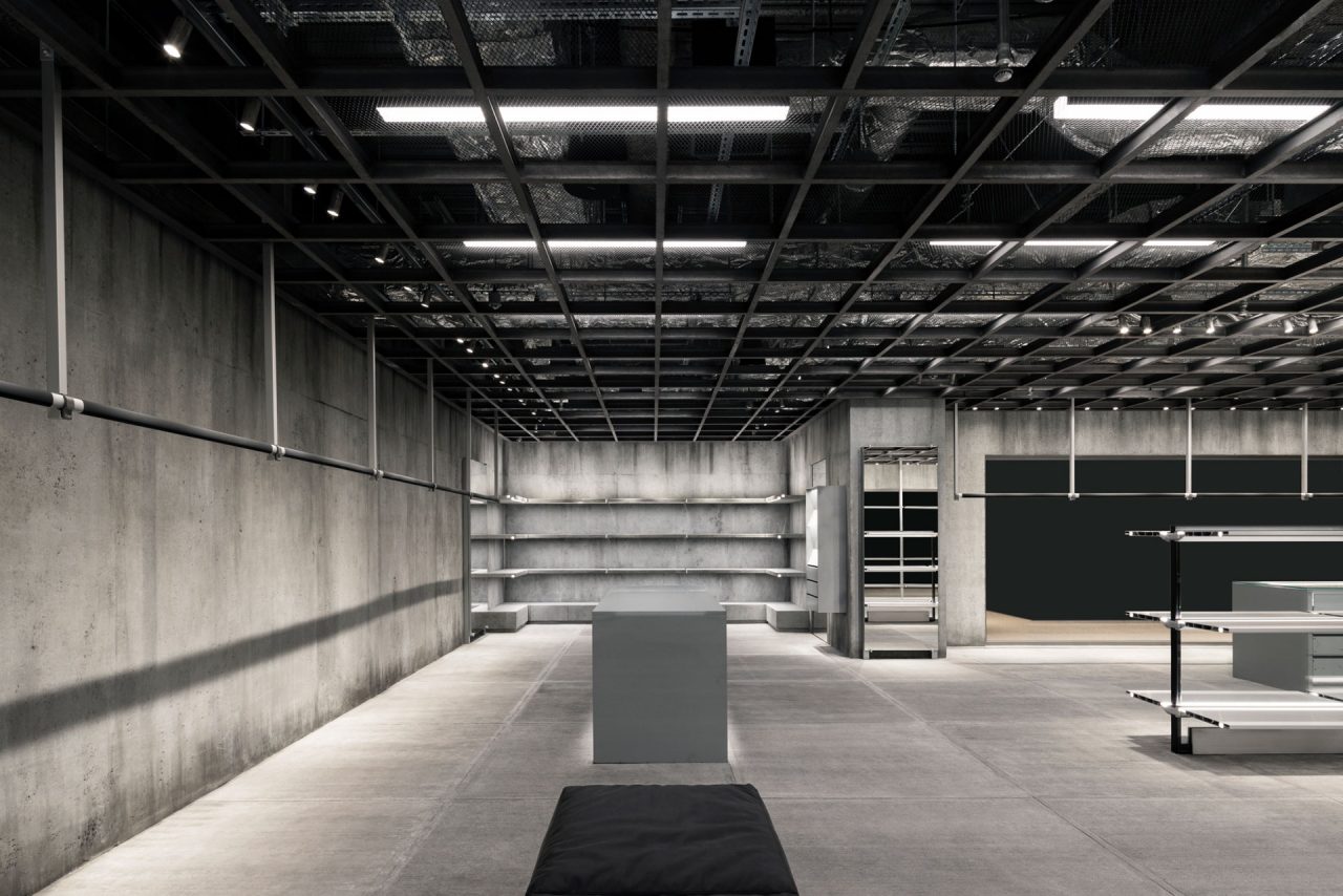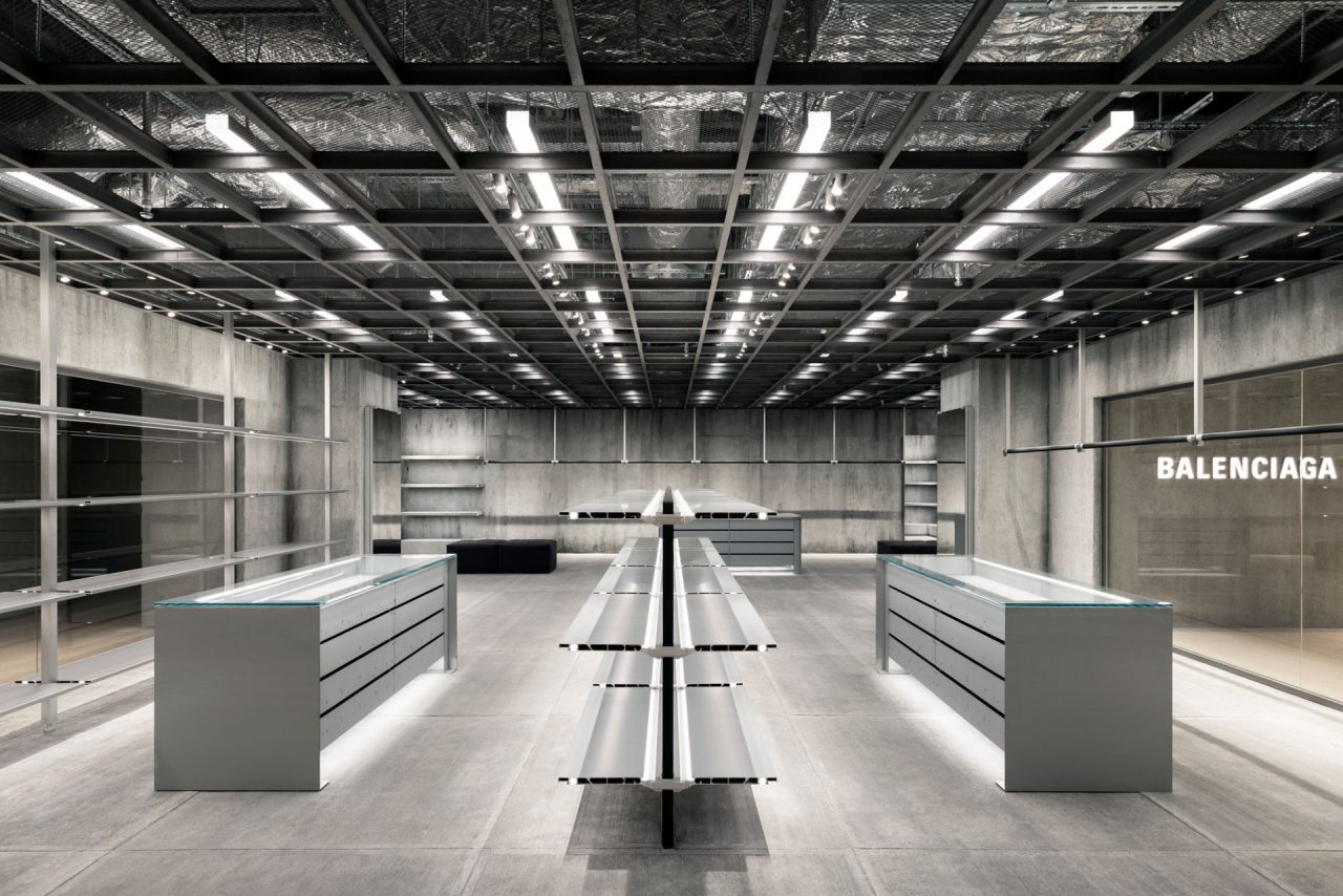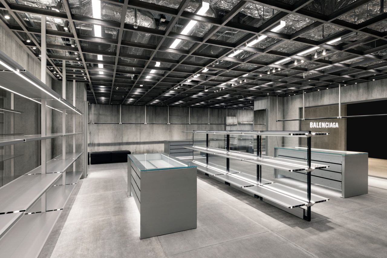 フロア面積を拡張して新しく生まれ変わった BALENCIAGA (バレンシアガ) 岩田店本店。店内は2021年9月よりブランドコンセプトとして導入された、あえてキレイに加工せず未完成のまま原料を消費するという「Raw Aechitecture」の世界観を忠実に表現。