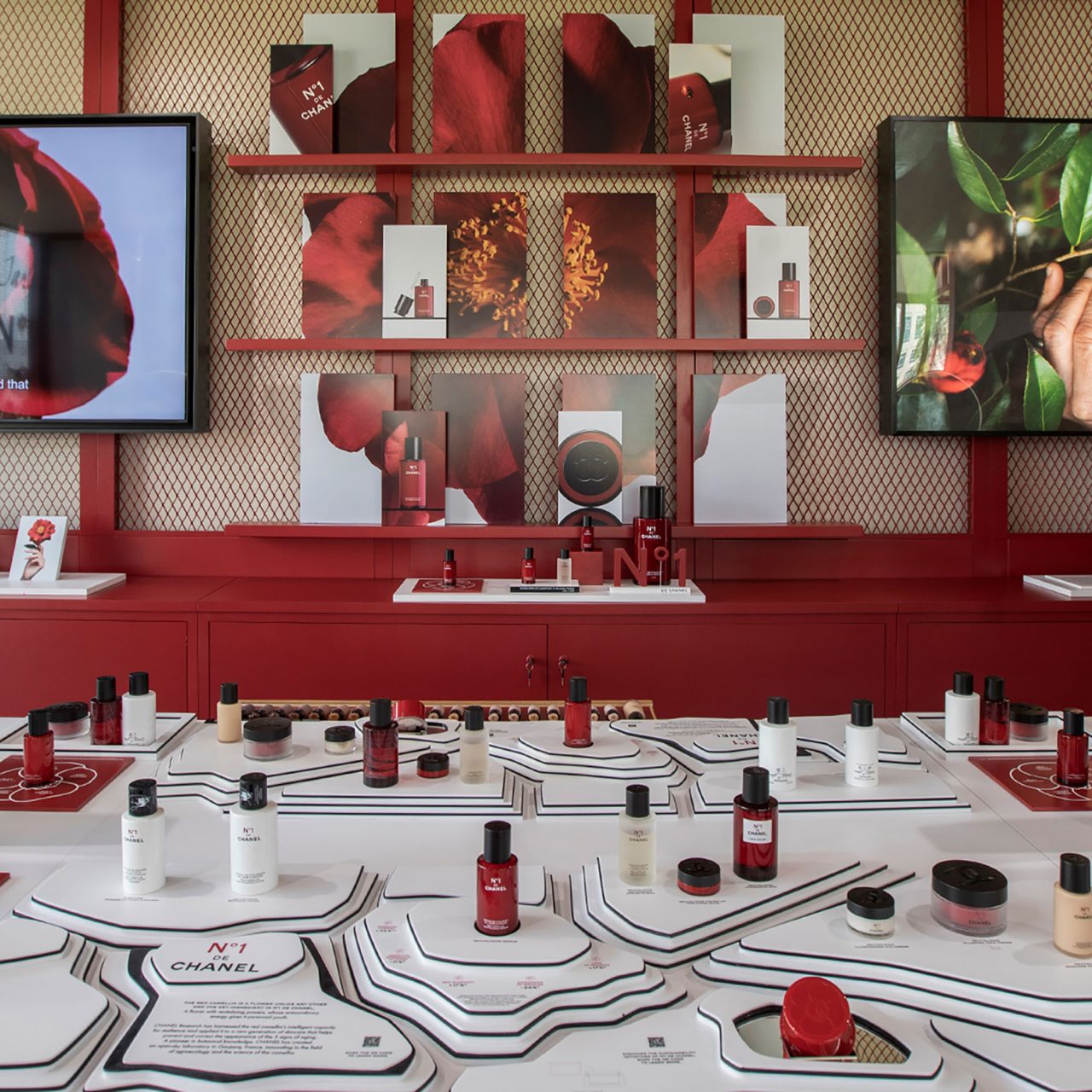 注目したいのは、会場入り口にひろがるデジタルインスタレーション「イマーシブ コリドー」。視覚ならず嗅覚にも訴える仕掛けで、レッド カメリアがひろがる庭園を歩いているような気分に。続いて、CHANEL の環境への取り組みやスター製品であるセラムにフォーカスしたディスプレイ「N°1 ドゥ シャネル ディスカバリー」で、「N°1 ドゥ シャネル」の魅力をさらに発見できそう。