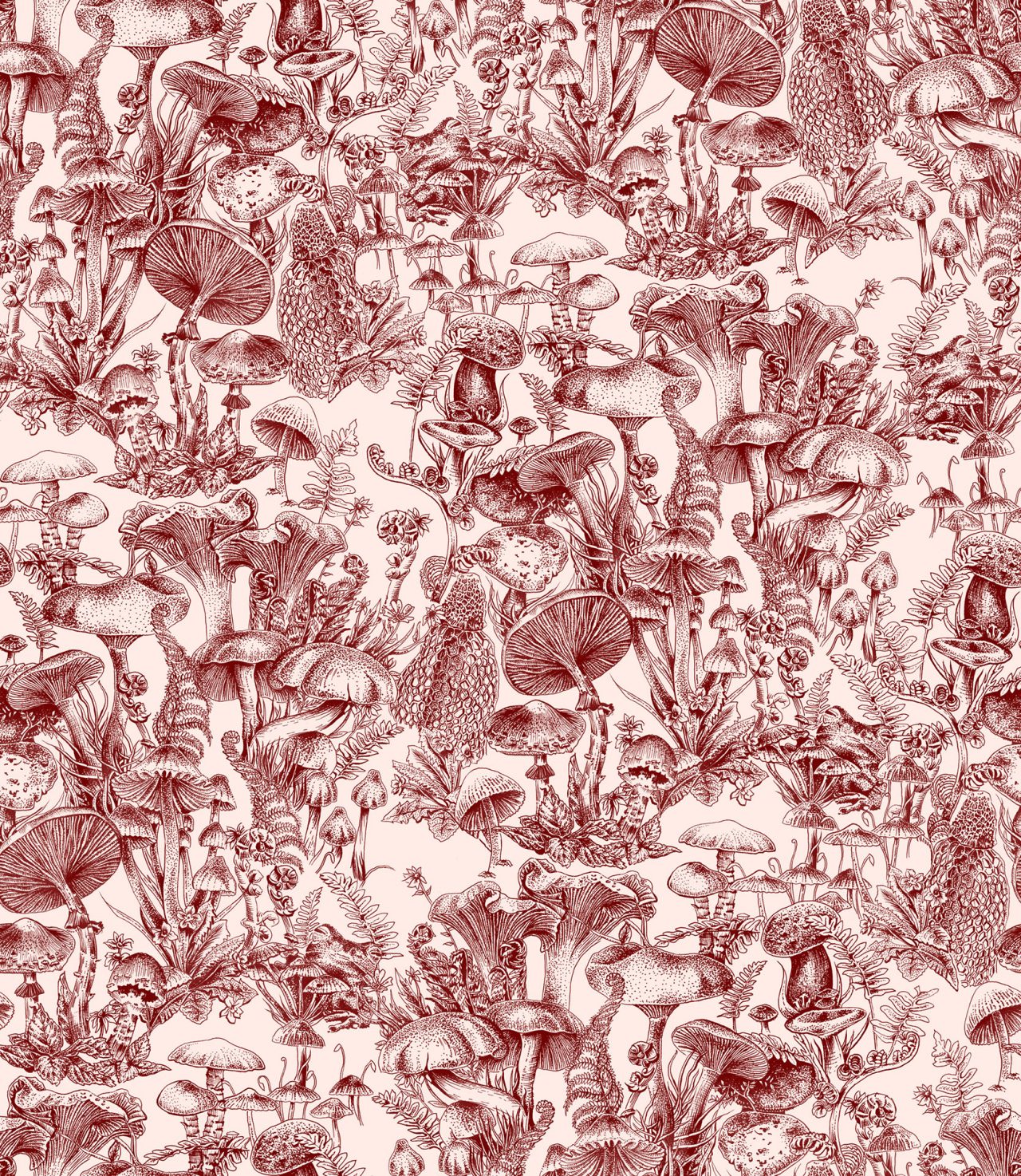 エキシビション会場の壁面を彩るきのこのプリントは、 Stella McCartney 2022年サマー コレクションで象徴的な「キノコの森 (Fungi Forest)」トワル ド ジュイ プリントを Cole & Son (コール&サン) によって壁紙として再解釈したもの。79%の再生可能な繊維が含まれる基板を使用しており、従来不織布壁紙の製造工程で発生する温室効果ガスを30%削減したこの壁紙は、2022年後半に Cole & Son のオンラインストアと旗艦店で発売予定だという。