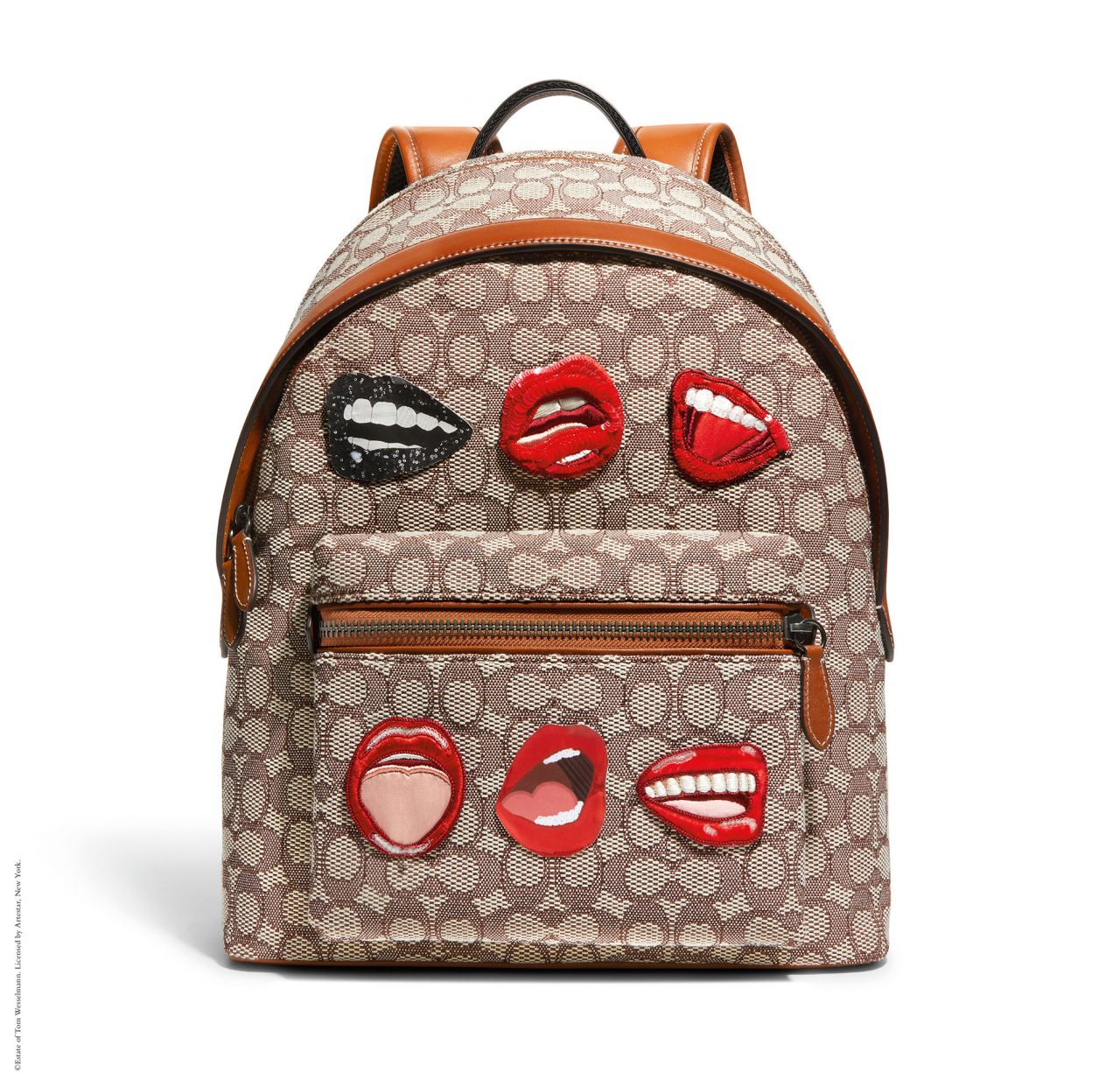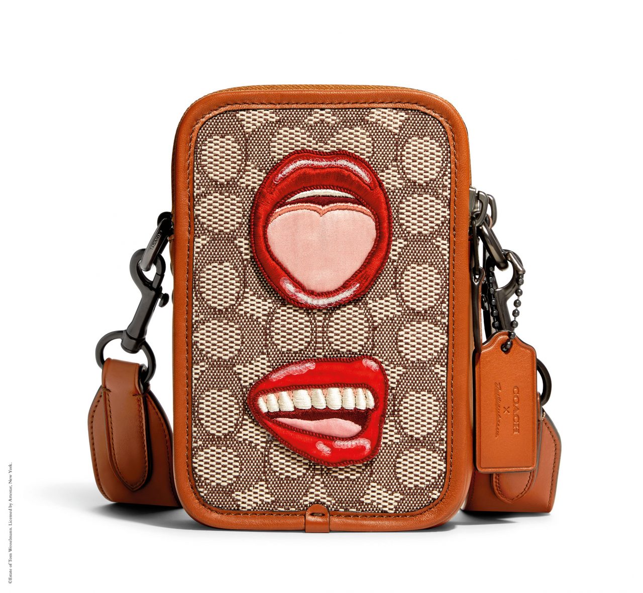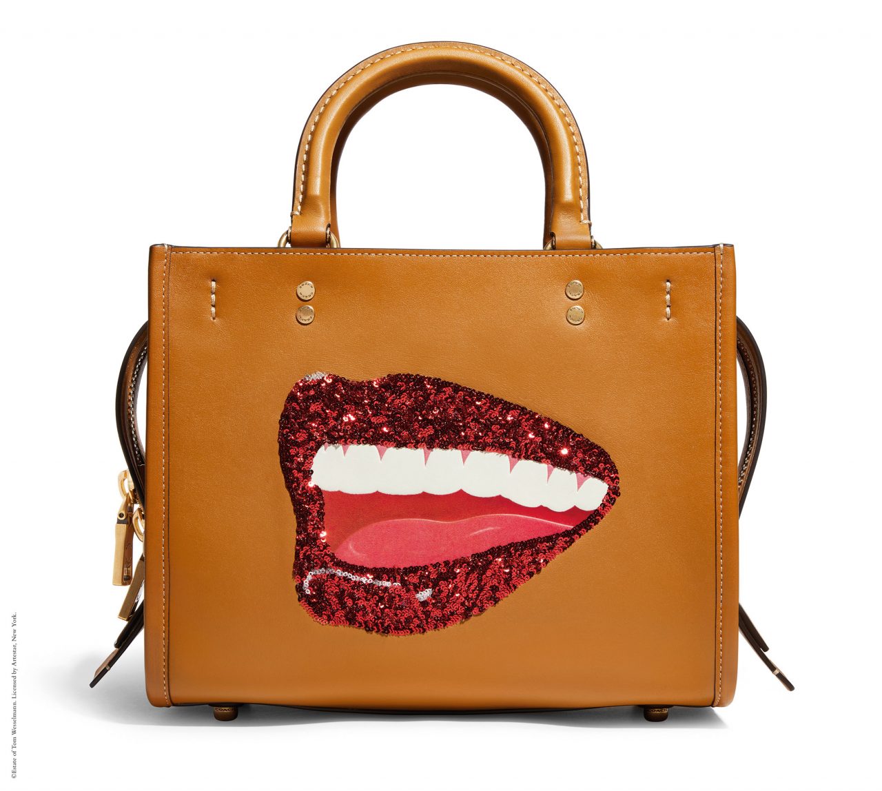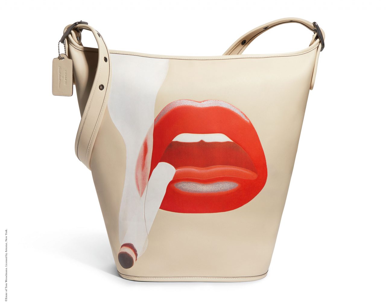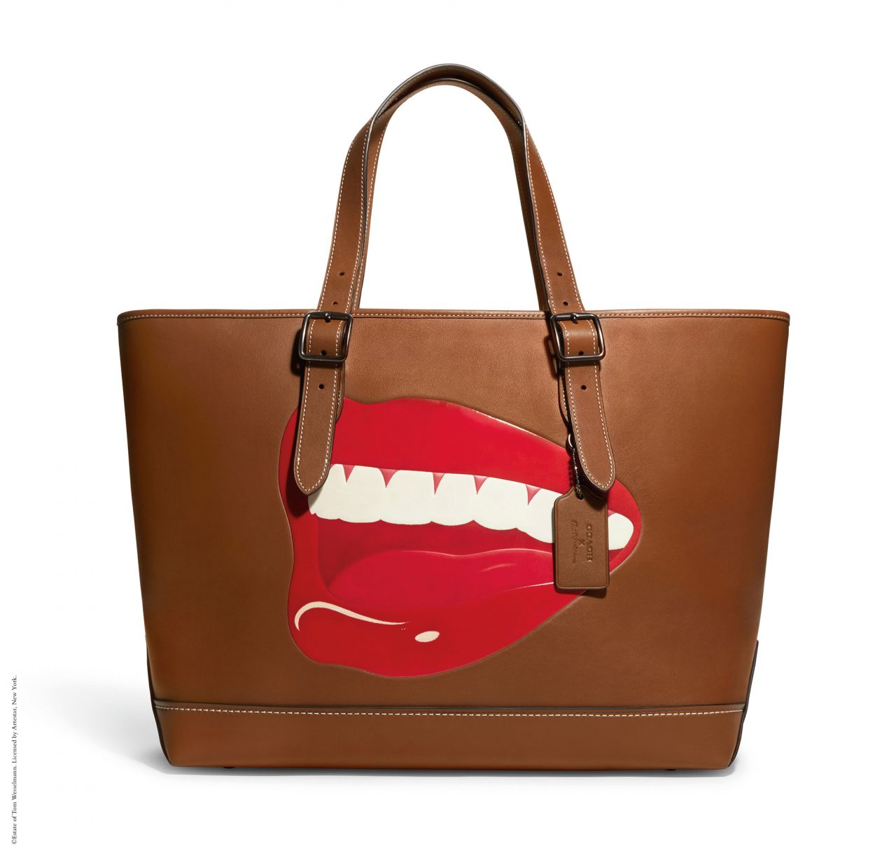 バッグには、「Rogue (ローグ)」や 「Duffle (ダッフル)」 といった Coach のアイコンが、ウェッセルマンを象徴するアートワークである唇や花、巨大なオブジェとして描かれた静物で大胆に彩られている。