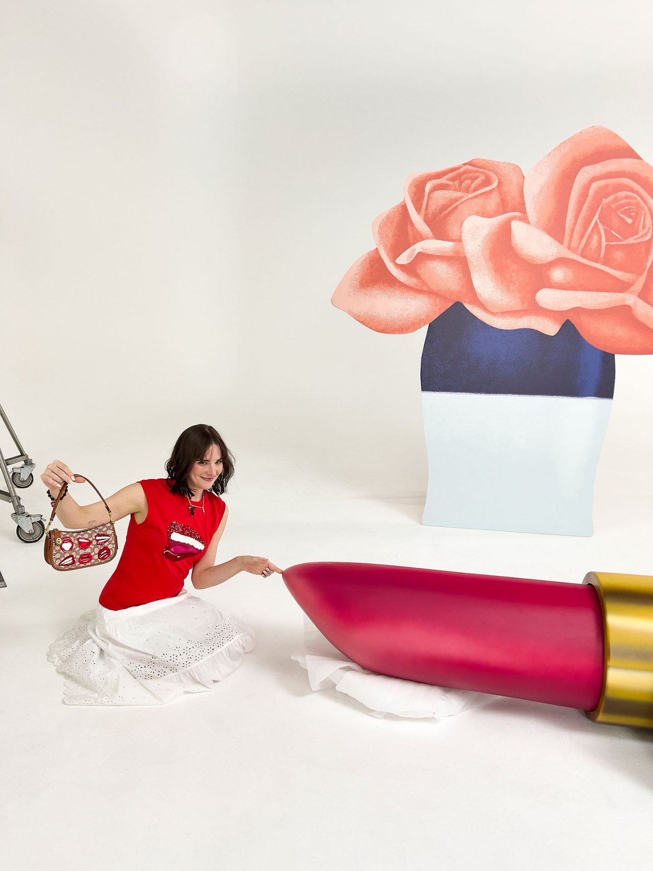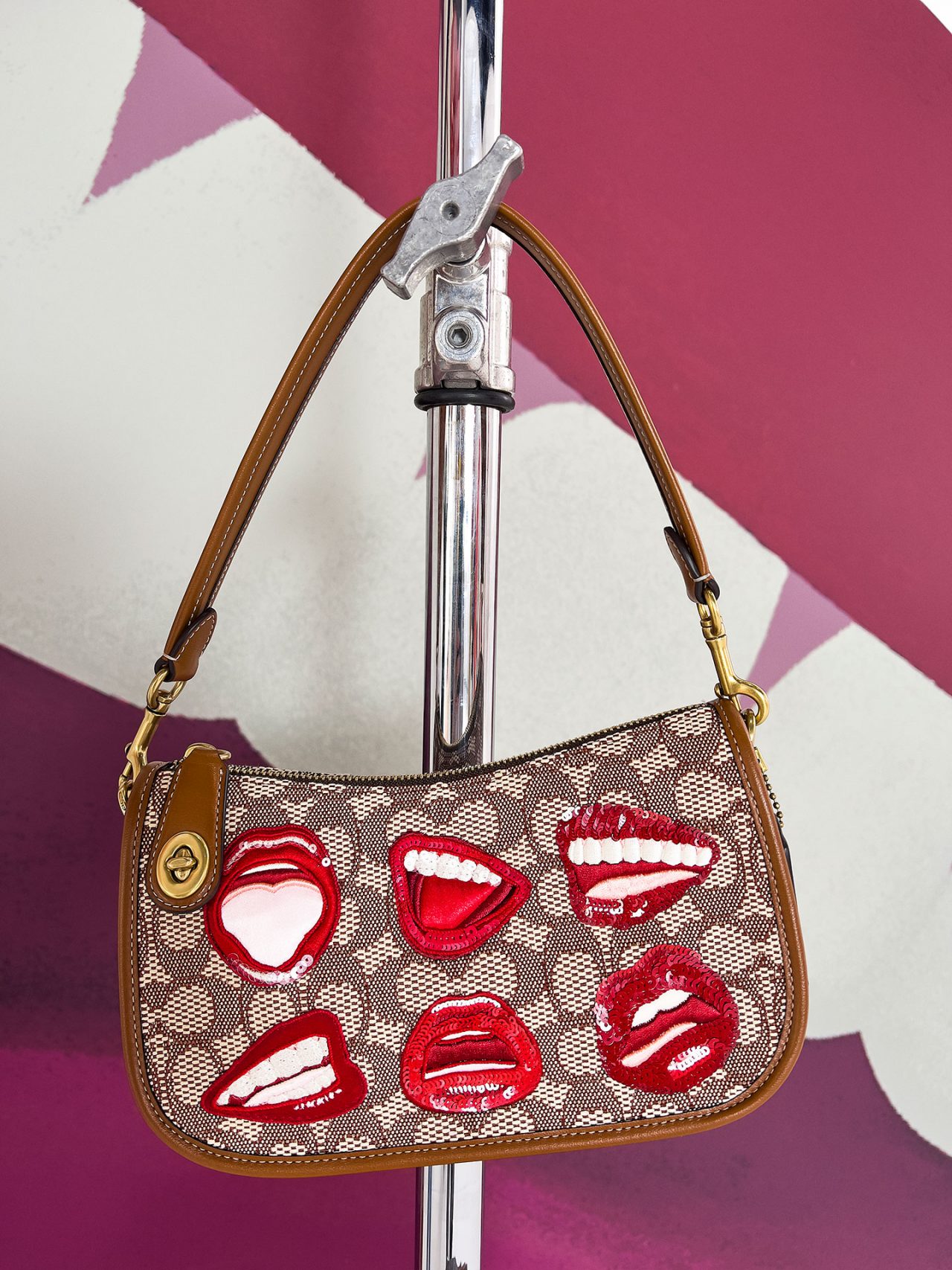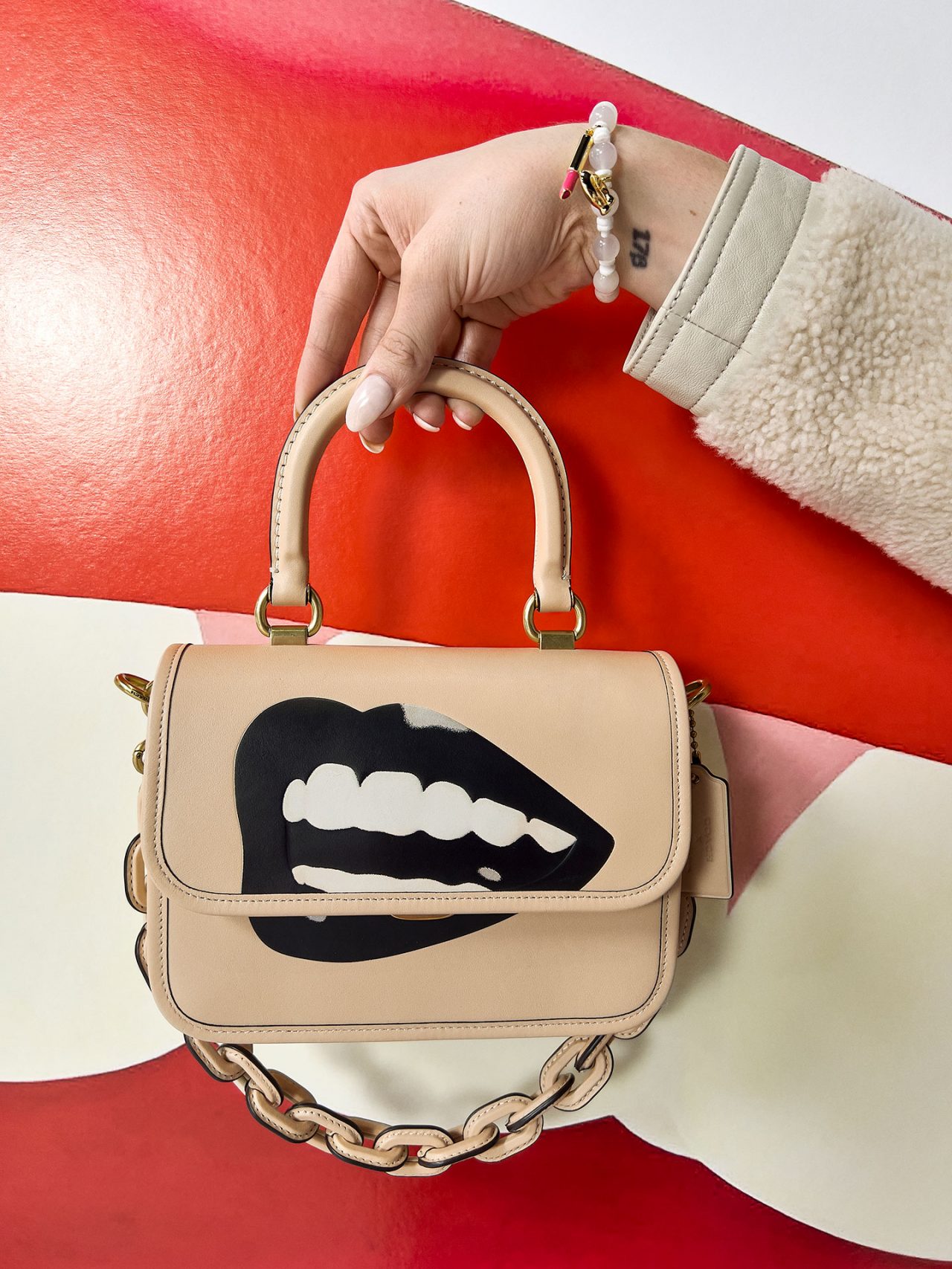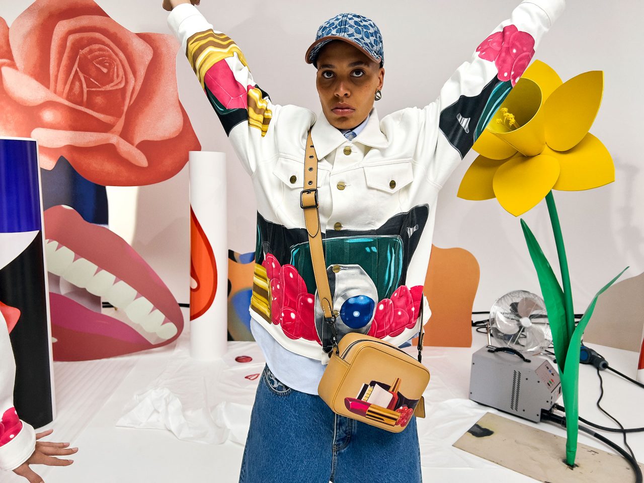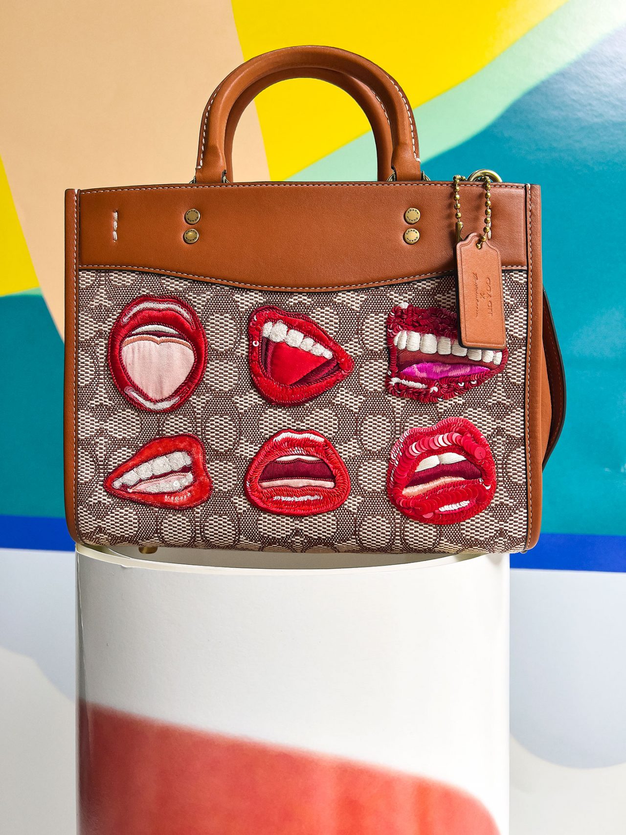 バッグには、「Rogue (ローグ)」や 「Duffle (ダッフル)」 といった Coach のアイコンが、ウェッセルマンを象徴するアートワークである唇や花、巨大なオブジェとして描かれた静物で大胆に彩られている。