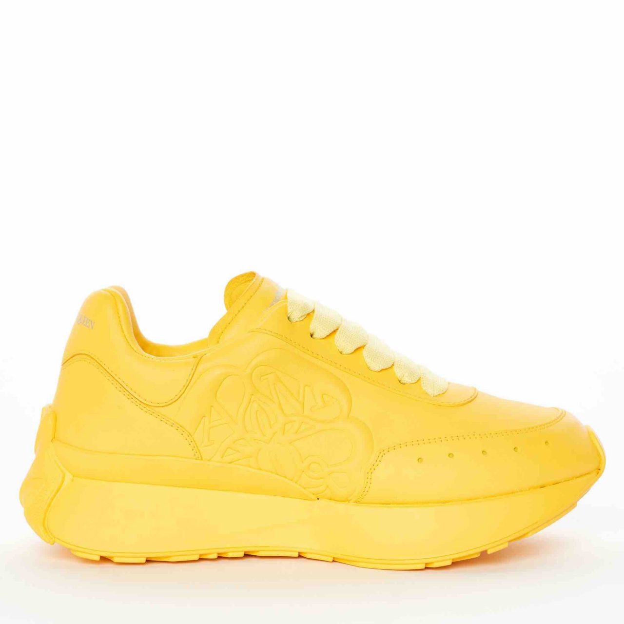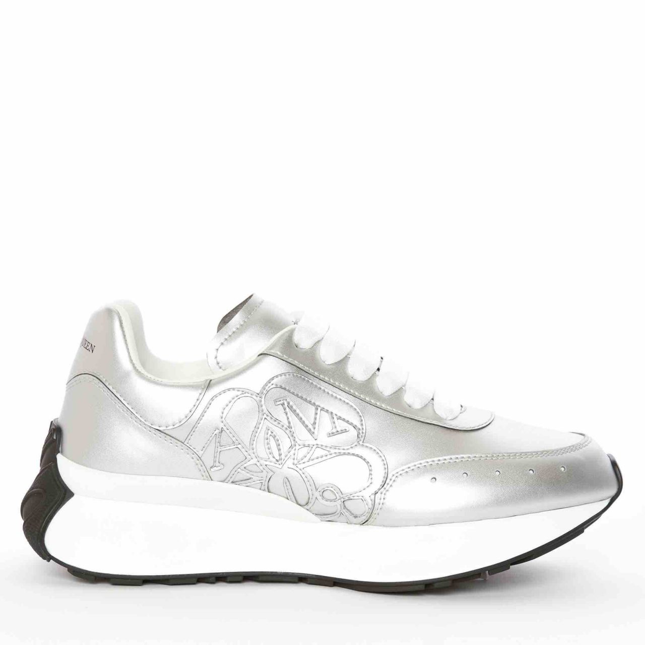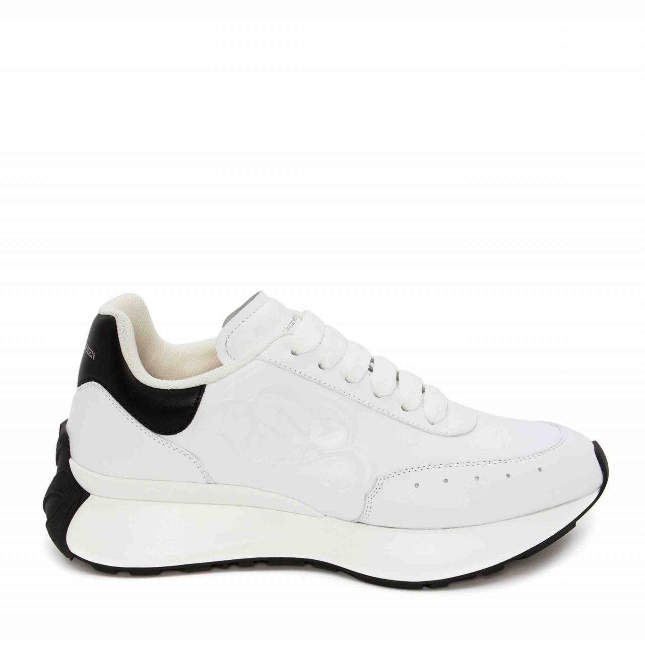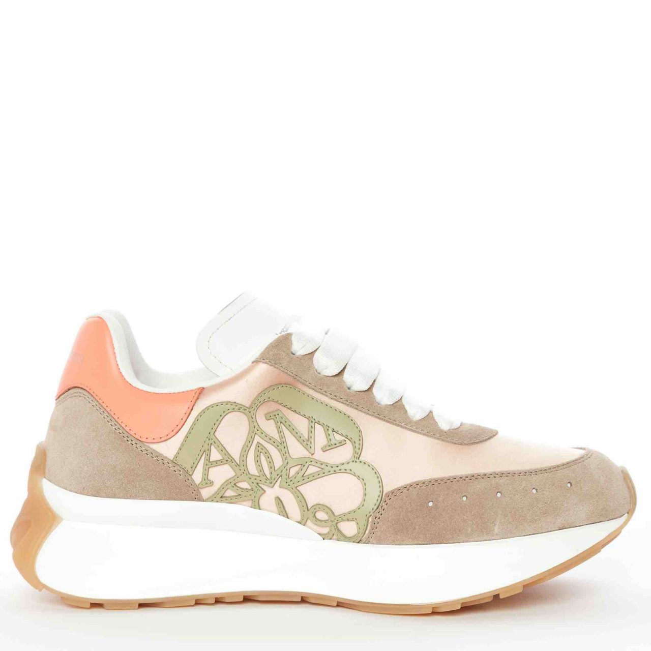 「スプリントランナー」は、サイドにあしらわれたエンボス加工のシールロゴが目をひくオーバーサイズのランナーシューズ。ヒールカウンターとタンに Alexander McQueen のシグネチャーロゴがあしらわれたファンにはたまらない一足だ。スポーティながらも、エレガントさを忘れない「スプリントランナー」は、カジュアルな装いにはもちろんのこと、Mette のようにさらっとドレス一枚に合わせるスタイルにも挑戦したい。