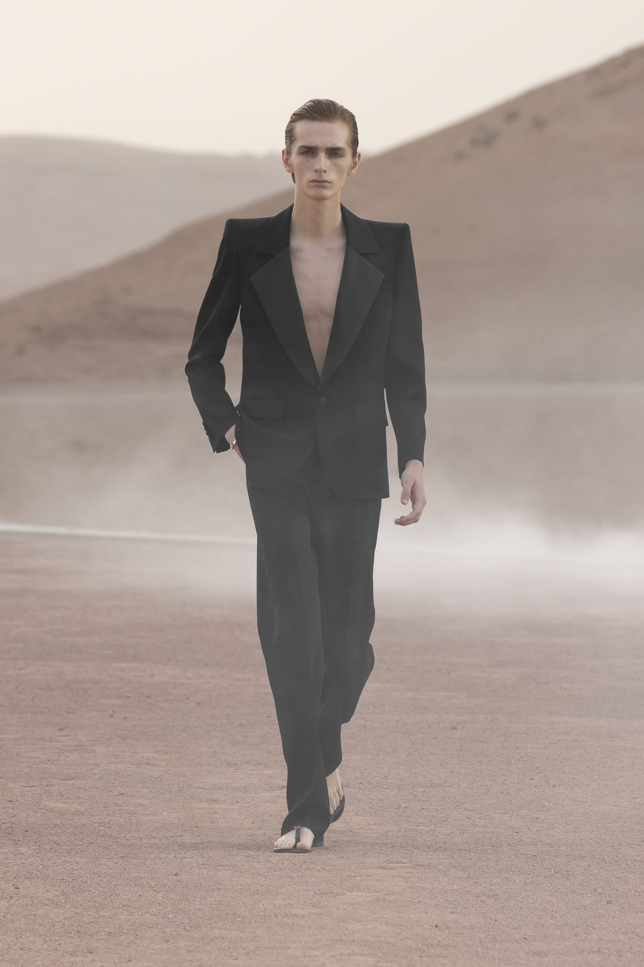 クリエイティブ・ディレクター Anthony Vaccarello (アンソニー・ヴァカレロ) による先進的な SAINT LAURENT 2023年春夏メンズコレクションは、メゾン創設者のマラケシュに対する高尚な意義を背景に、マスキュリンワードローブを構成する要素と、フェミニンとの境界線が上品に溶け合う。SAINT LAURENT において最も独創性に富んだ要素であるタキシードは、より上品に、様々な可能性を孕ませて登場。新しい襟やショルダーの仕上げ、シングルまたはダブルのブレスト、端正でモダンなクリームカラーの軽いシルクファイユのタキシードなど、心躍るセレクションが目白押しだ。