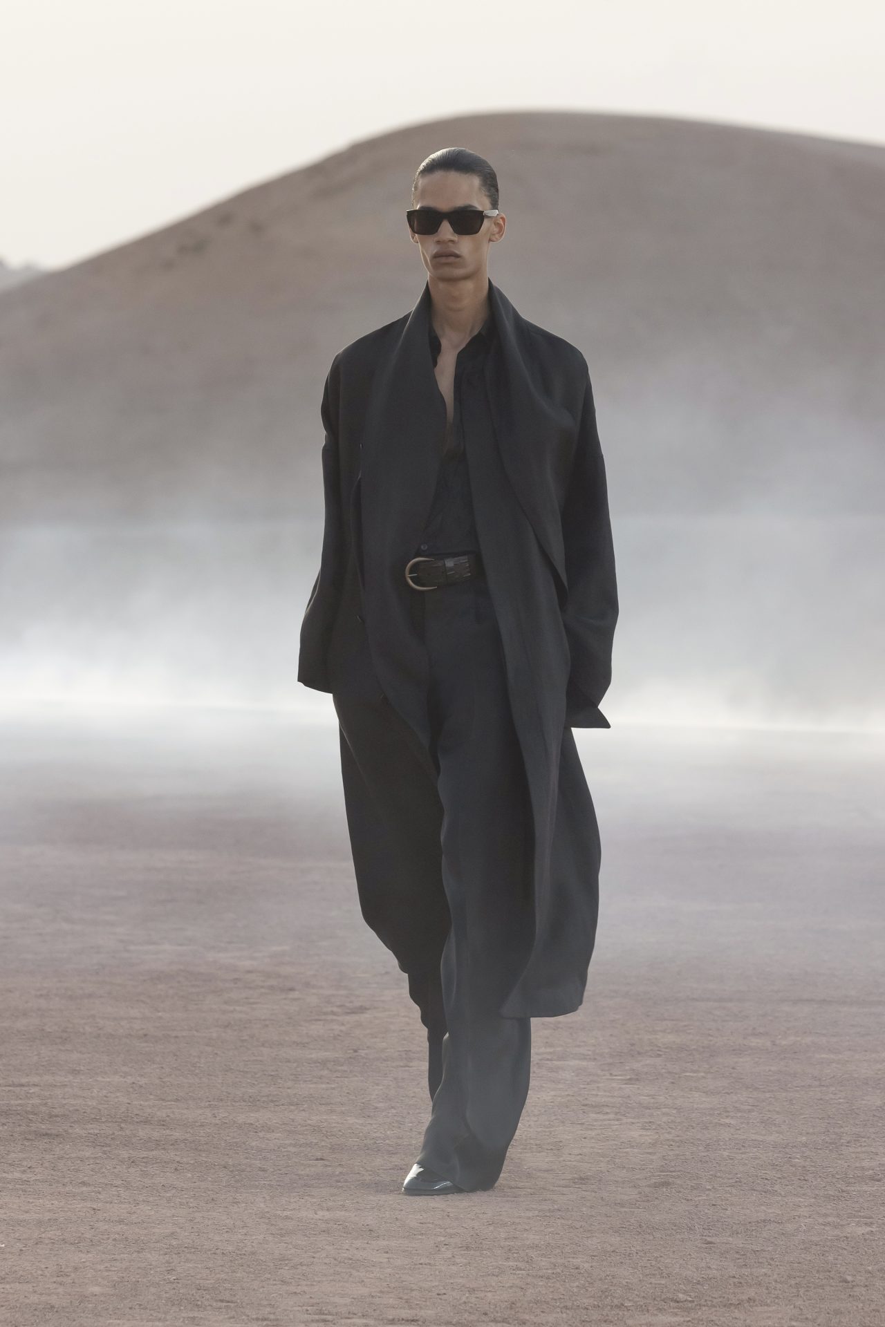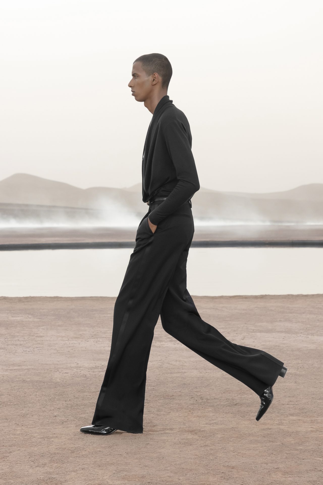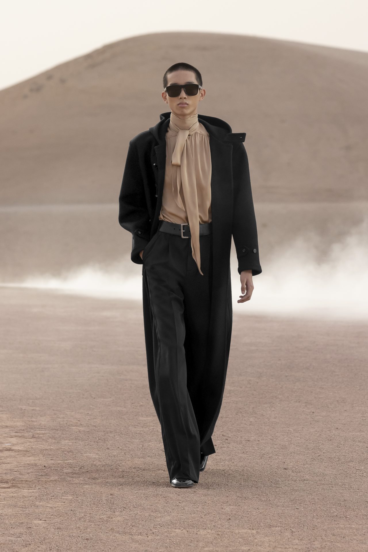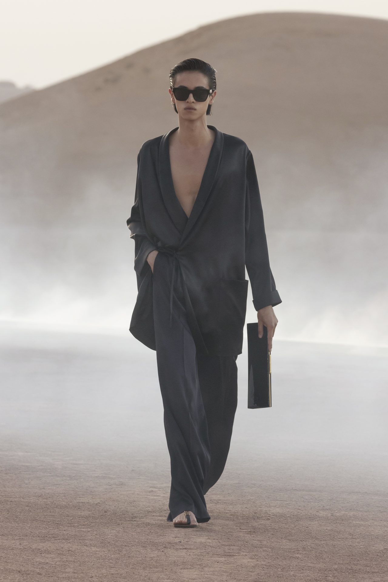 1949年「シェルタリング・スカイ(極地の空)」にインスパイアされ、Anthony Vaccarello はロンドン在住のアーティストであり舞台デザイナーの Es Devlin (エス・デヴリン) とコラボレーションし、アガファイ砂漠の真ん中に荘厳なセットを考案。広大な乾いた未知の地に囲まれ、明るく発光する円形のオアシス。期待と神秘が隣り合わせ、まさに人生の魅惑的な複雑さを象徴し、モロッコの雄大な美しさを称賛した。