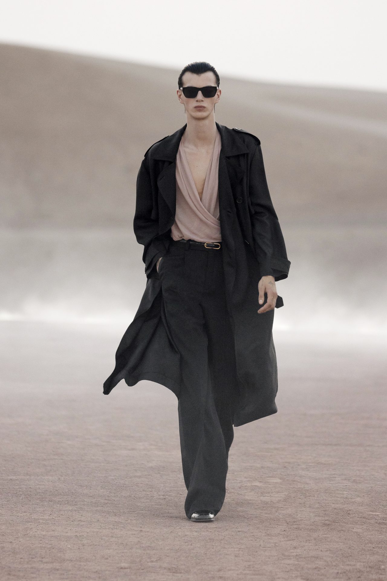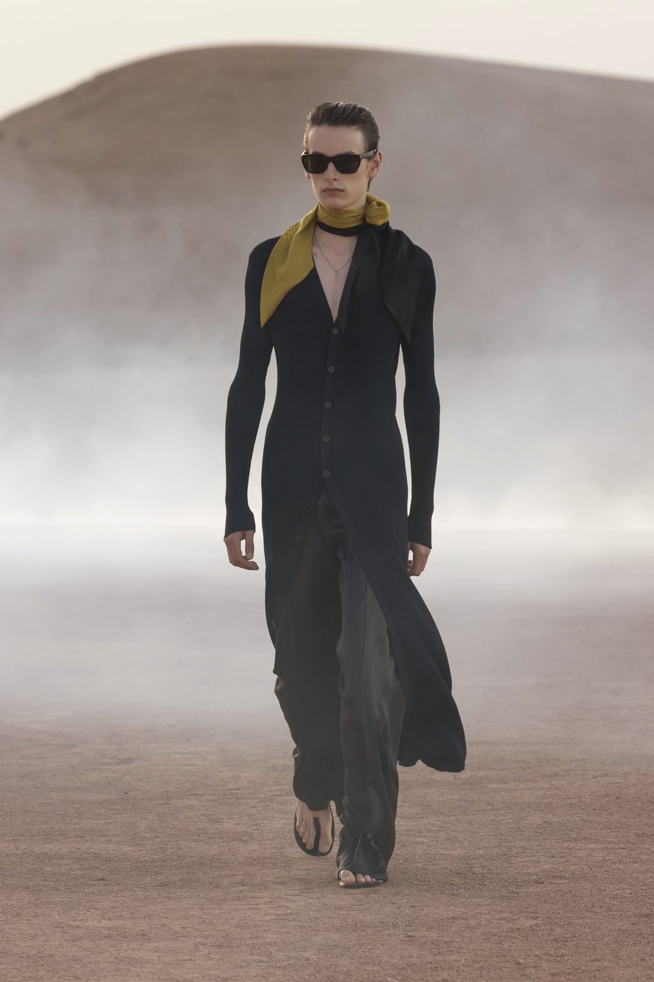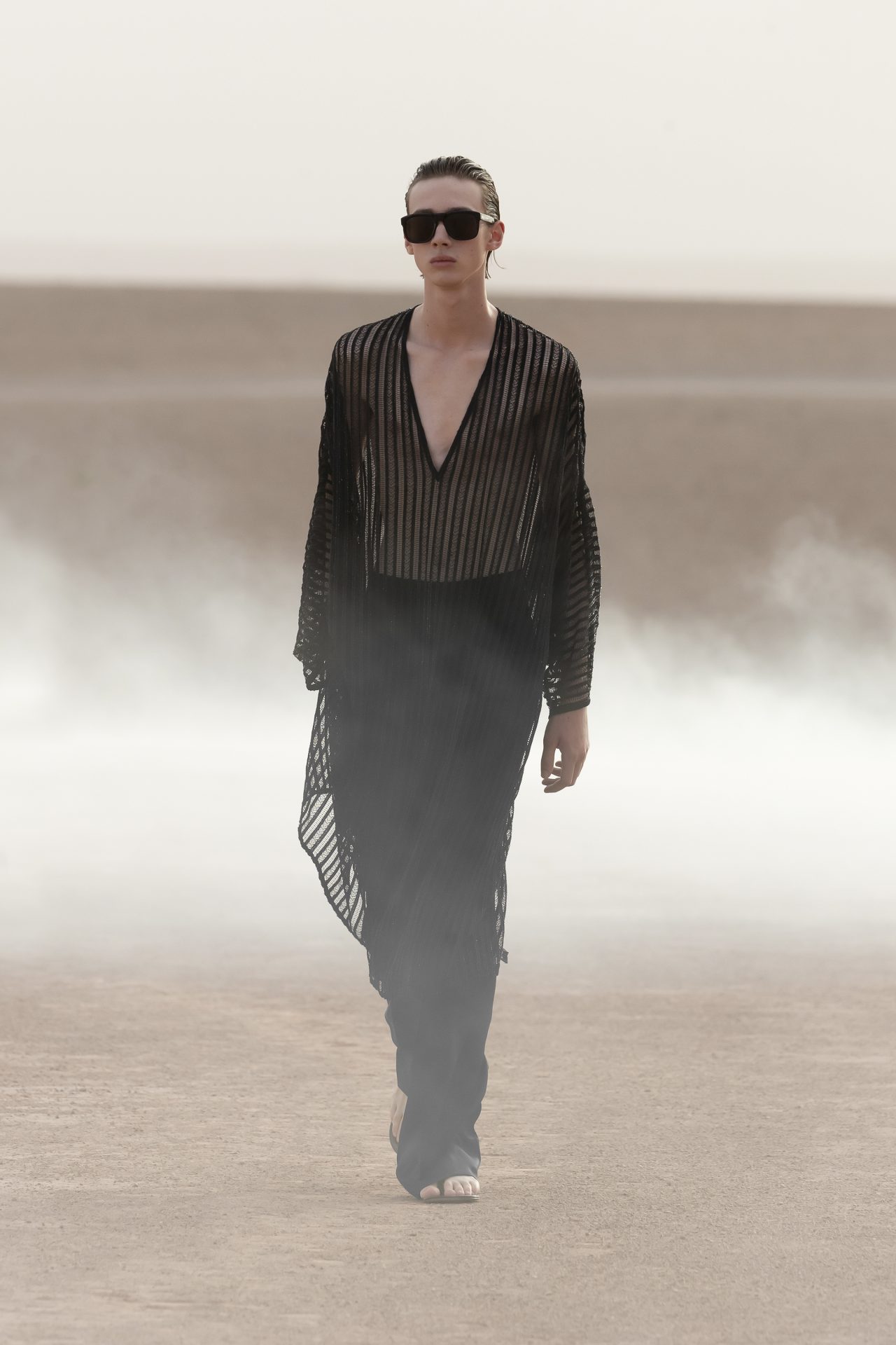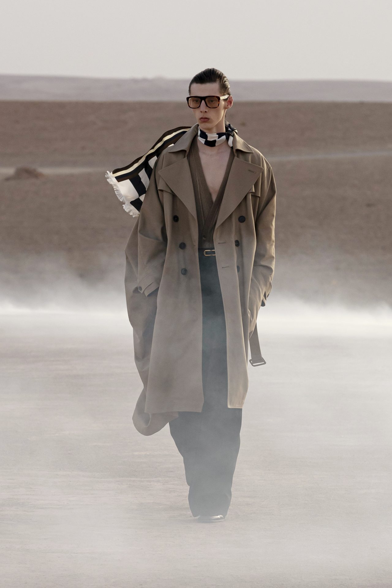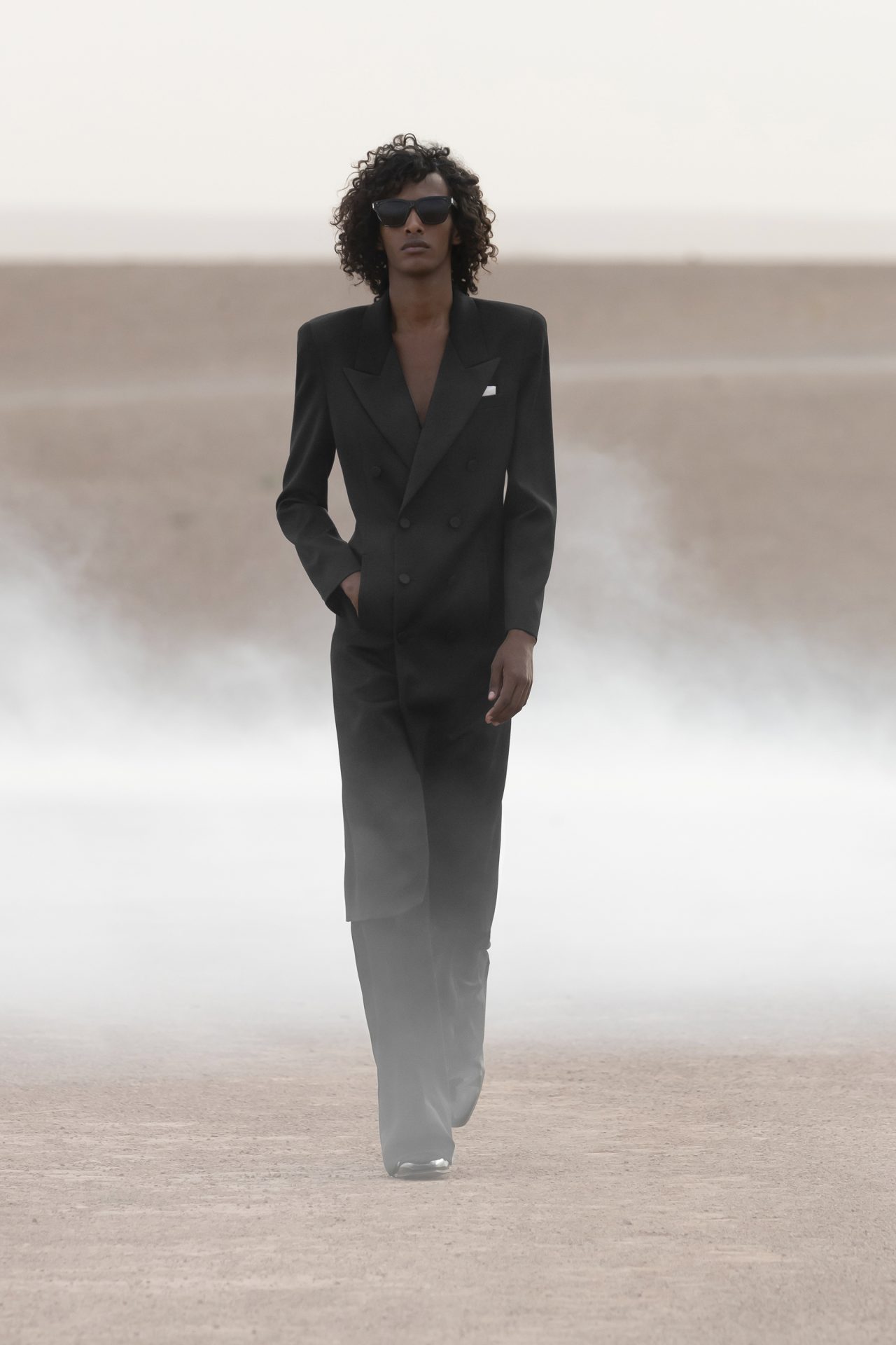1949年「シェルタリング・スカイ(極地の空)」にインスパイアされ、Anthony Vaccarello はロンドン在住のアーティストであり舞台デザイナーの Es Devlin (エス・デヴリン) とコラボレーションし、アガファイ砂漠の真ん中に荘厳なセットを考案。広大な乾いた未知の地に囲まれ、明るく発光する円形のオアシス。期待と神秘が隣り合わせ、まさに人生の魅惑的な複雑さを象徴し、モロッコの雄大な美しさを称賛した。