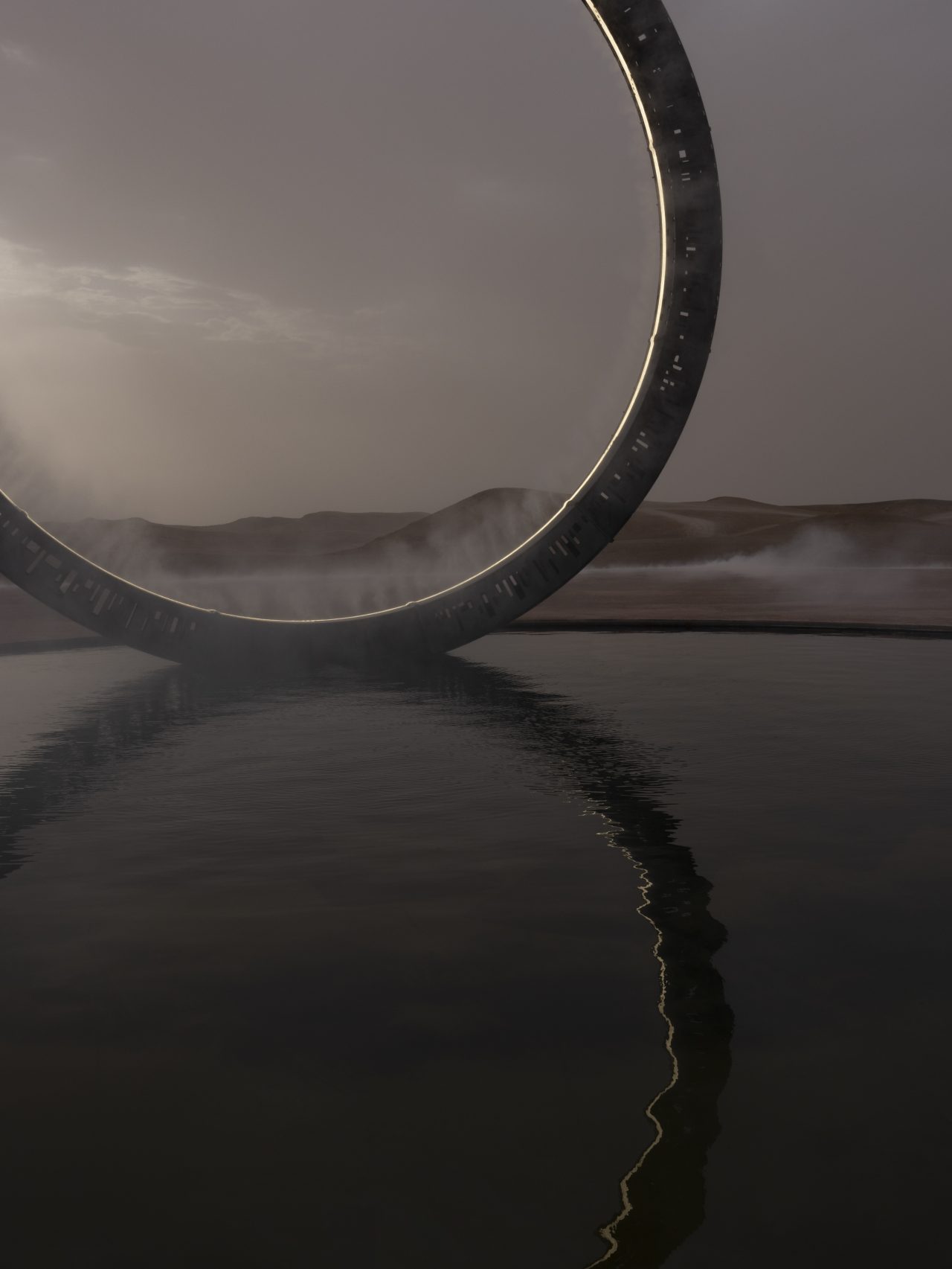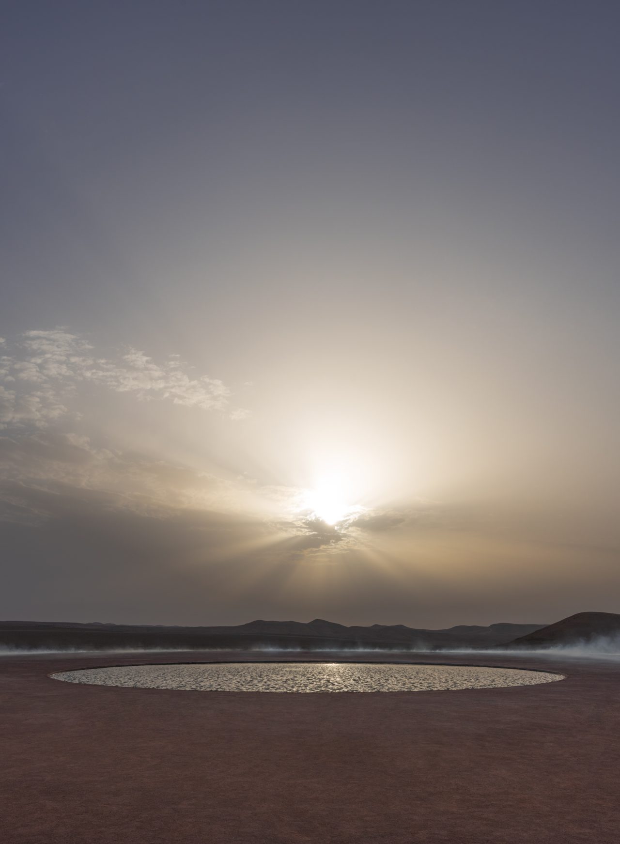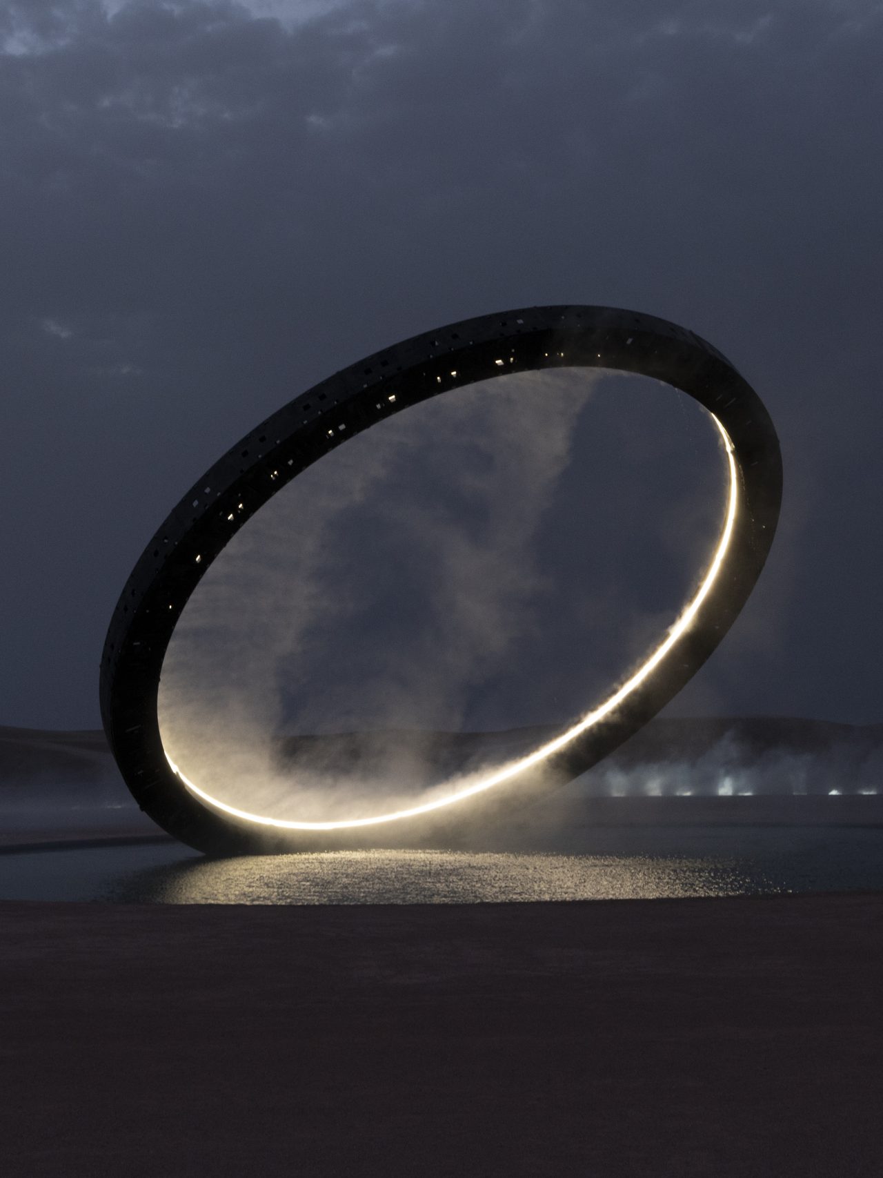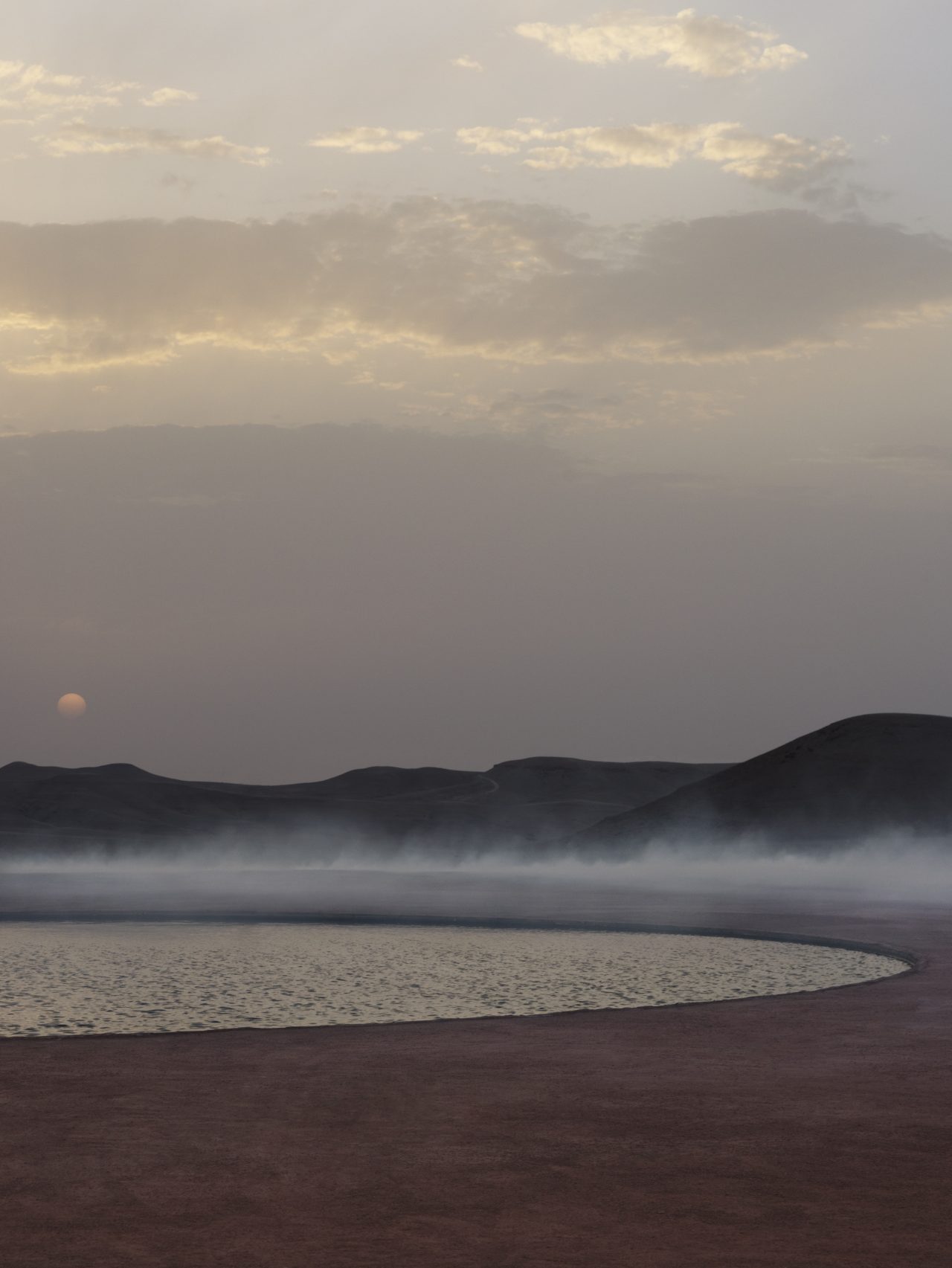 1949年「シェルタリング・スカイ(極地の空)」にインスパイアされ、Anthony Vaccarello はロンドン在住のアーティストであり舞台デザイナーの Es Devlin (エス・デヴリン) とコラボレーションし、アガファイ砂漠の真ん中に荘厳なセットを考案。広大な乾いた未知の地に囲まれ、明るく発光する円形のオアシス。期待と神秘が隣り合わせ、まさに人生の魅惑的な複雑さを象徴し、モロッコの雄大な美しさを称賛した。