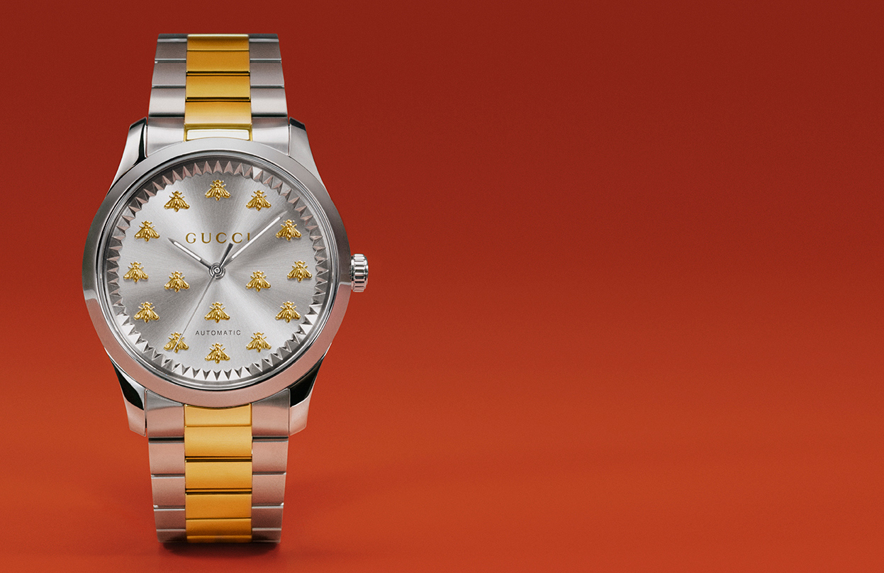 植物の世界にインスピレーションを得た「グッチ フローラ」ファインジュエリーコレクションや、ブランドを象徴するモチーフを施した「インターロッキングG」からは、18Kイエローゴールドのネックレス、ブレスレット、ピアス、リングが新たに登場。ルビーのバックを背景に輝くのは、ビー(ハチ)をモチーフに取り入れたコレクション「G-タイムレス」の新作ウォッチ。15匹のビー(ハチ)を配したサンブラッシュダイアルに、ステンレススチールと18Kイエローゴールドのバイカラーブレスレットを組み合わせ、32mmクォーツ式と38mmオートマティック式で展開される。モデルは往年のハリウッドのグラマラスな魅力を再解釈した「Gucci Love Parade」コレクションのドレスやスーツを着用し、新作の洗練された美をさり気なく引き立てる。