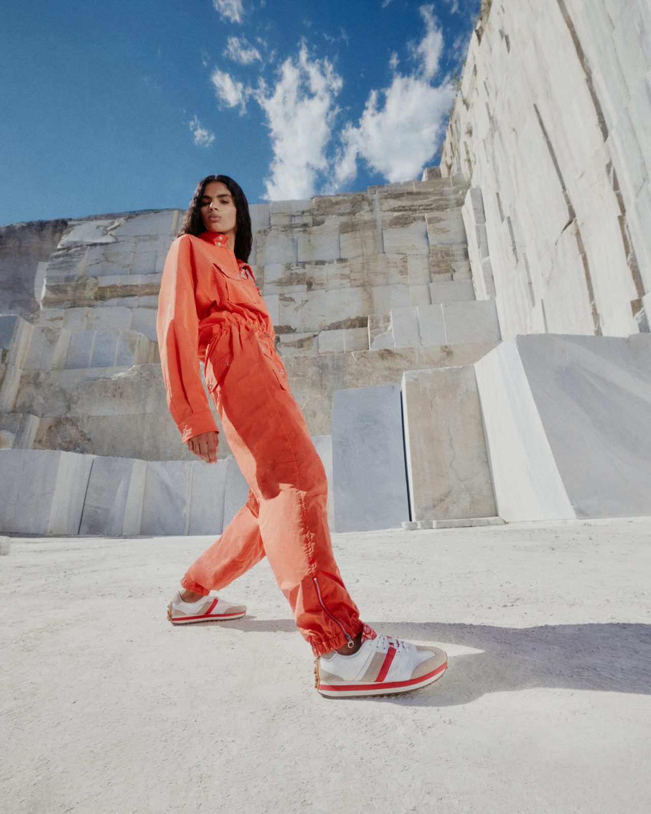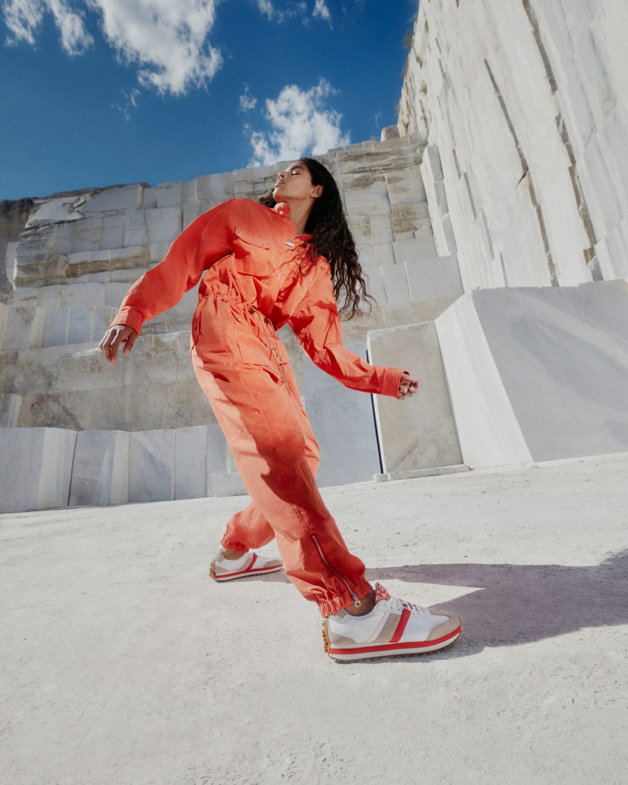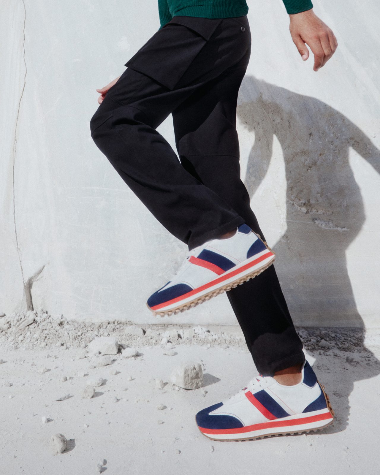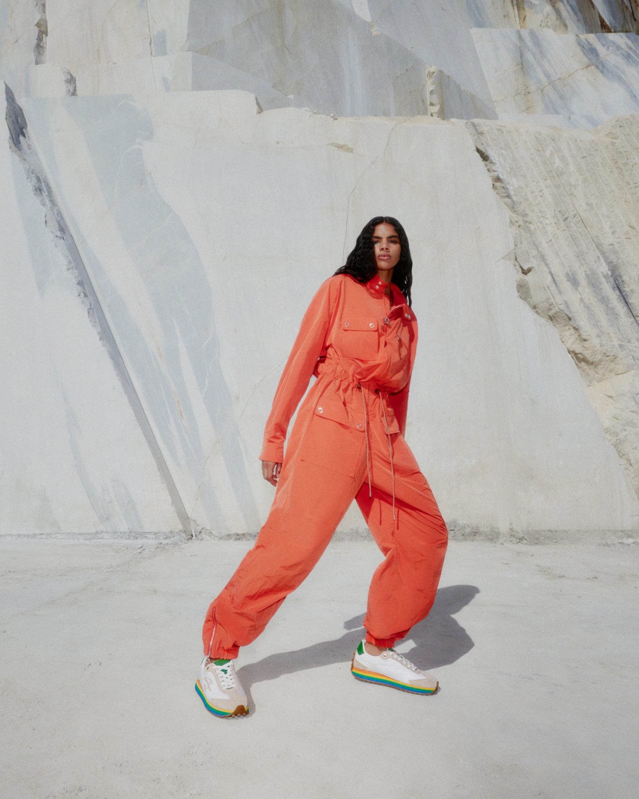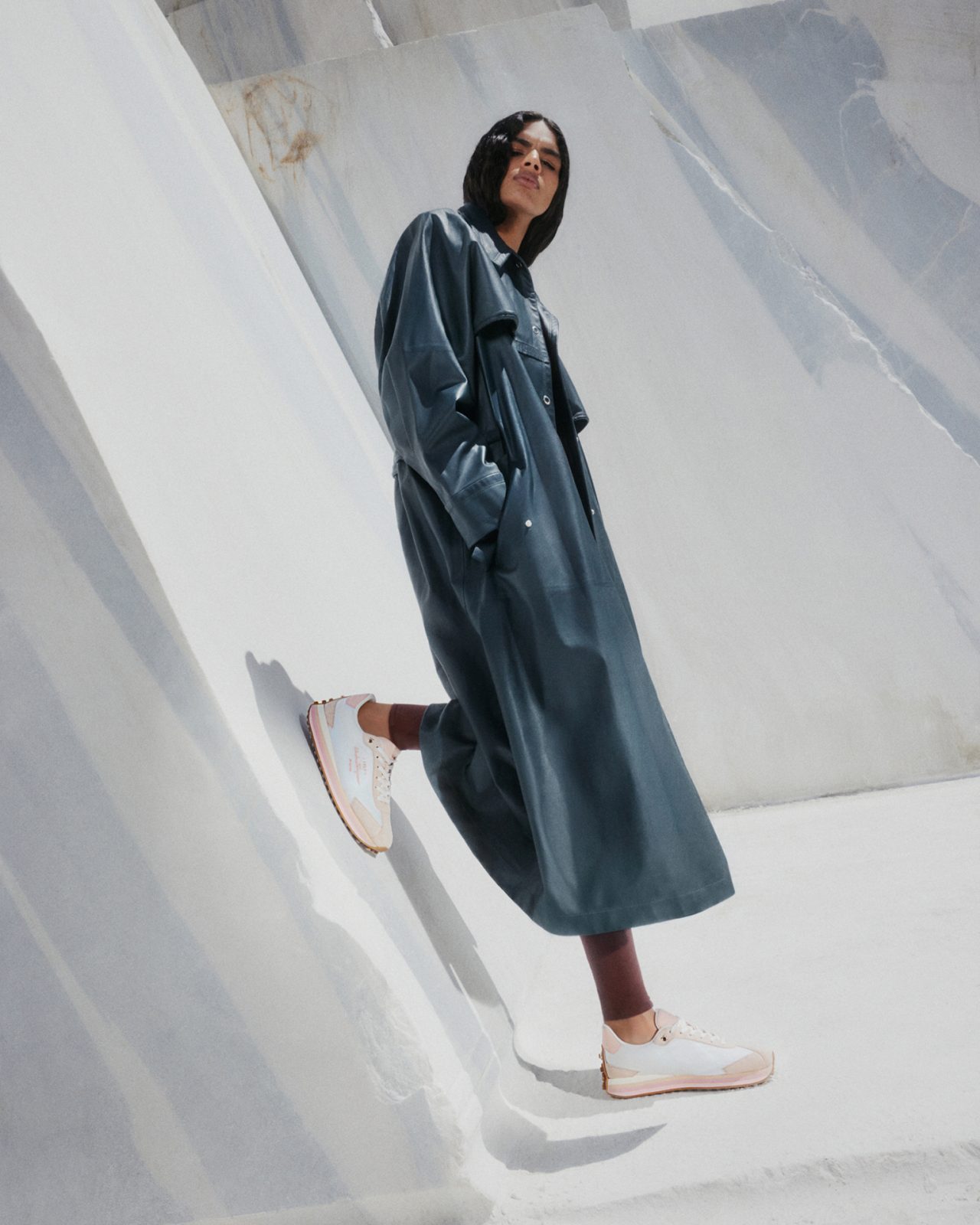 また、本コレクションは最新テクノロジーを積極的に取り入れ、廃棄された漁業網やナイロンを再利用した素材である「ECONYL®️」をはじめ環境負荷軽減を考慮した責任のある素材を採用。スエードには製品プロダクションにおいて排出される皮革スクラップを使用し、CO2排出量を考慮するなど、地球環境に対して責任のある製品であることを目指して作られている。