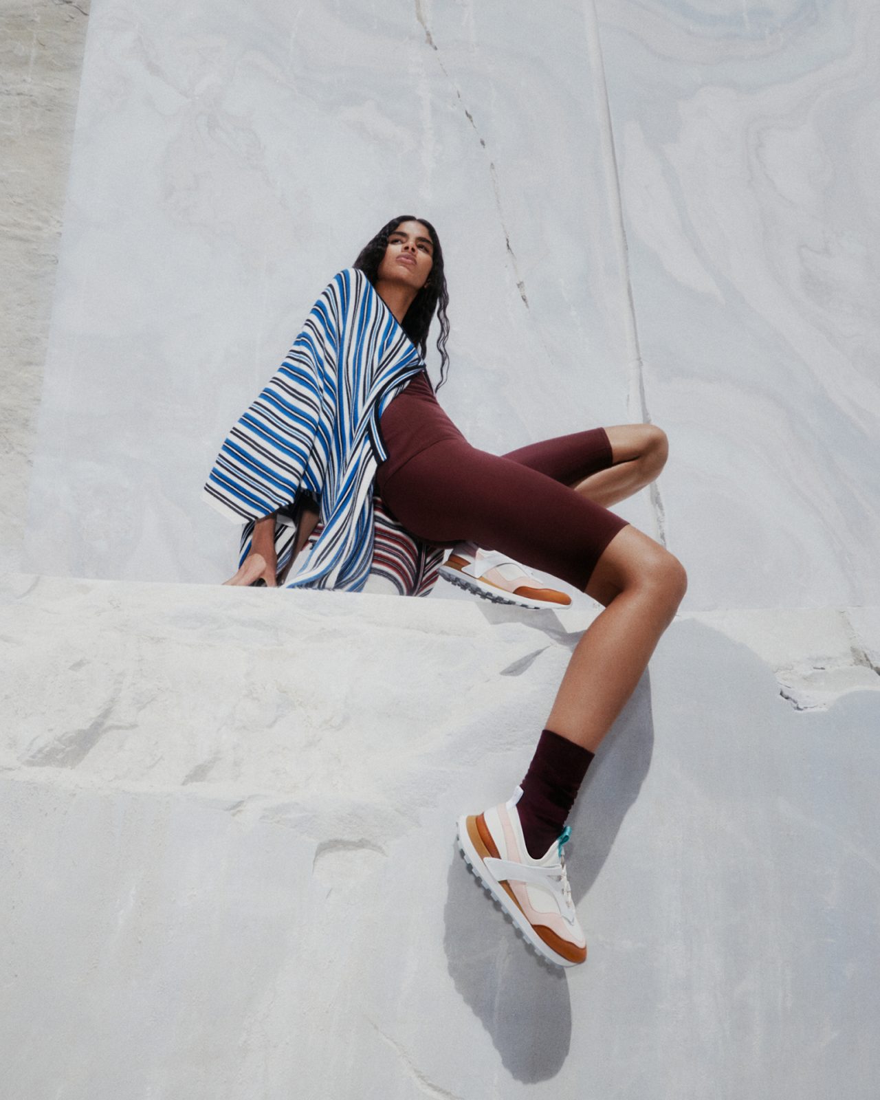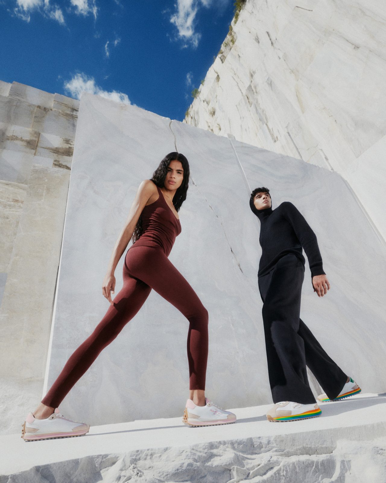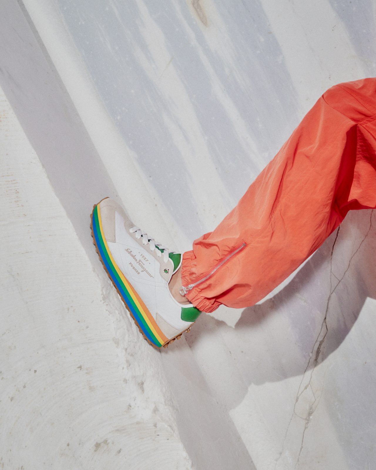 注目したいのは、Salvatore Ferragamo がかつてデザインした、レインボーソールのシューズからインスピレーションを受けたデザイン。ユニセックスで展開され、柔らかいピンクのバージョンもウィメンズのみお目見えする。